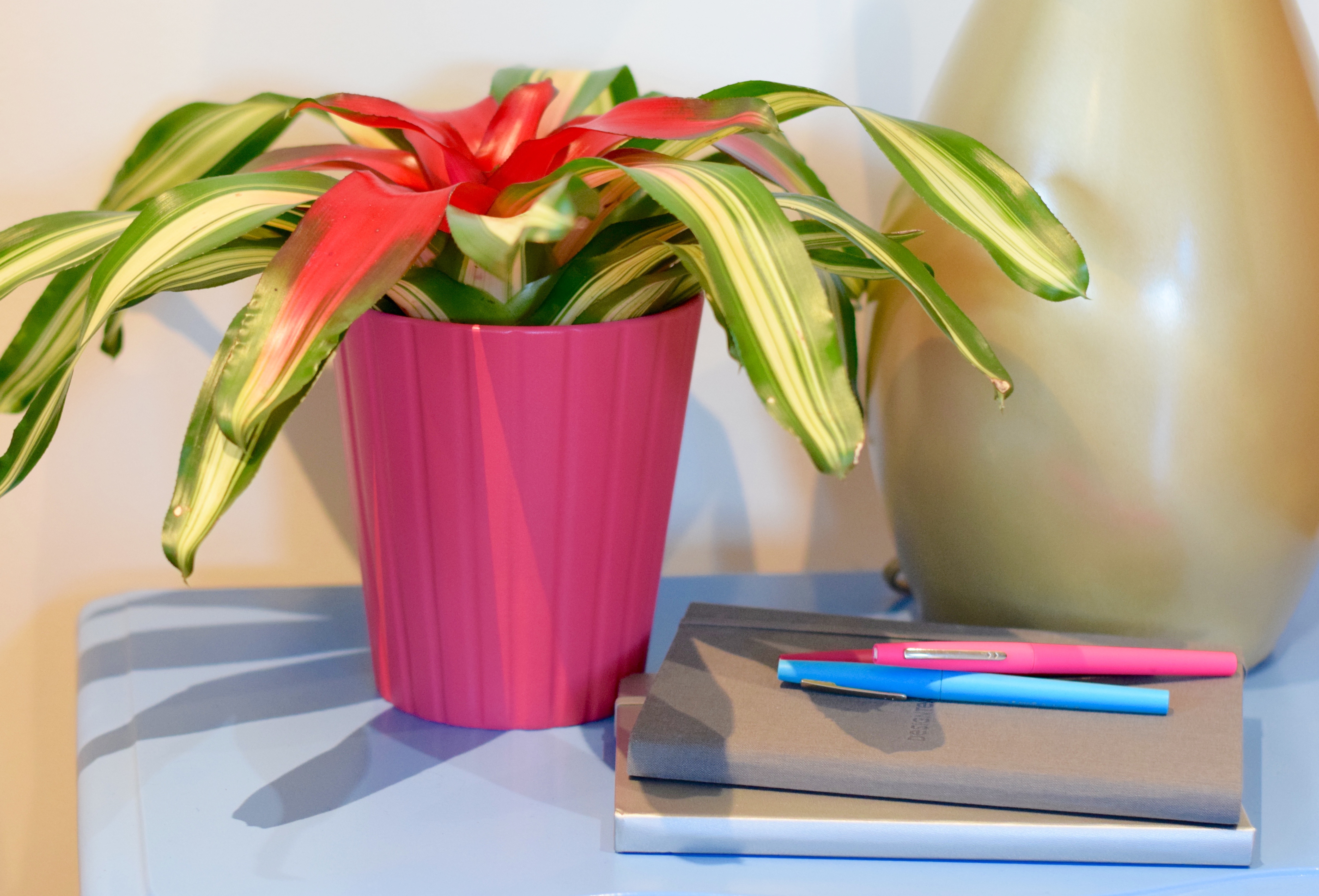 I popped in this bright pink plant, I thought the pink of the plant tied into the pink of the pot quite well! And look how the pinks brought out that awesome stripe-y green leaf! How amazing in nature? SO AMAZING!