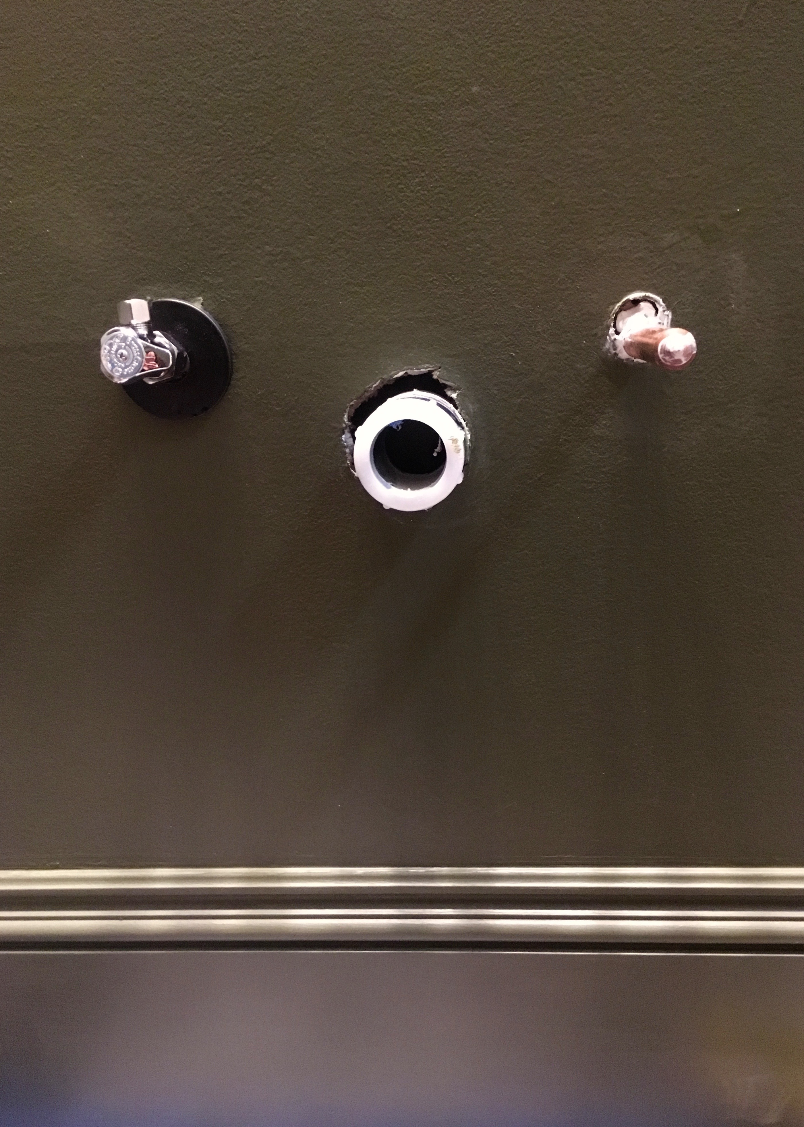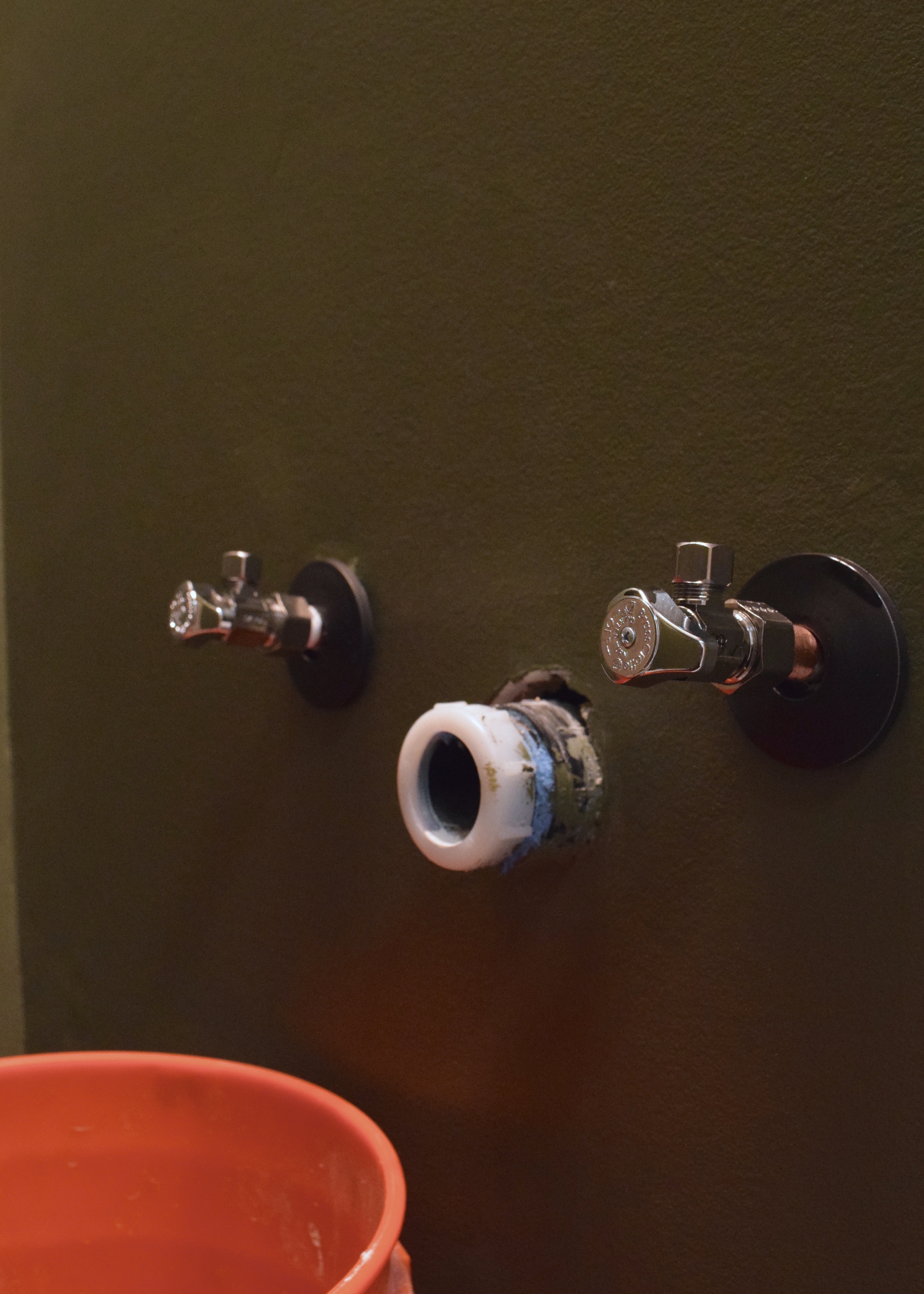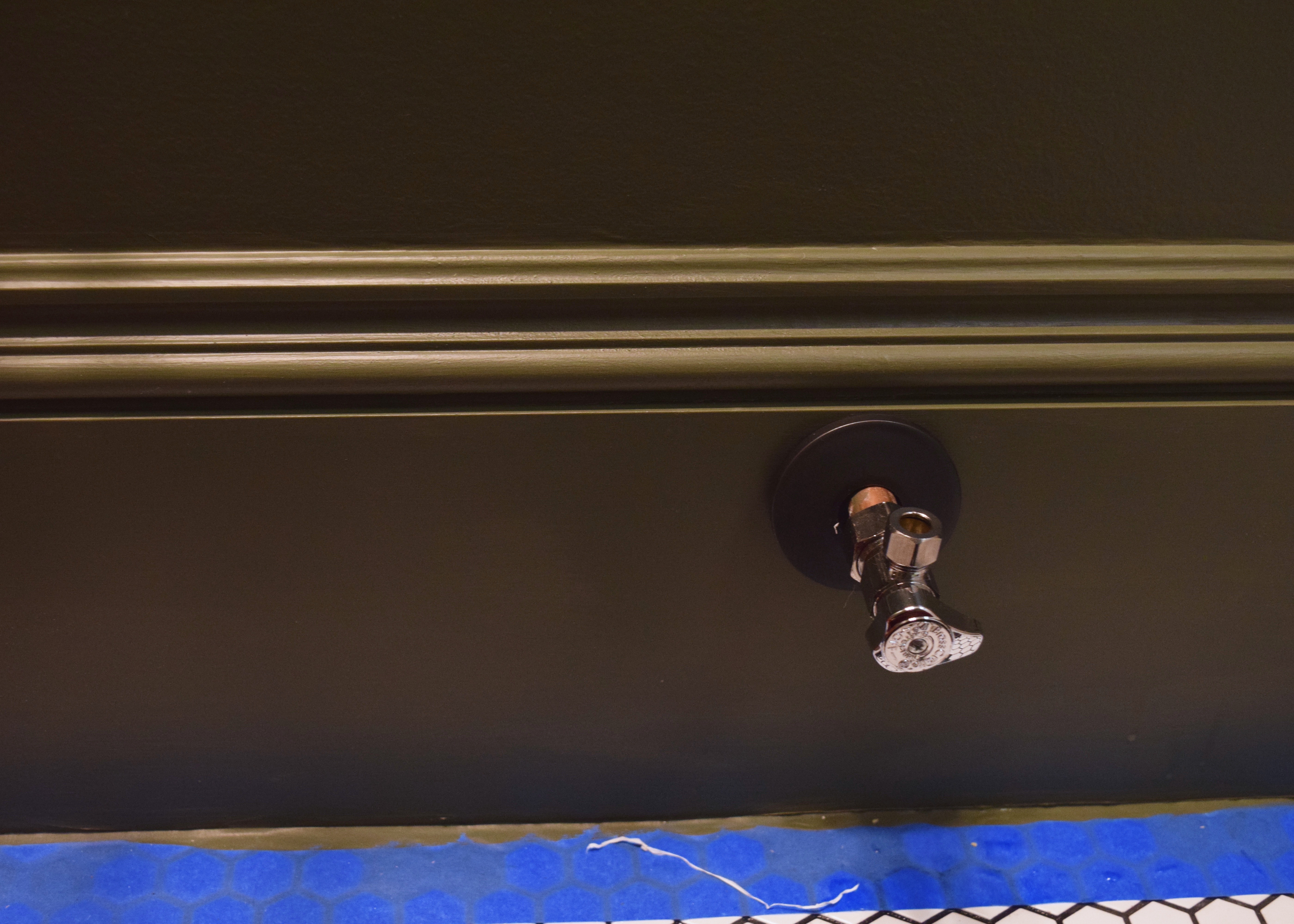 I bought cheap chrome pipe flanges and spray painted them with matte black Rustoleum enamel paint because I thought they’d blend in more with the dark green walls. I was too afraid to paint the actual shut off valves though because I thought it might affect their performance.
