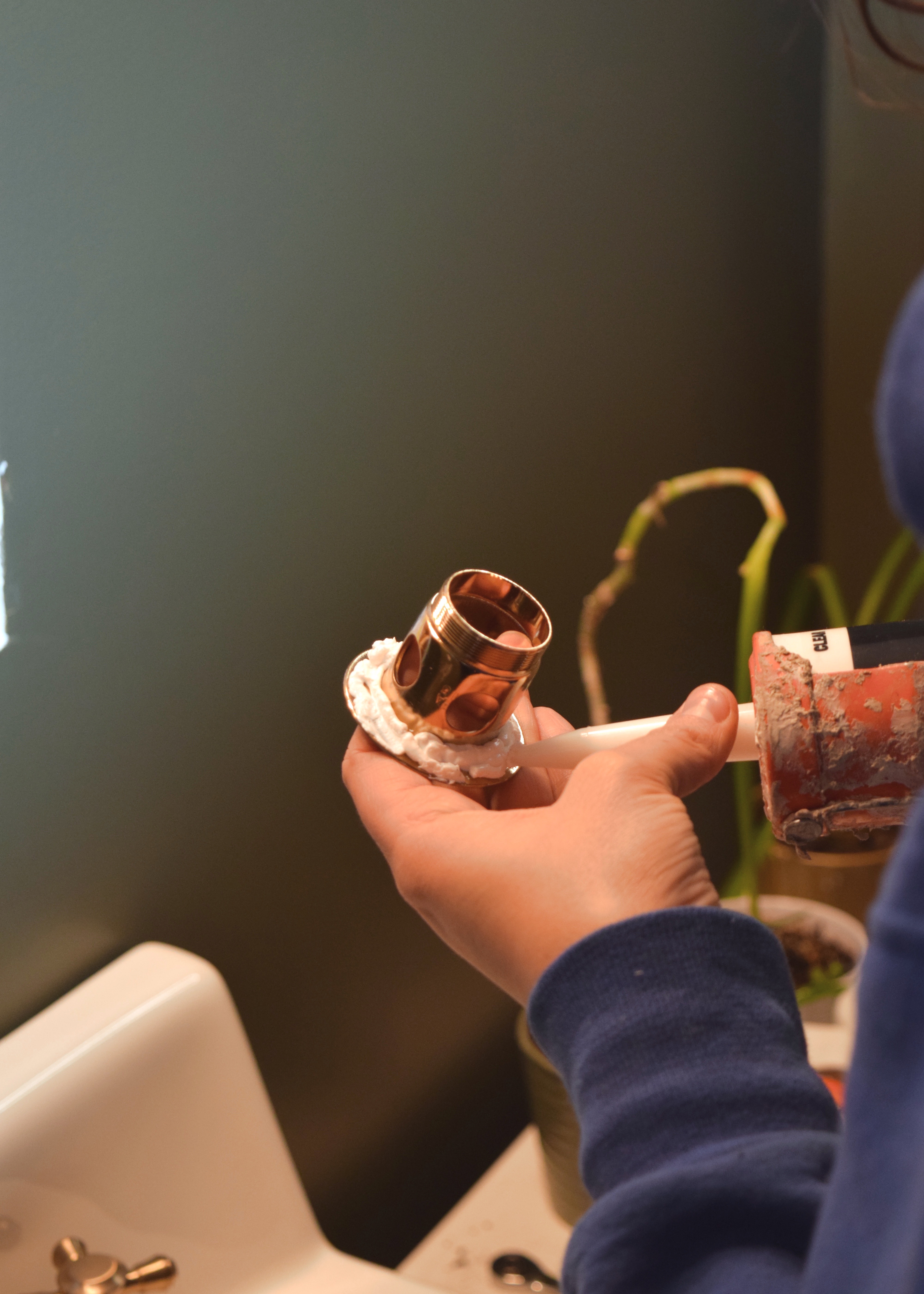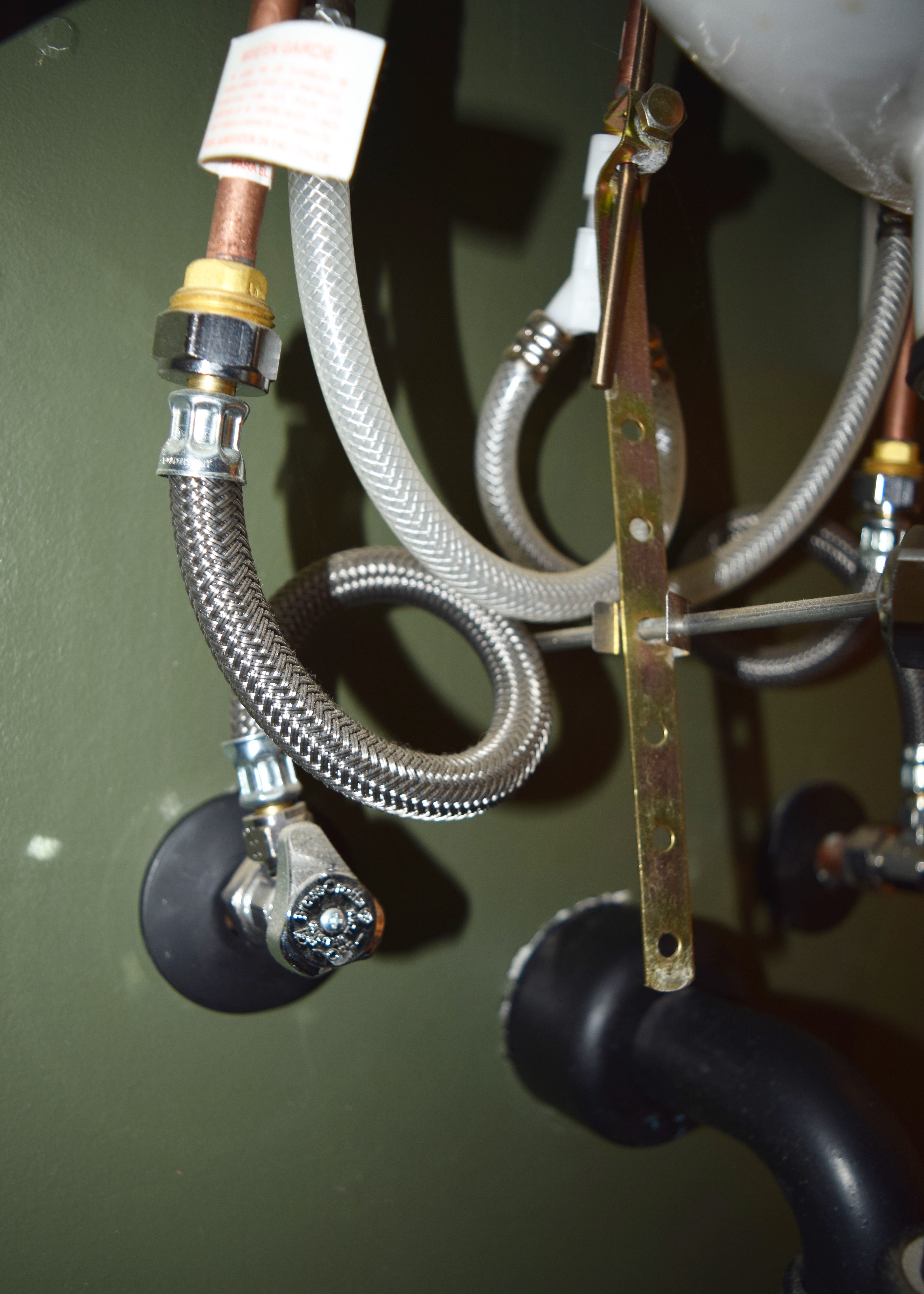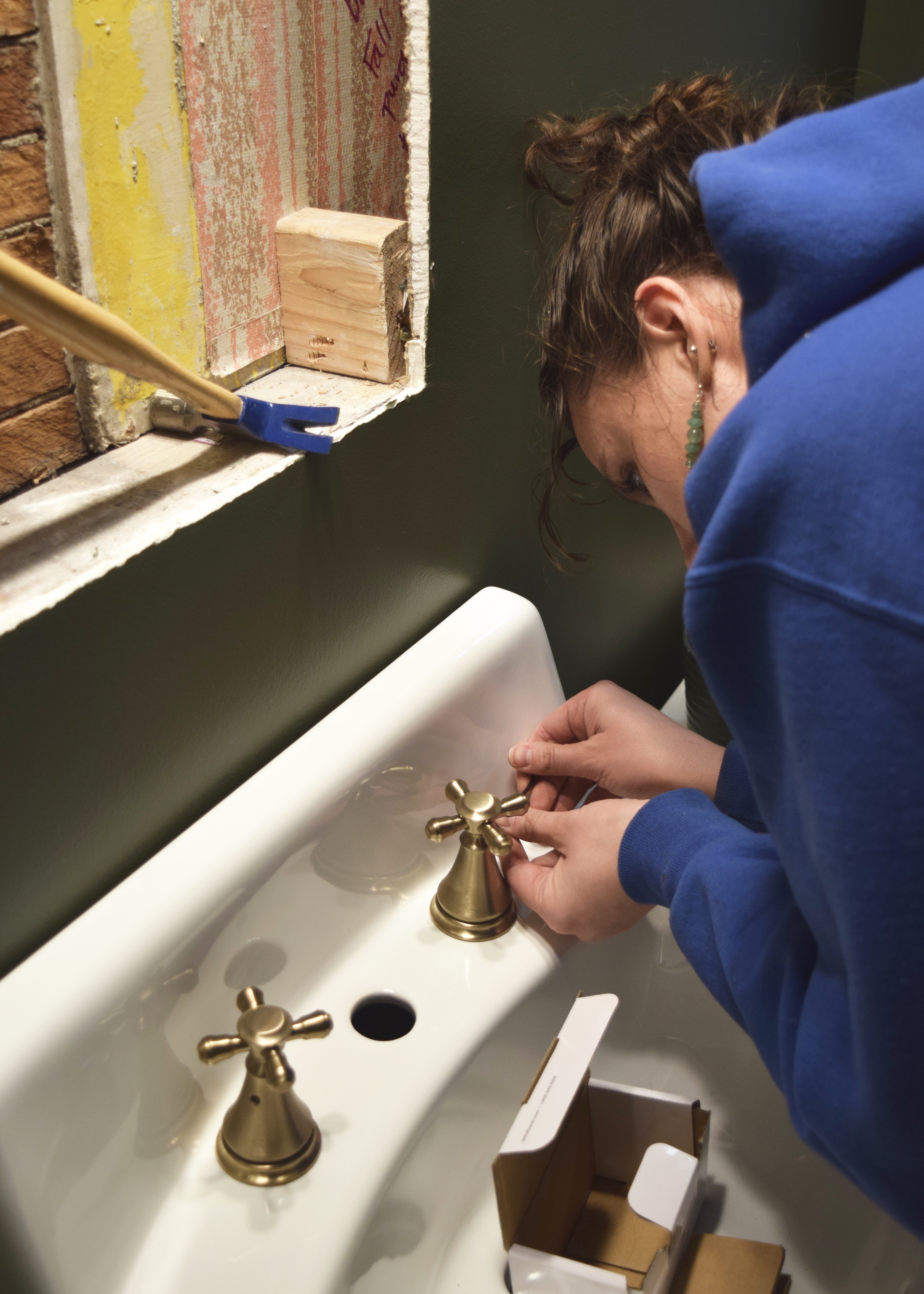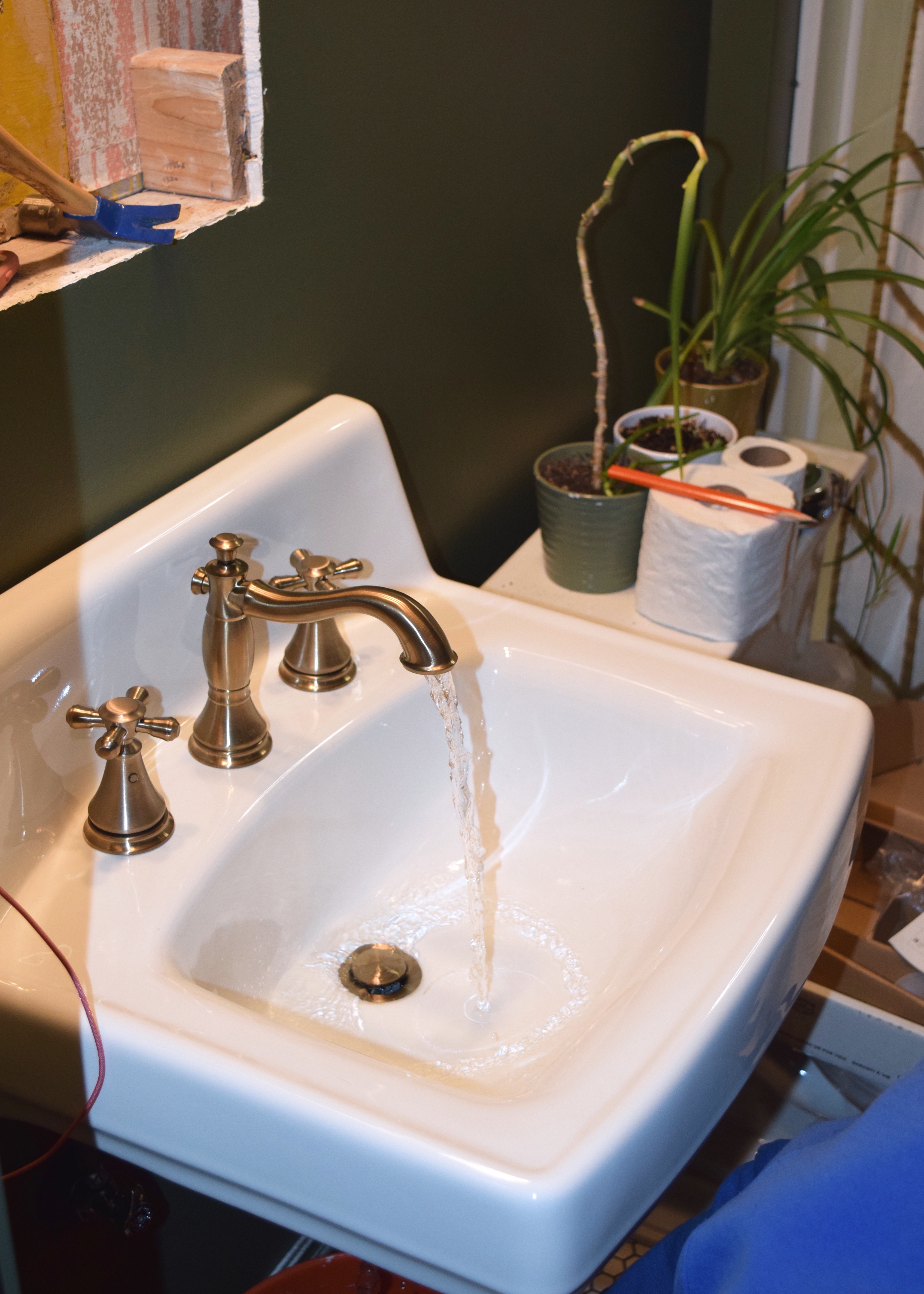 Then it was time to see how thing were working! I hooked up the water lines and removed the faucet’s aerator (the little bit that makes the water come out less splashy) to test the water lines. You want to remove the aerator first so any sediment in the new plumbing lines can be flushed out and not clog up the aerator.