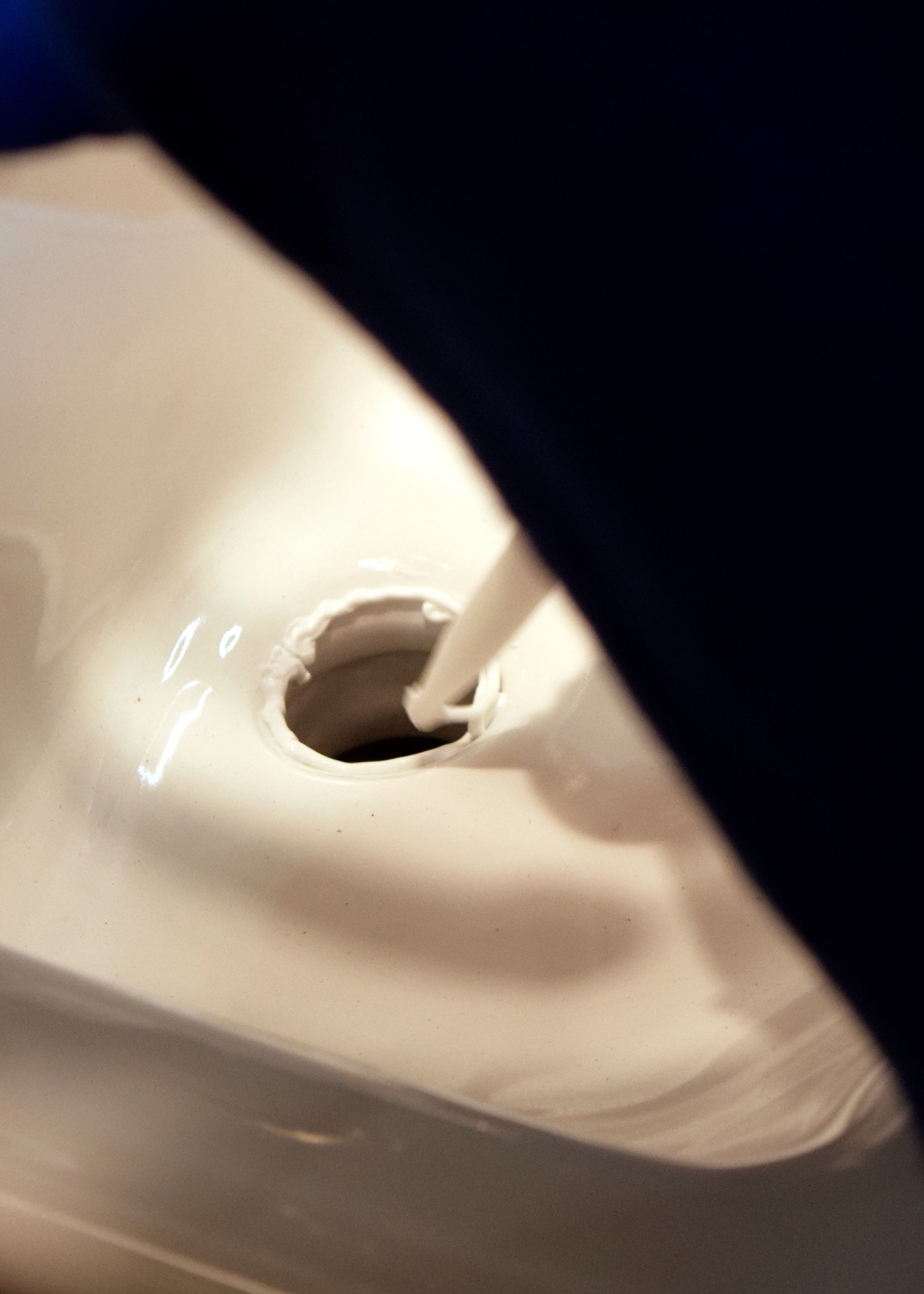 Once that was done, I placed the faucet on the sink and hooked up the handles to it. Then I moved on to the drain, placing a ring of caulking around the piece that sits into the sink to prevent water from leaking out.