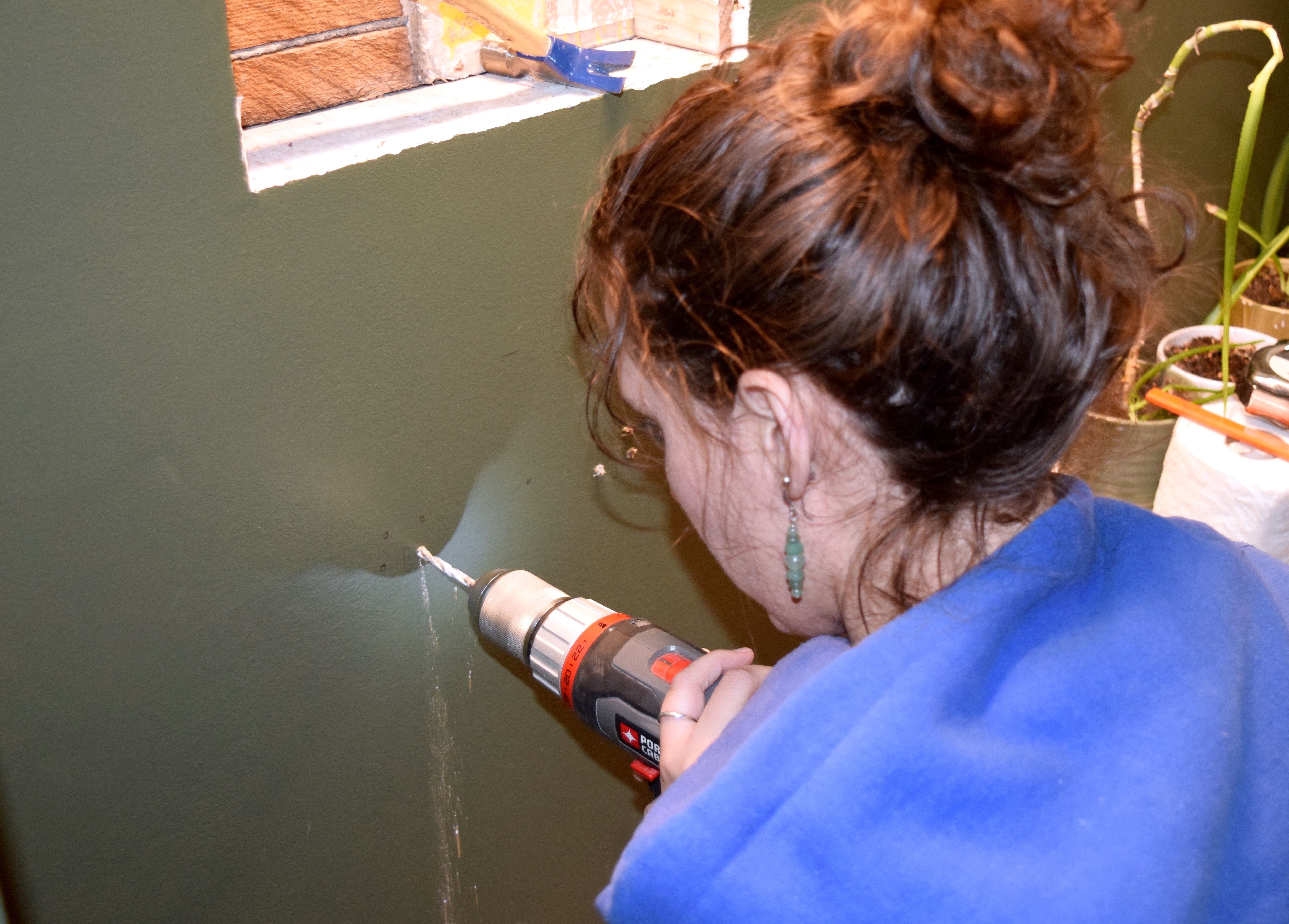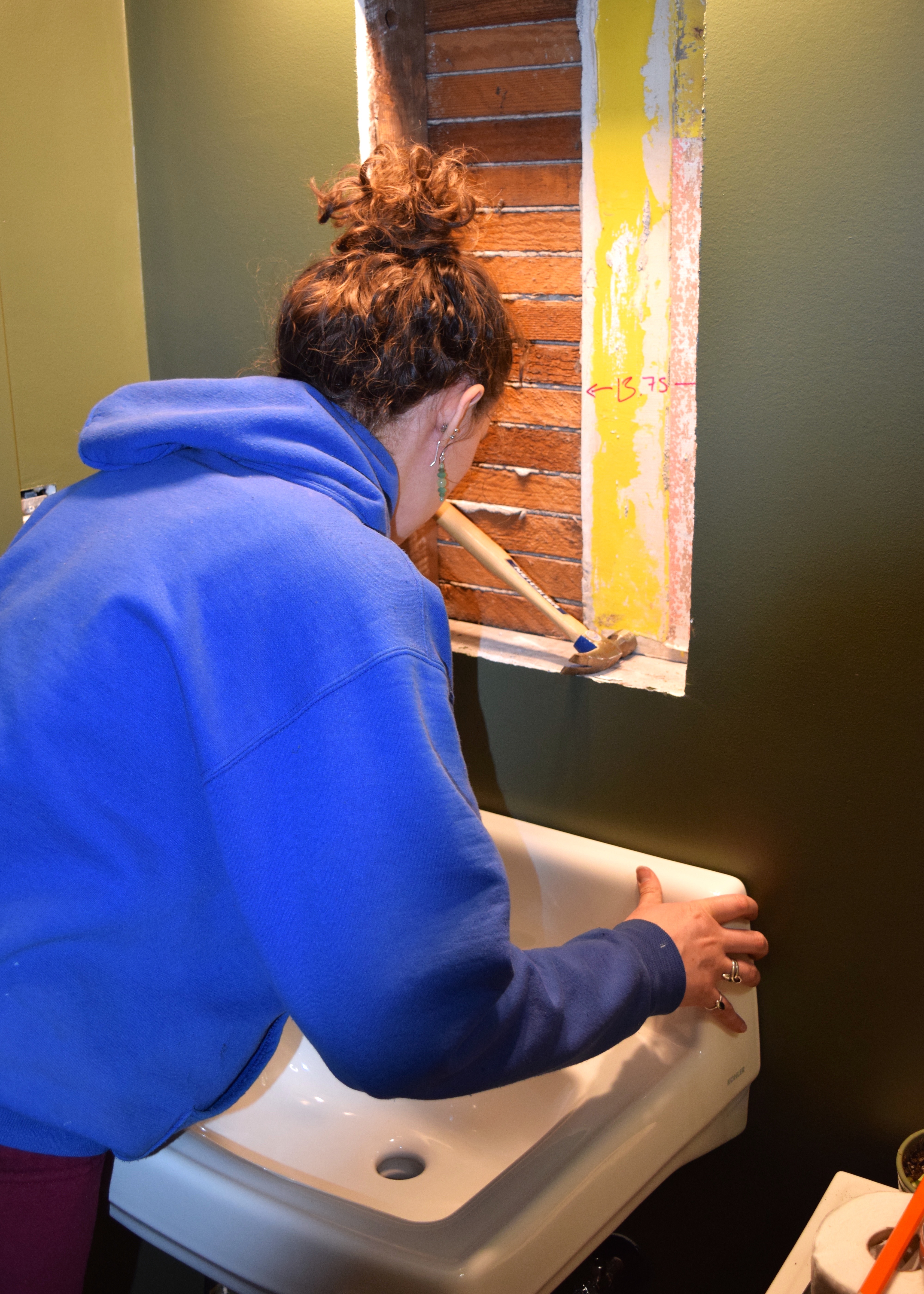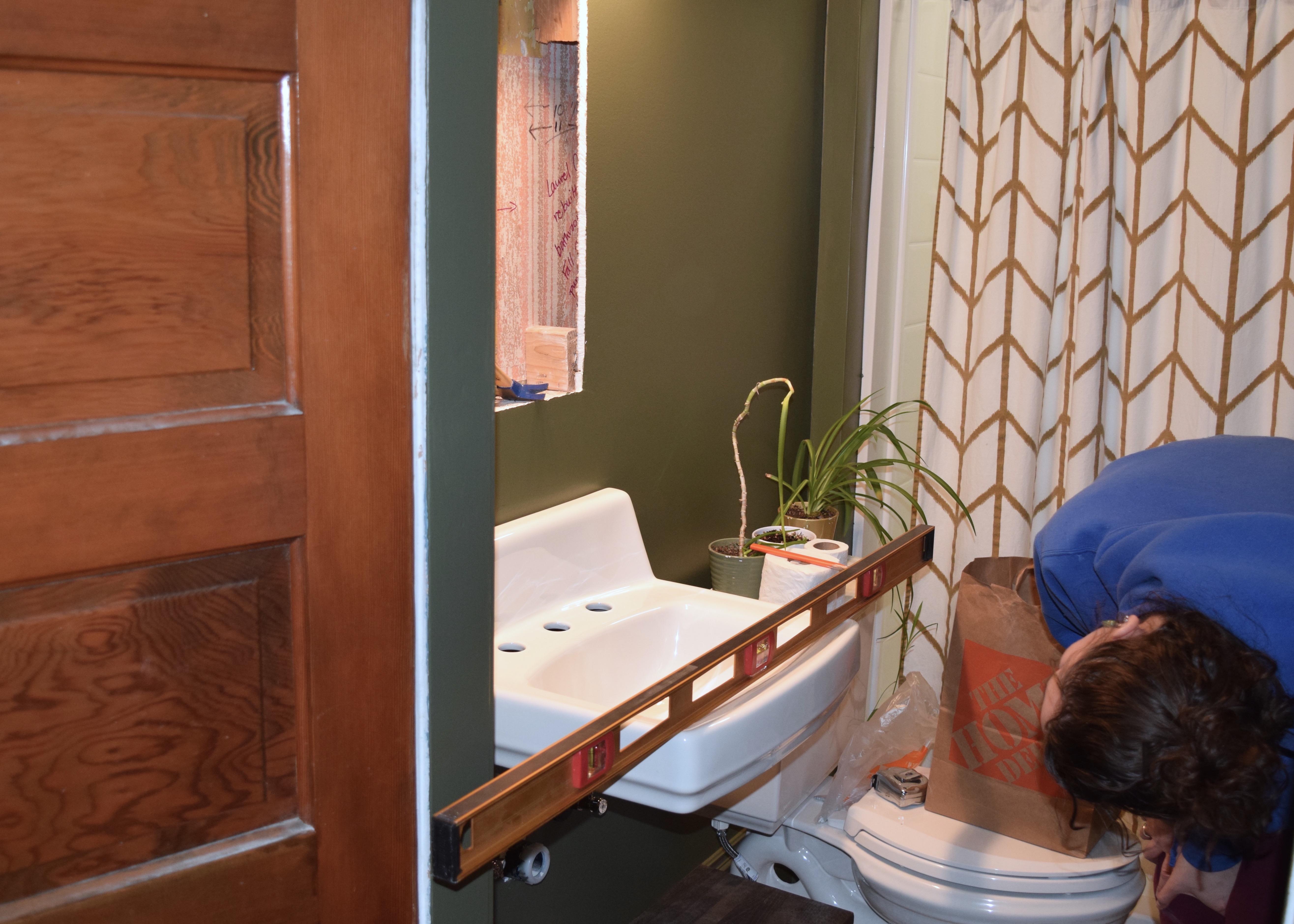 The sink arrived the week Bronwyn moved in. So technically she lived in my house without a bathroom sink for at least a couple of days. But really, we didn’t have a kitchen either, so the sinkless bathroom was a total luxury. When it finally was in hand, I didn’t waste a second getting it installed though! After measuring my locations I marked out where my brackets needed to go, checked for level, and predrilled holes for the bracket bolts into the plywood backing behind the drywall.