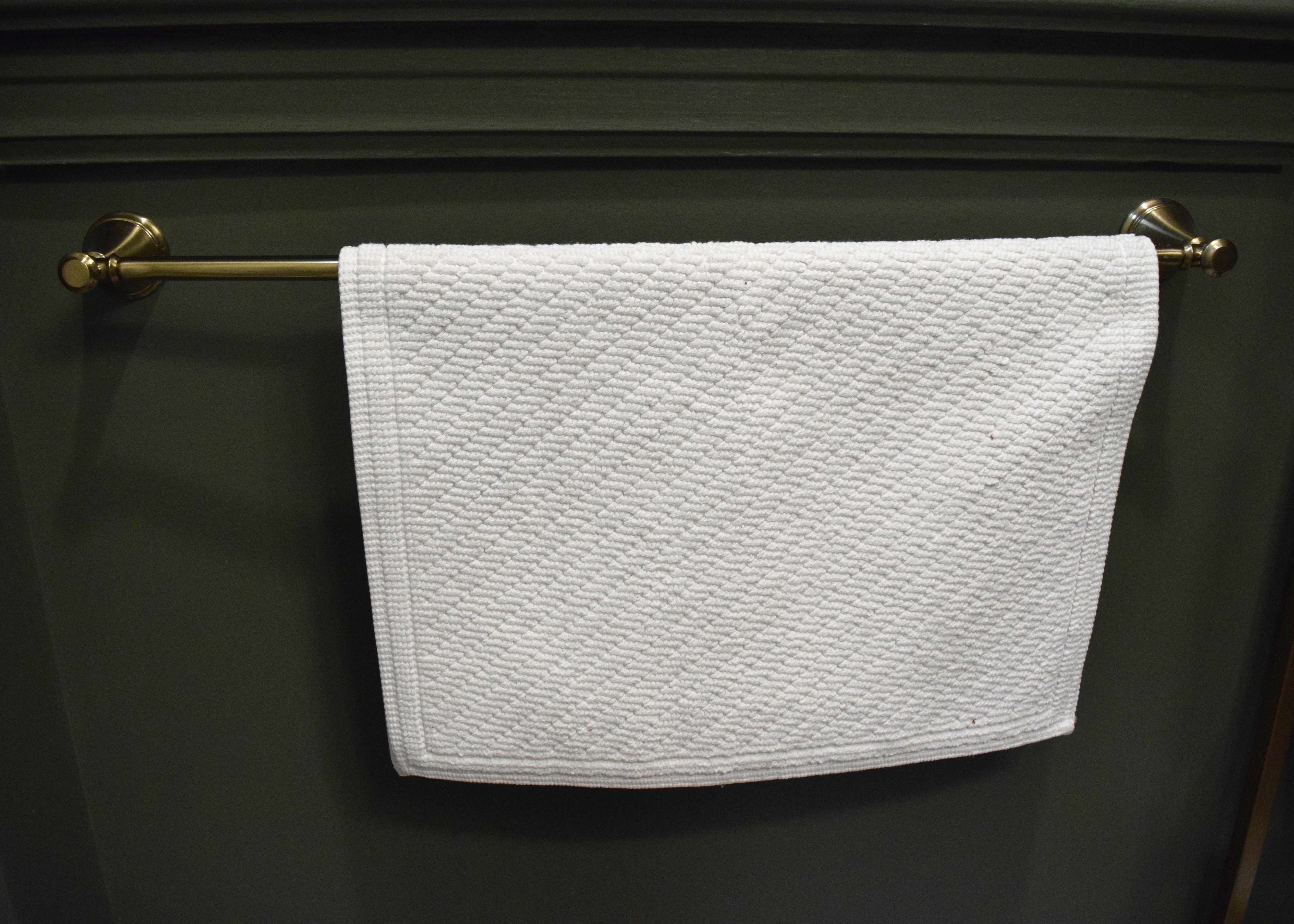 Installation was simple for the towel bar too since it came with a template! Tape template to wall, drill holes where marked, install brackets, slip towel bar over brackets, install set screw!