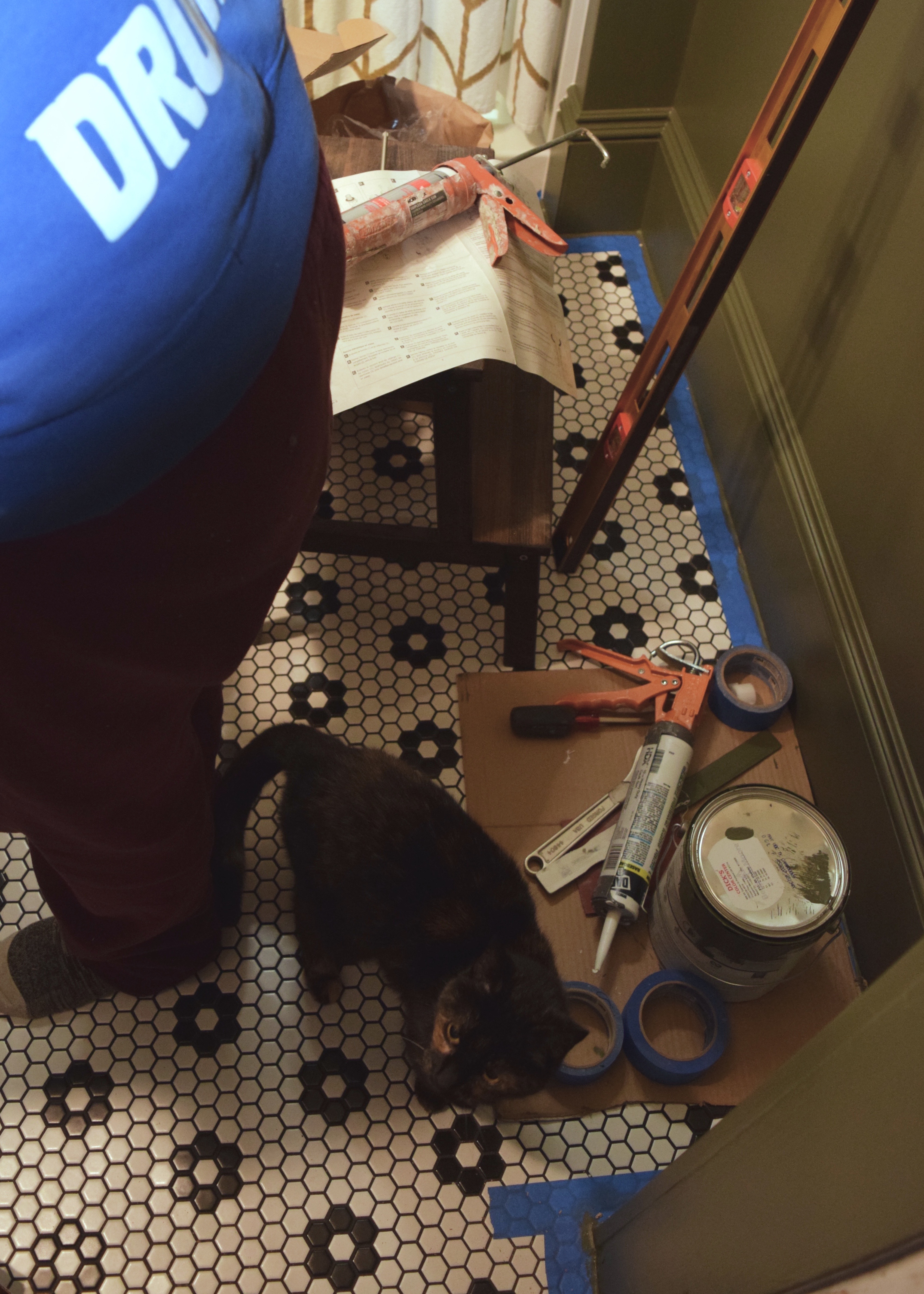 The brackets were easily secured to the wall with the bolts into the predrilled holes and just needed to be hand-tightened a wrench. Try to ignore the big empty space above where the medicine cabinet is supposed to go! Not sure why that hammer was balancing all precariously there either…
