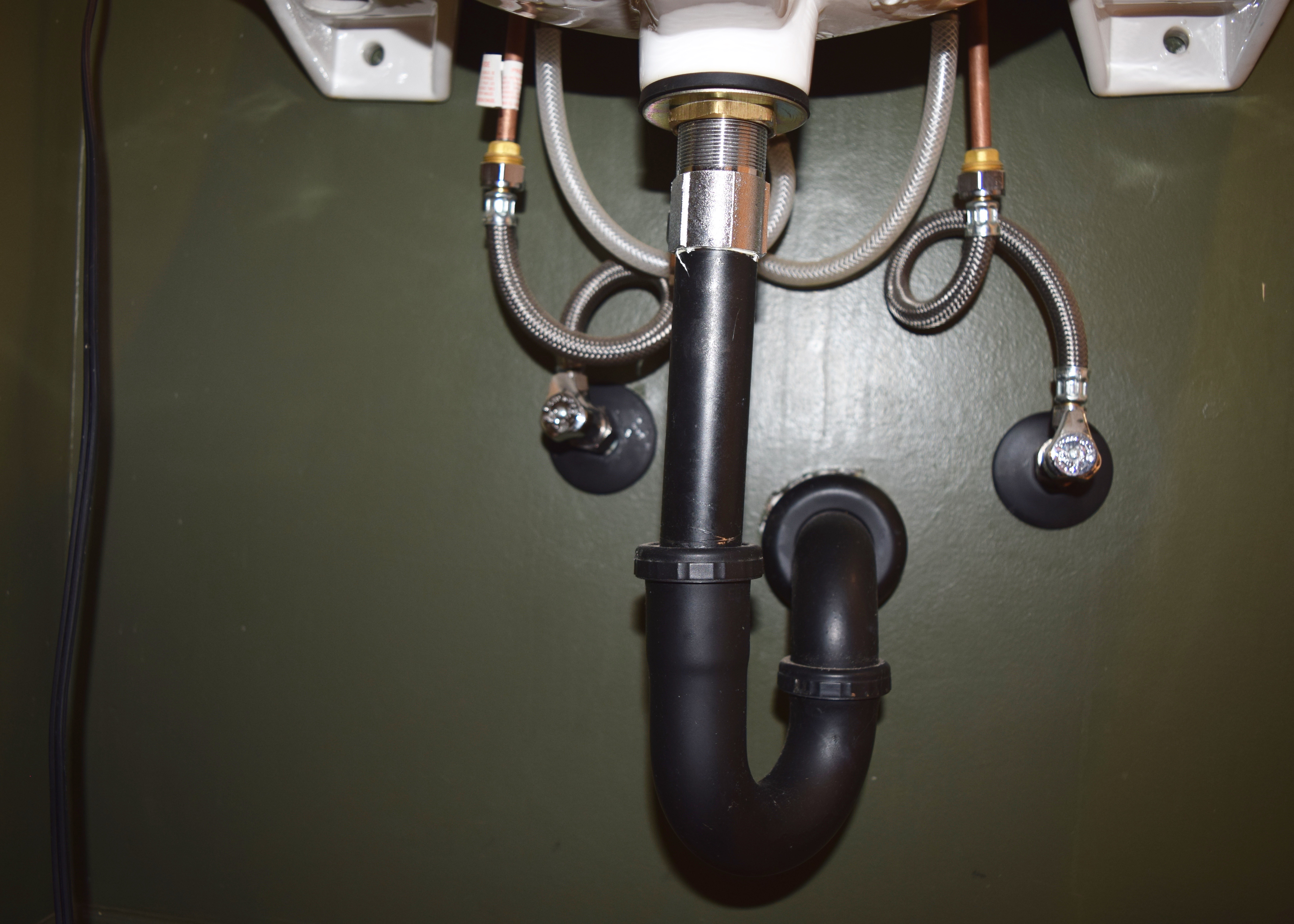 The P-trap came together easily. I bought a chrome metal P-trap kit and extension tube from Home Depot. It included everything I needed plus a nice little pictogram with instructions. I spray painted the plumbing parts matte black to match the water shut off valve flanges and cut the extension tube to the right length for my sink. Then it was just a matter of placing the included rubber gaskets between the different components and tightening the washer joints.