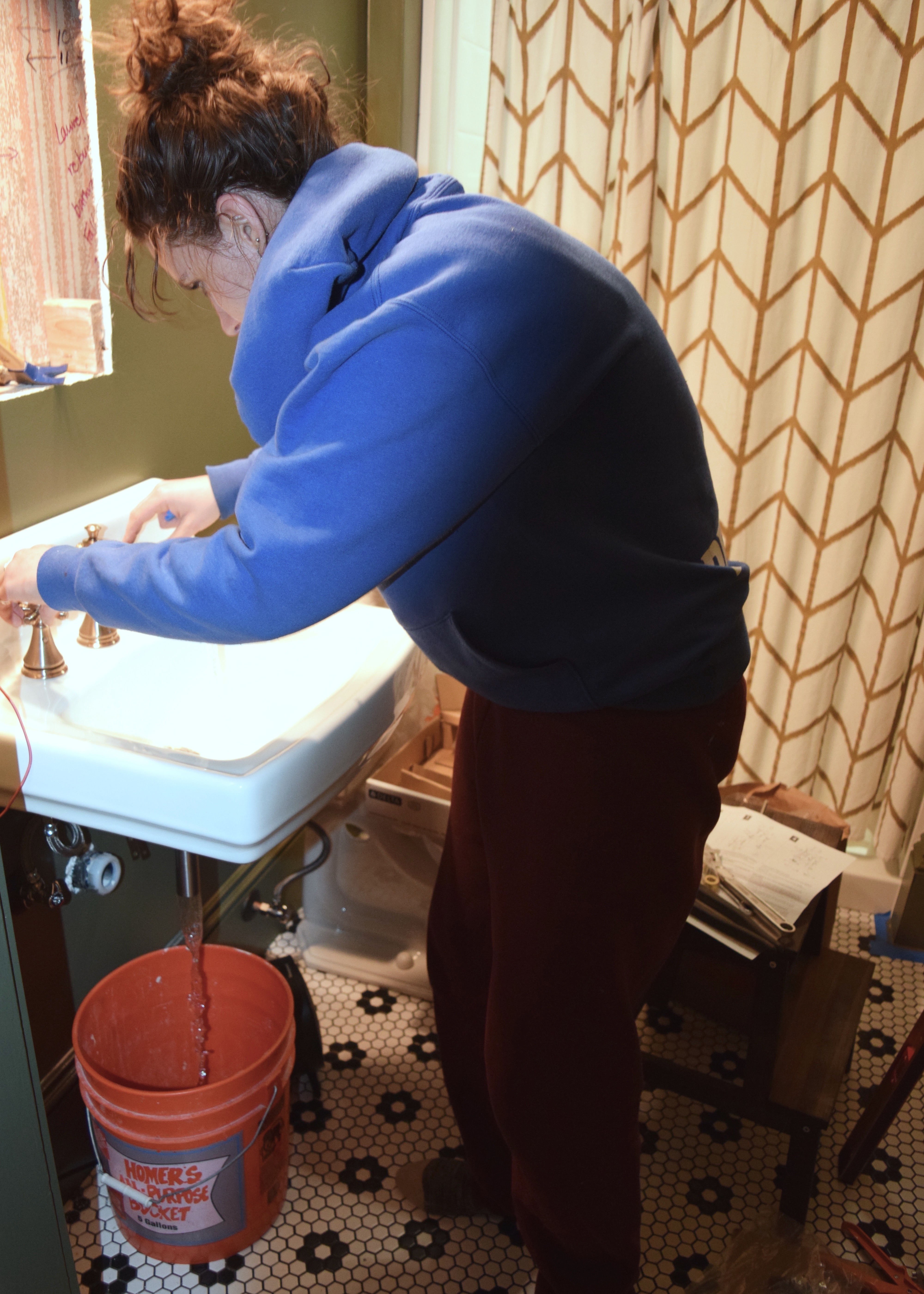 I hadn’t installed the P-trap yet, so I just stuck a bucket below the drain for the sink to drain into. I wanted to make sure this was working correctly before I put more things in my way down there!