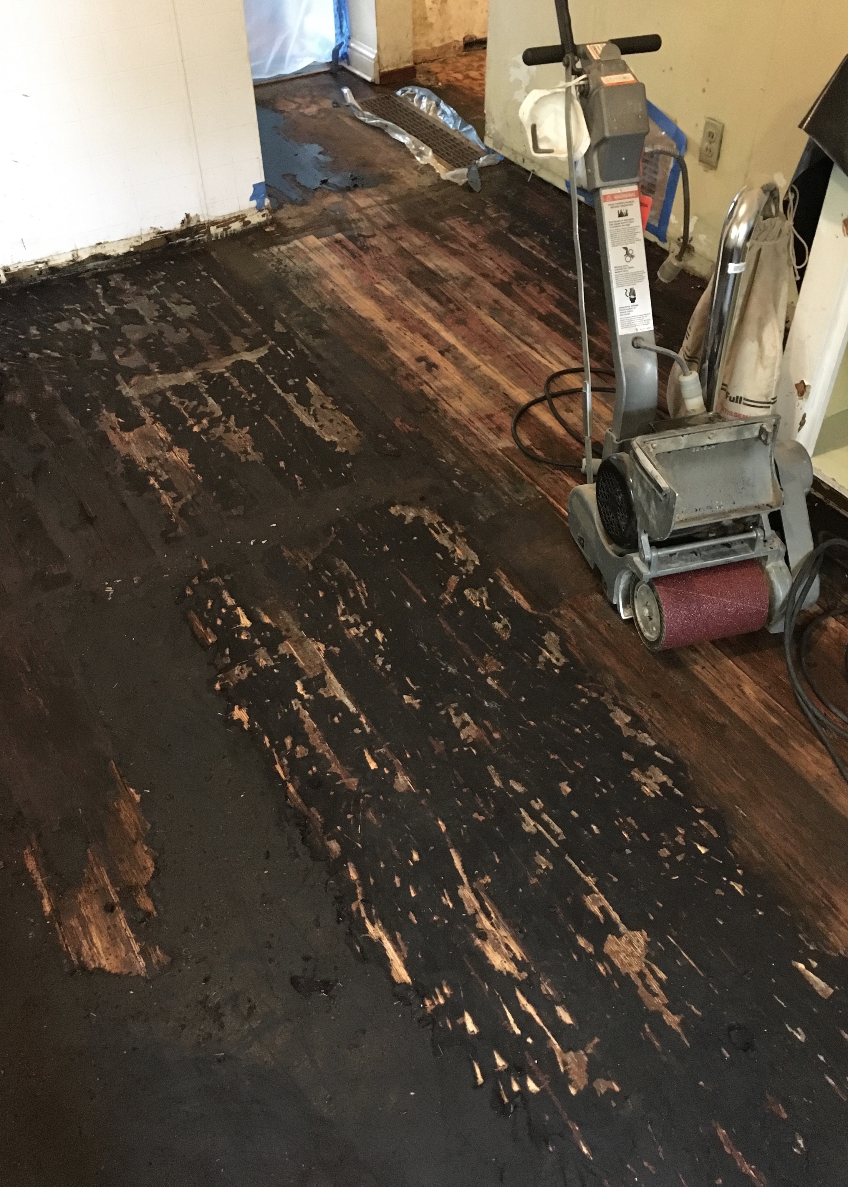 Until you looked at the floors that is. The space in front of the back door and bathroom still looked HORENDOUS covered in tar and the drum sander wasn’t really picking it up. It was almost like the tar in these areas was too hard to be sanded. The floors looked black like this when I began working on the bathroom in November 2017 and stopped working on the floors.