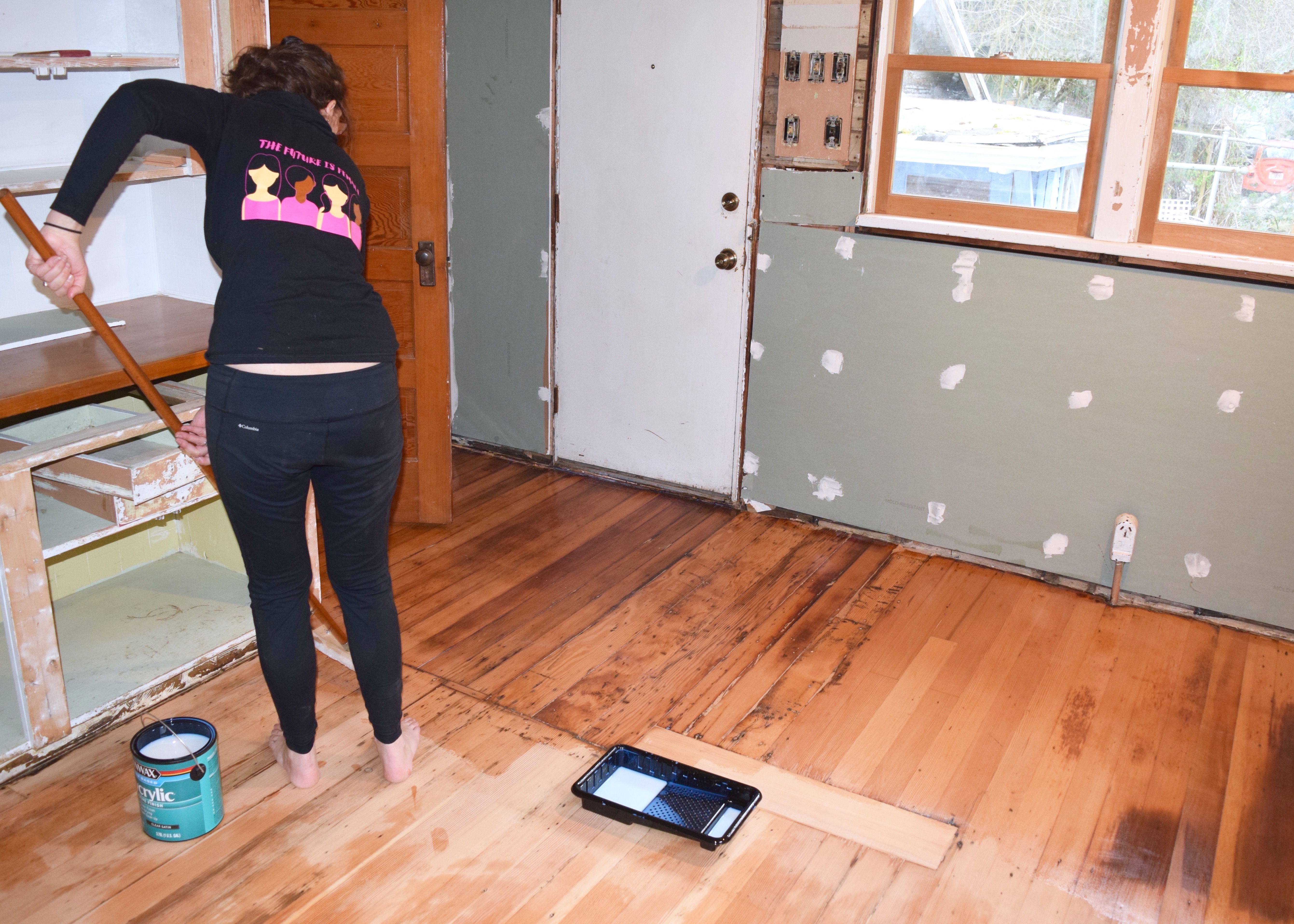 After all the vacuuming, Bronwyn and I got on our hands and knees with wet rags and wiped the floors down. We started at the back of the kitchen working our way across to the main part and into the living room before washing our cloths and doing it all over again. Then it was finally, finally, FINALLY time to start sealing the floors.