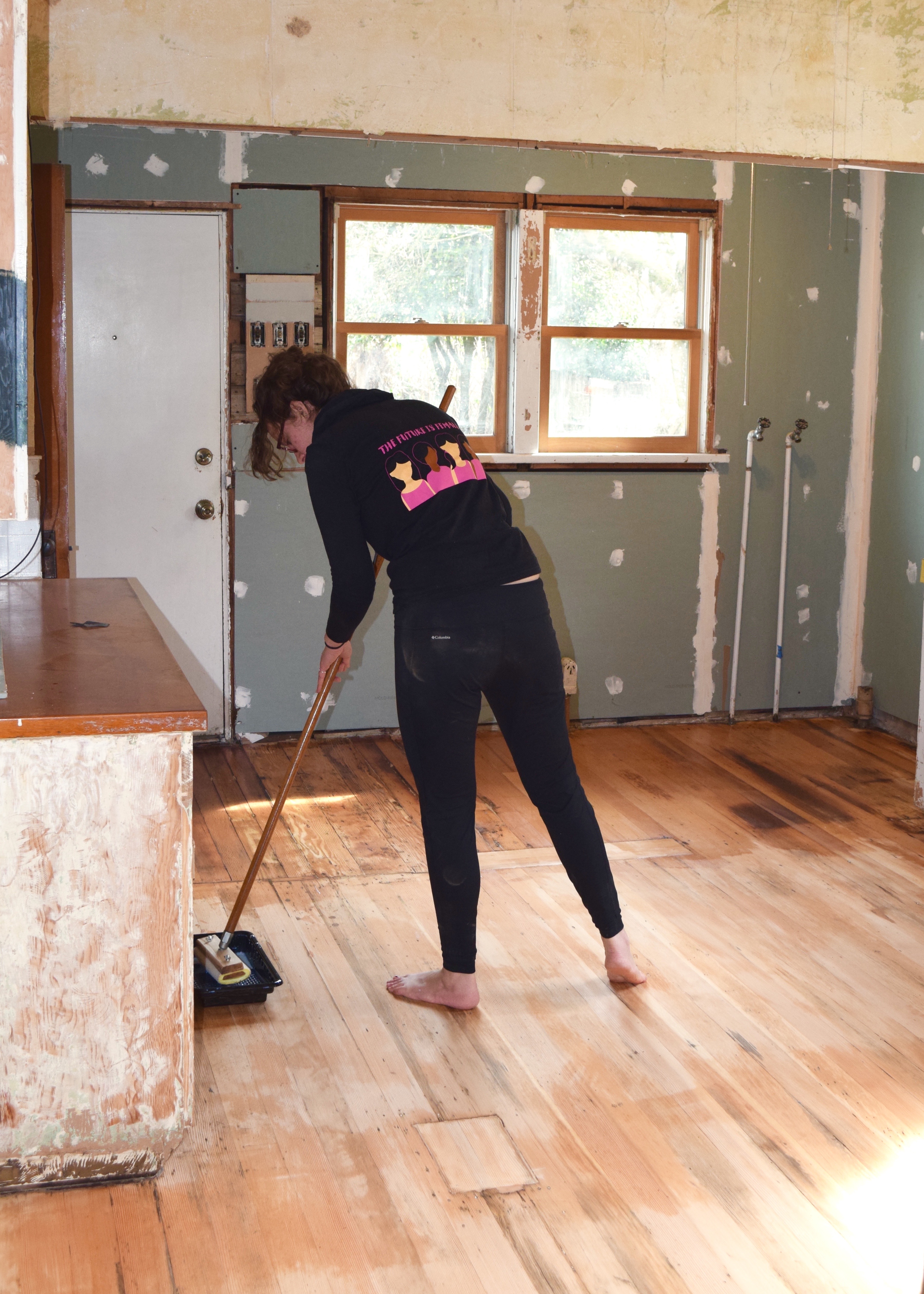 It took longer than three hours to fully dry though. So that kinda sucked. We were delayed and it wasn’t our fault! We hung out for a while longer trying not to think about going to the bathroom. Finally, once the sealer was no longer tacky, we sanded everything with 220 grit sanding screens (like you’d use on drywall) and wiped the floors with wet cloths again. We were ready to put on the first coat of sealer!