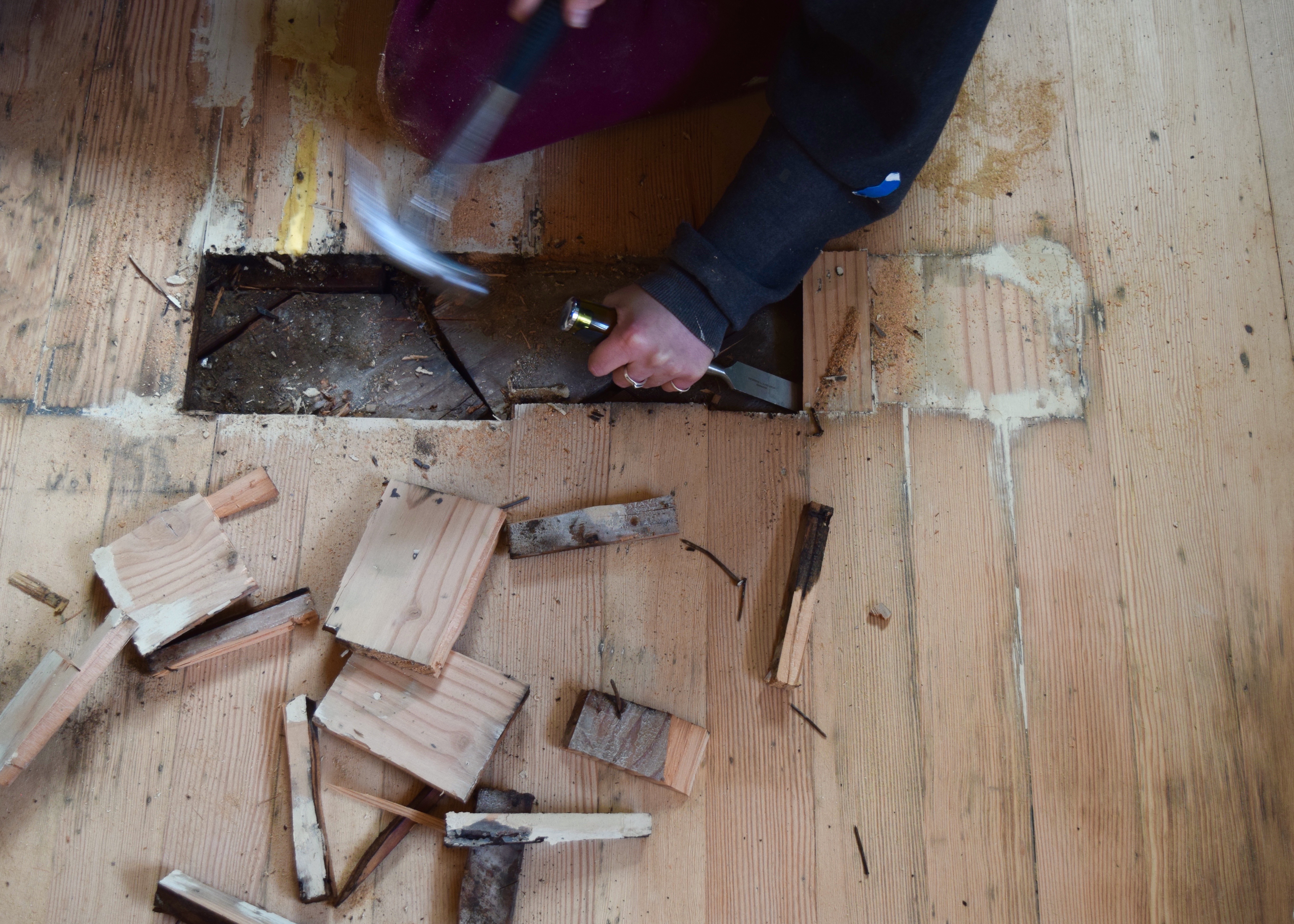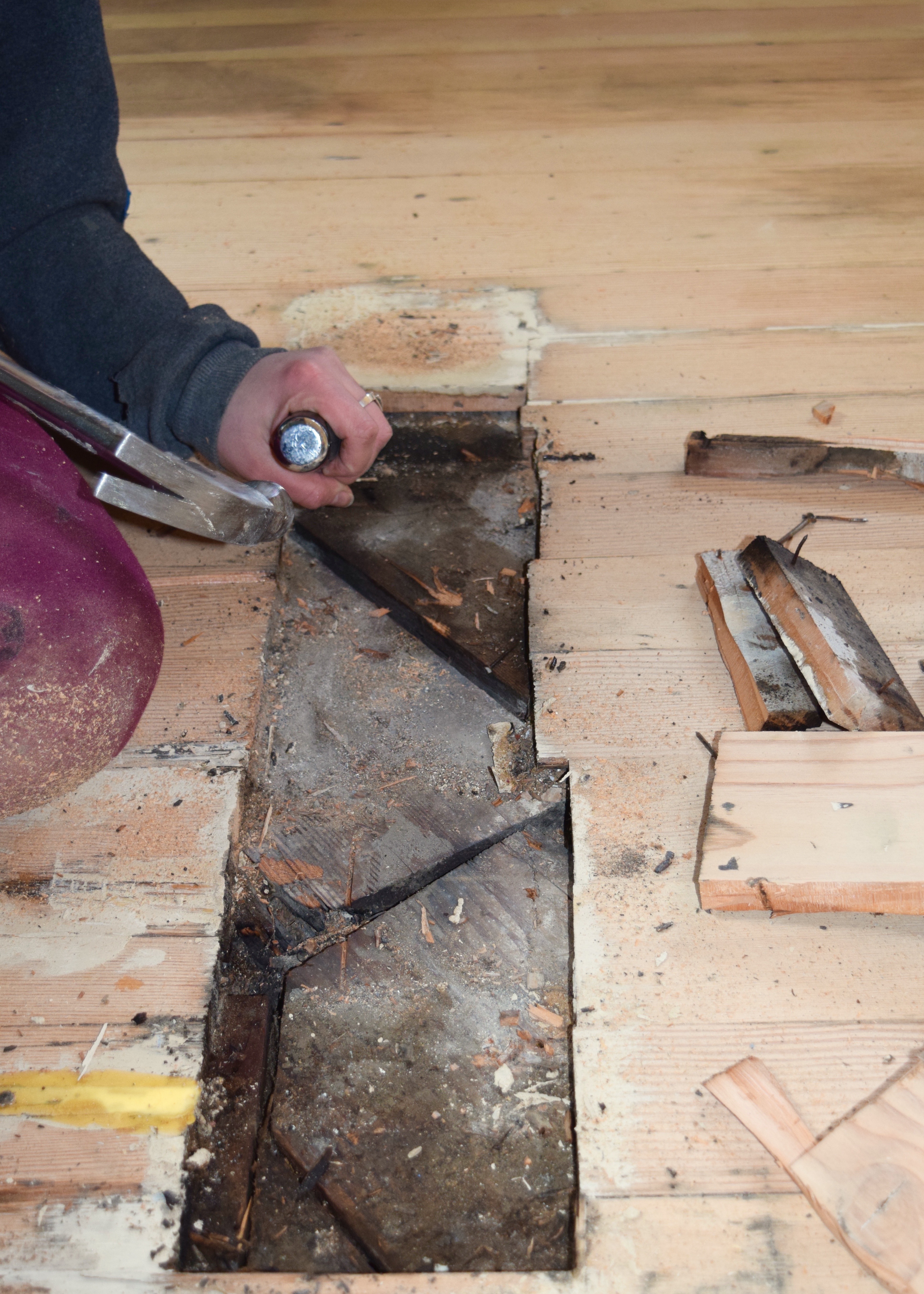Then I moved to the bigger patch job by the (maybe) former-doorway to the (maybe) former-pantry where all those small patches of plywood had been used to fill in the space left in the floor when the wall was removed. It looked bad and my attempt to just patch it hadn’t worked. So I got a hammer and chisel to get it out. Just look at all those little pieces! All slightly different lengths! WHY?!