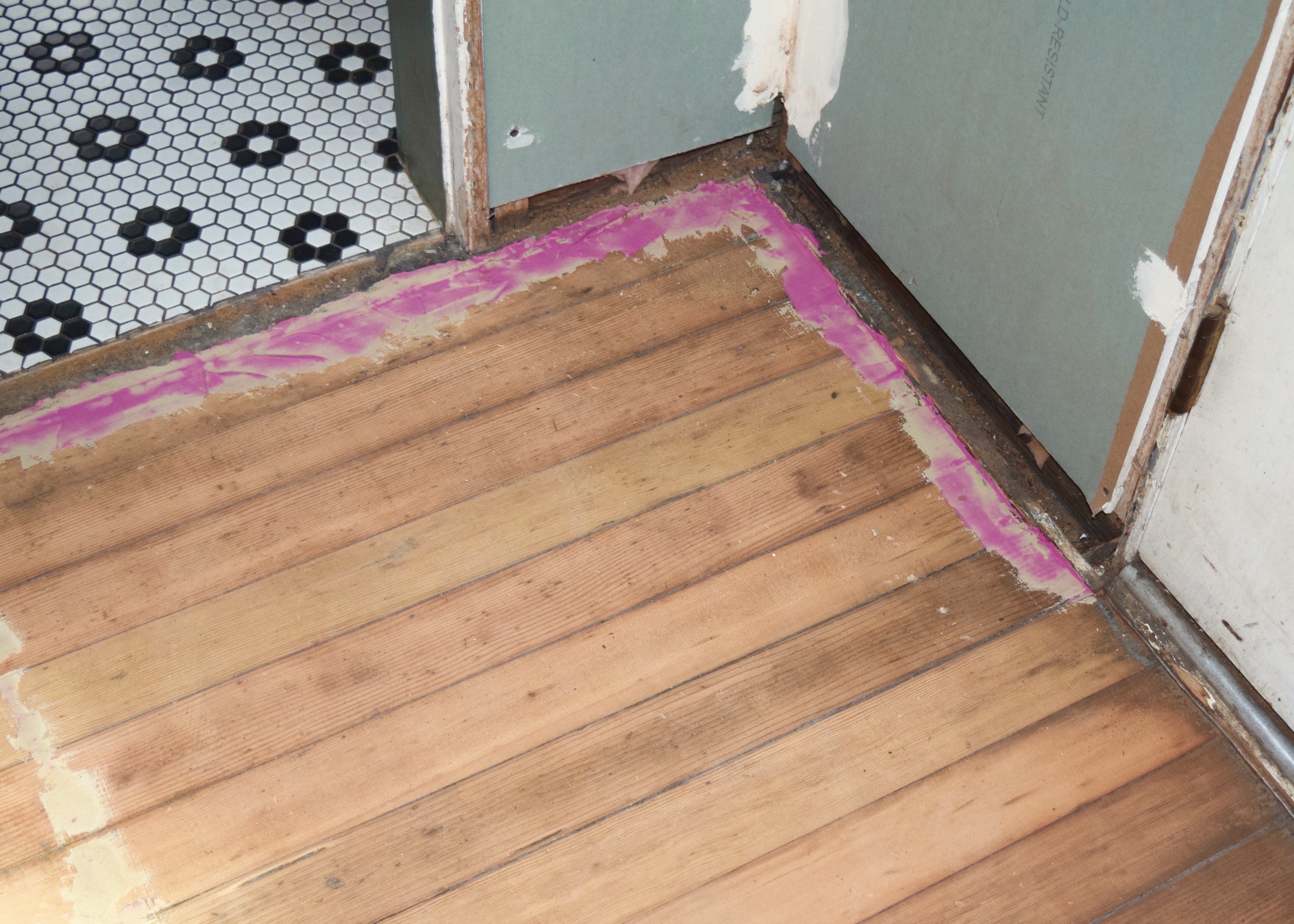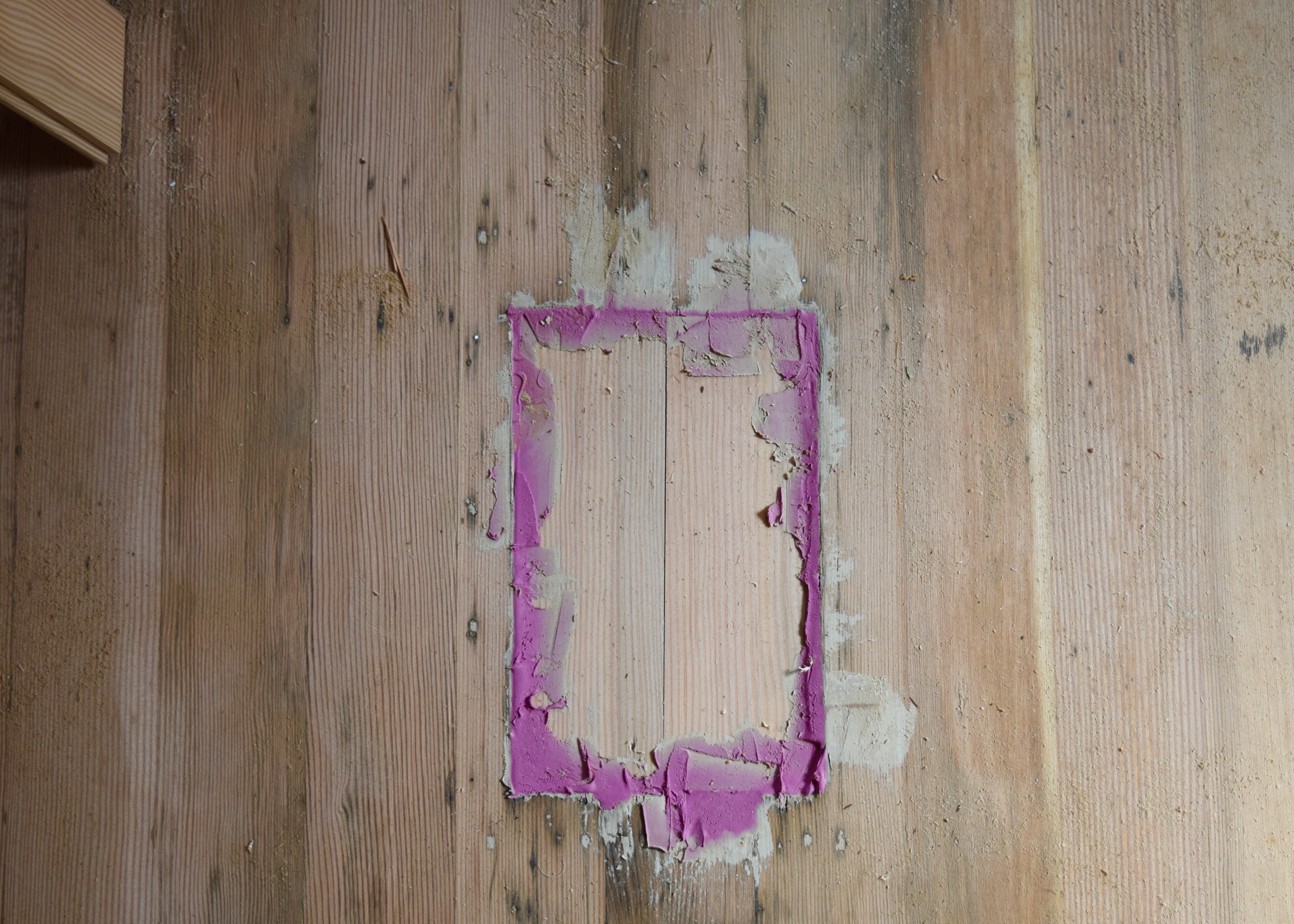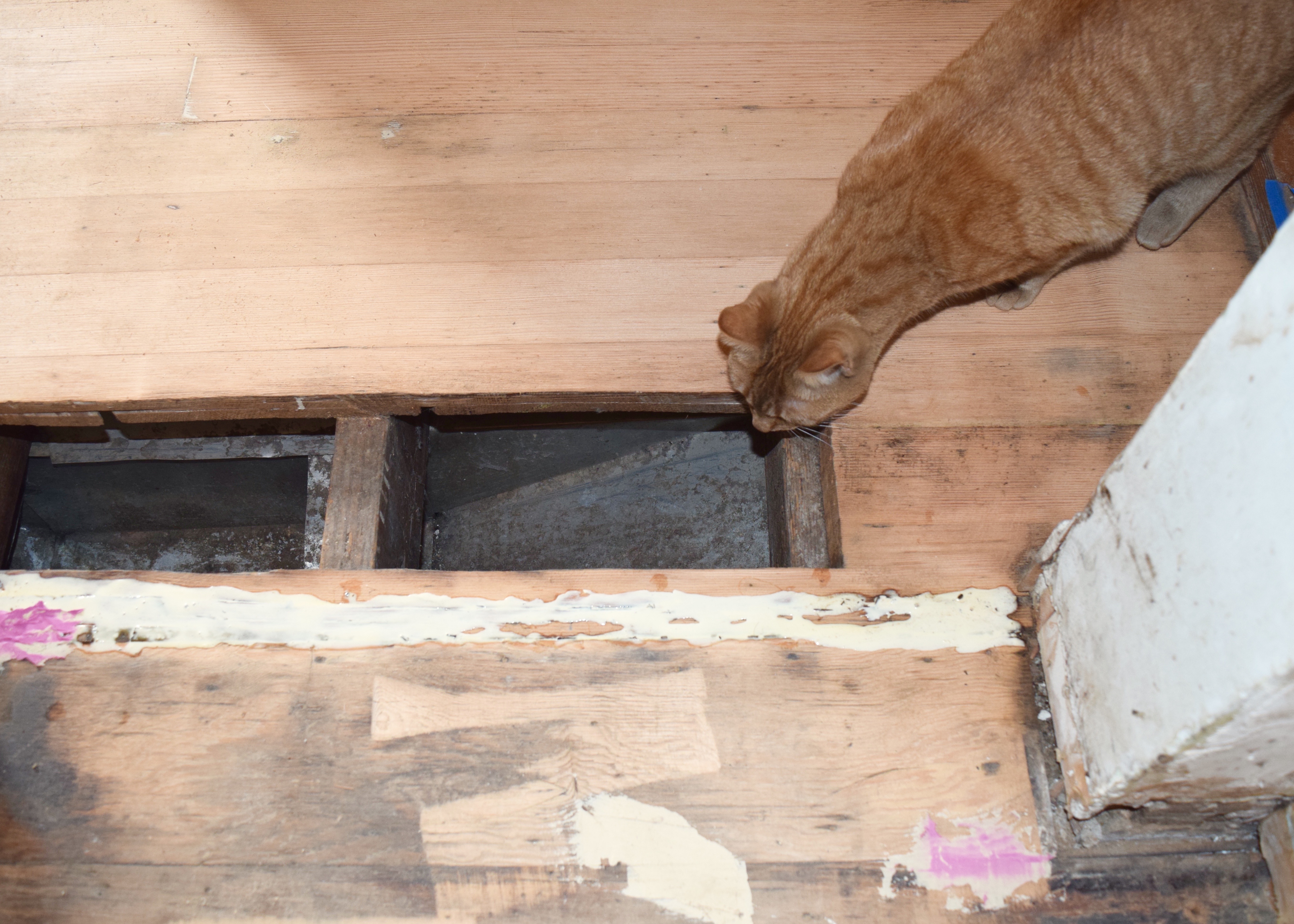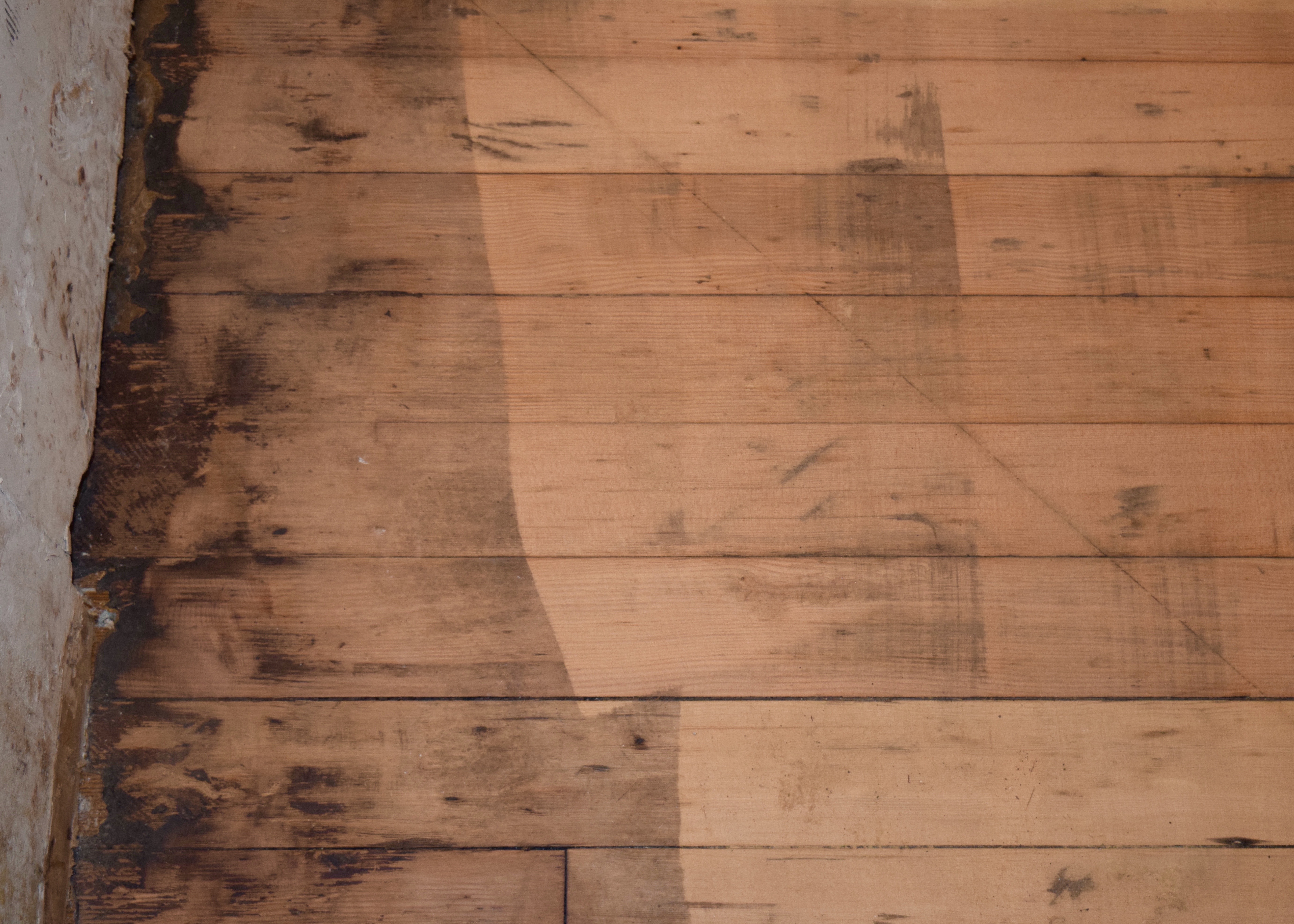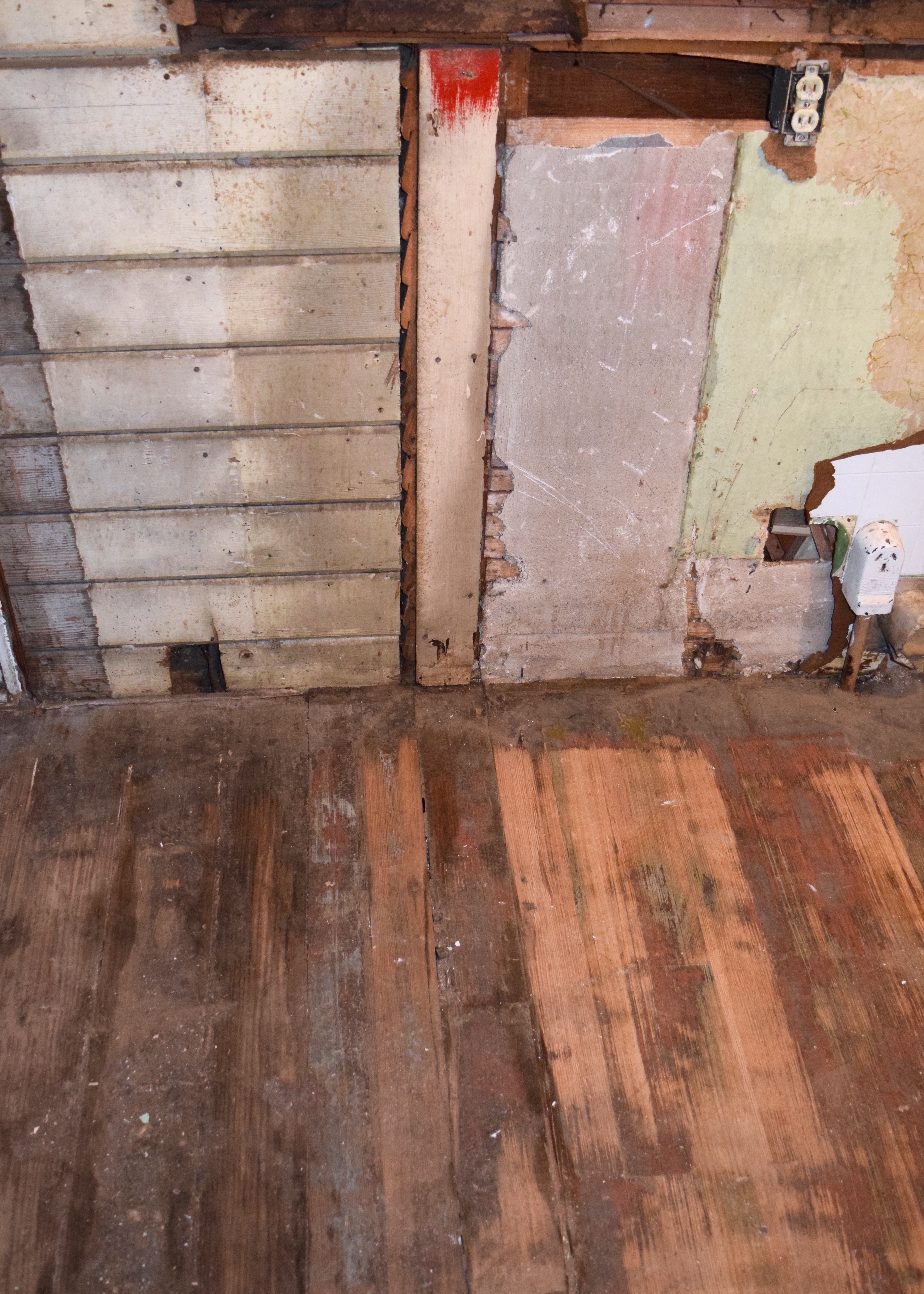 Over here under the windows was another big clue. The horizontal V-groove siding is on the left. Then there a vertical plank of wood with that red mark on top and to the right of that, lathe and plaster. Look closely at the red topped vertical board, just to the left of it, there’s more exterior siding that matches my house, again cut off. This implies that the space where my current exterior door is was “outdoor space” sandwiched at one point between two exterior walls. The floors alluded to a couple more clues here too. Very difficult to see in this unsanded state but, in front of the lather and plaster, the original wood floor planks were continuous from the main part of the kitchen. Then right where the vertical plank is, the flooring breaks and in front of the horizontal V-groove the flooring planks are wider, cheaper, and possibly not fir, AND they stop at the opening to the main part of the kitchen.