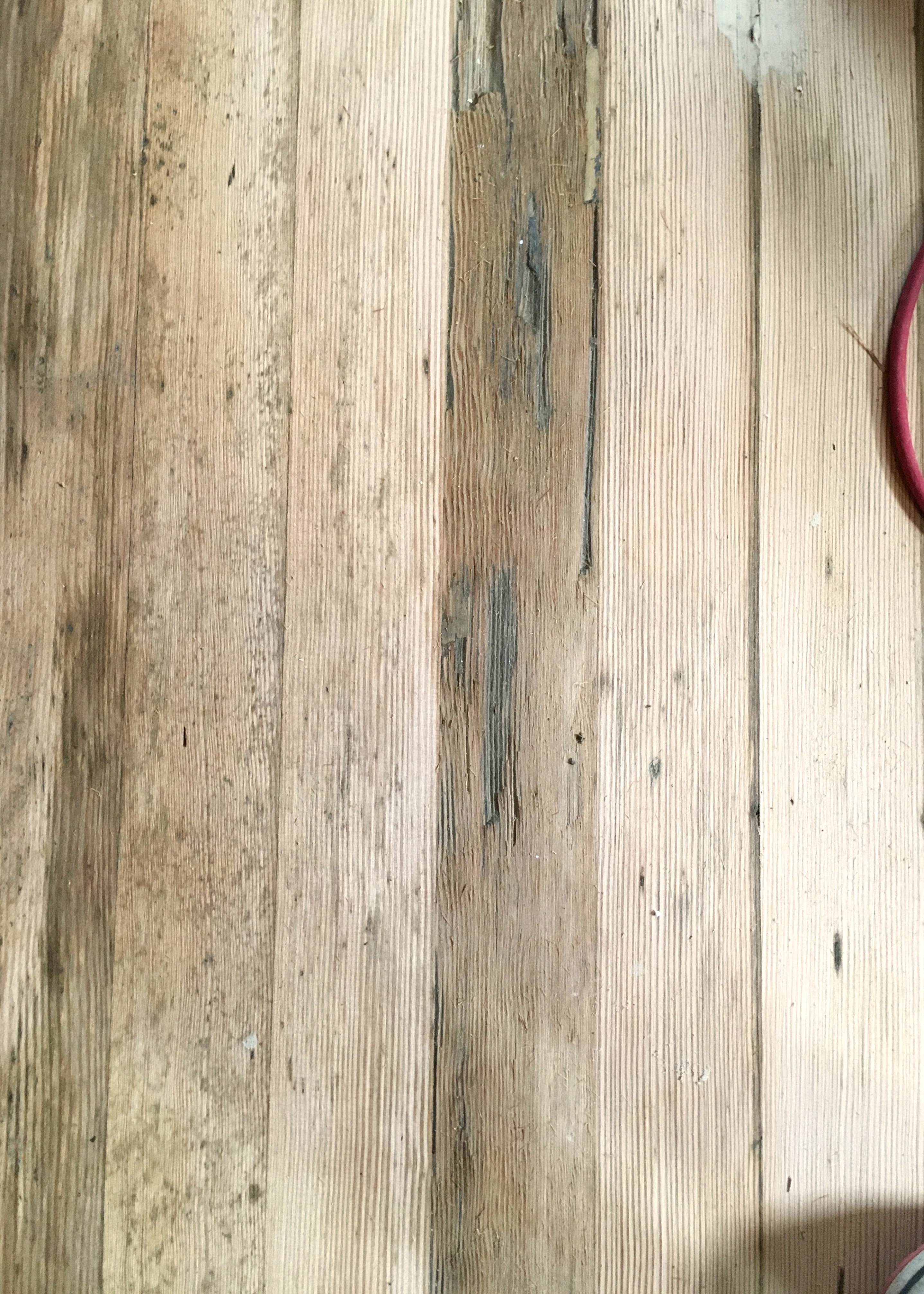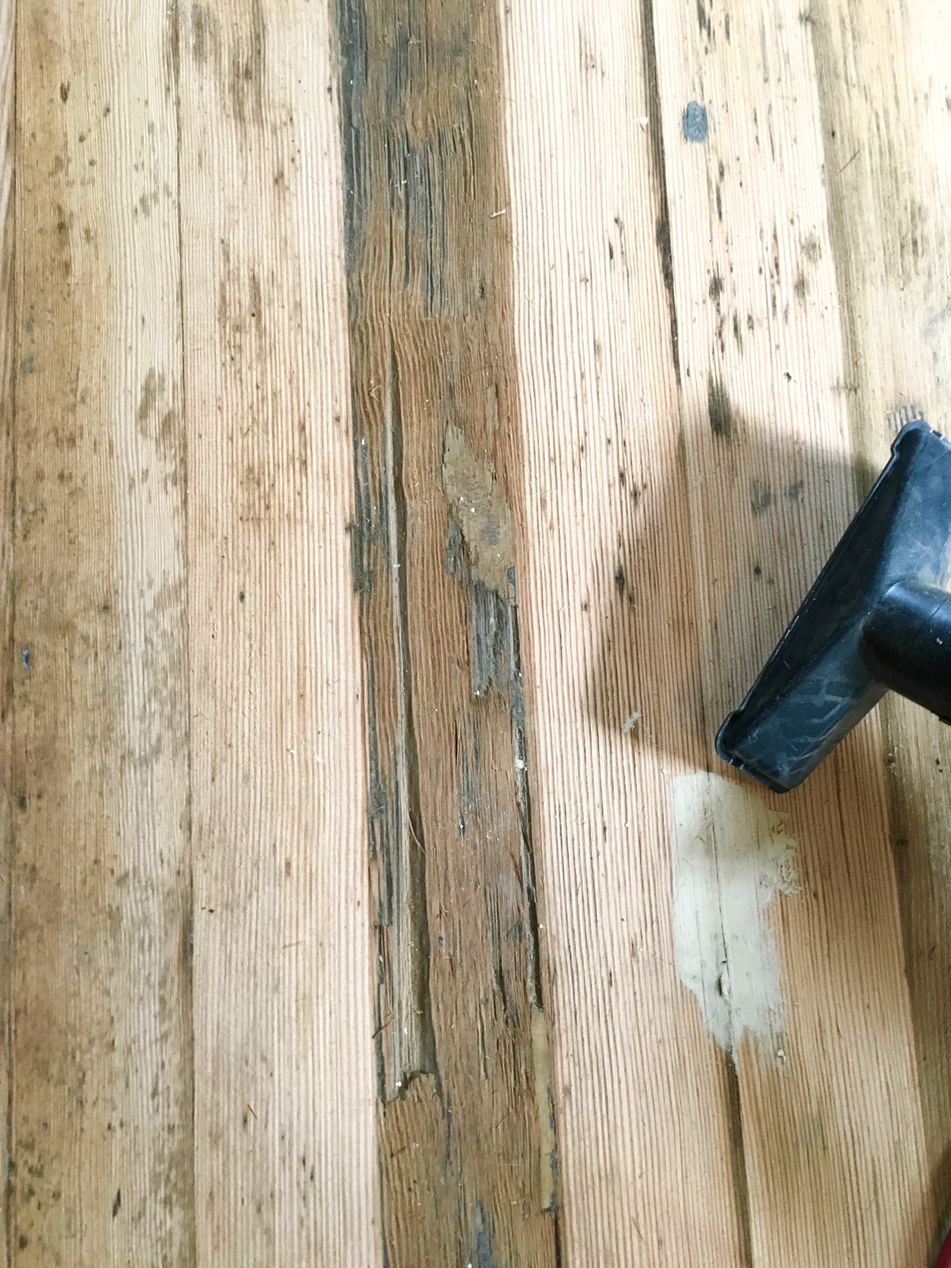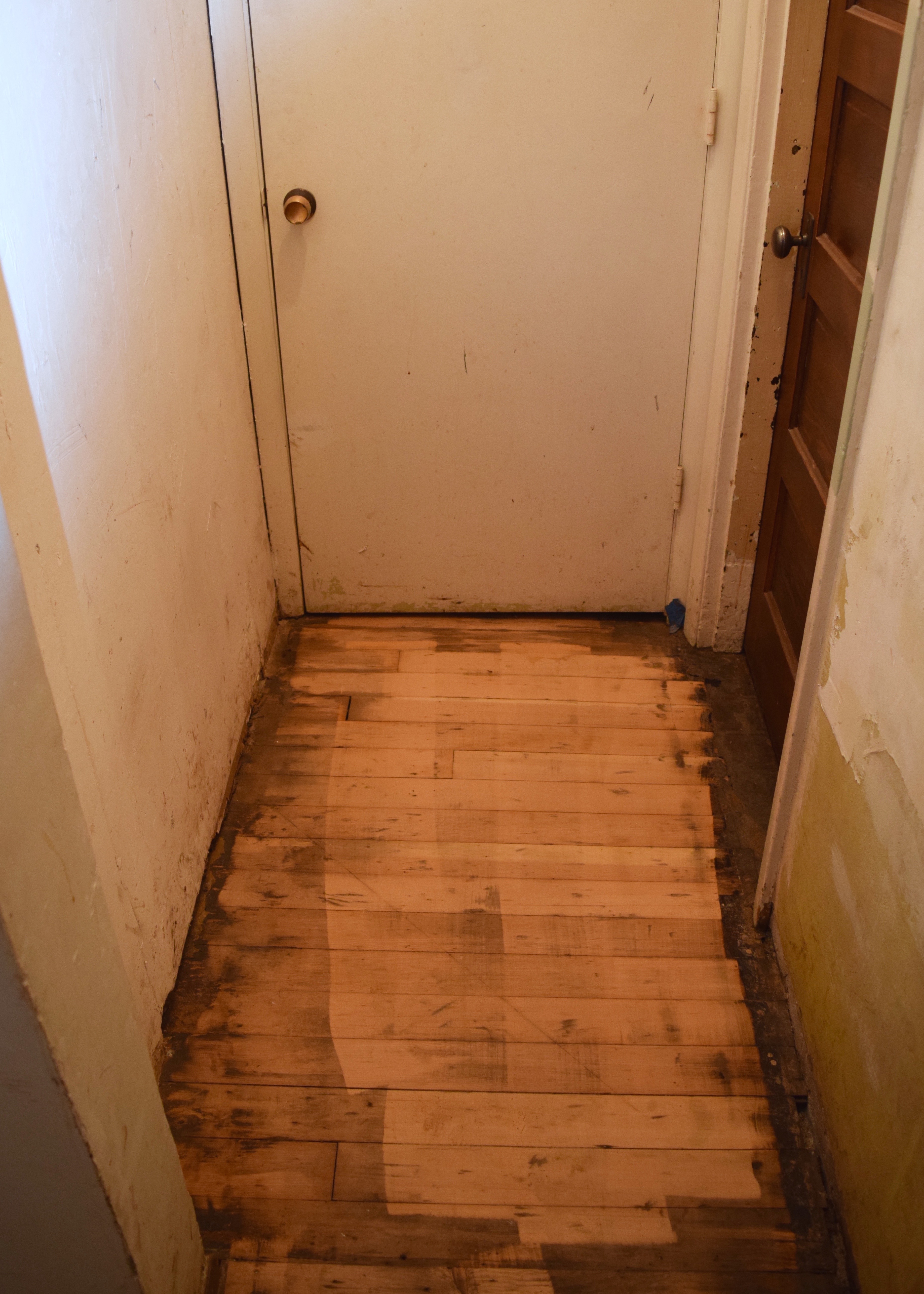 The floors were gross old sheet vinyl and in TERRIBLE shape. No amount of cleaning was going to fix this mess. So I spent WAY TOO MUCH TIME removing all that disgustingness to get ready to refinish the floors.