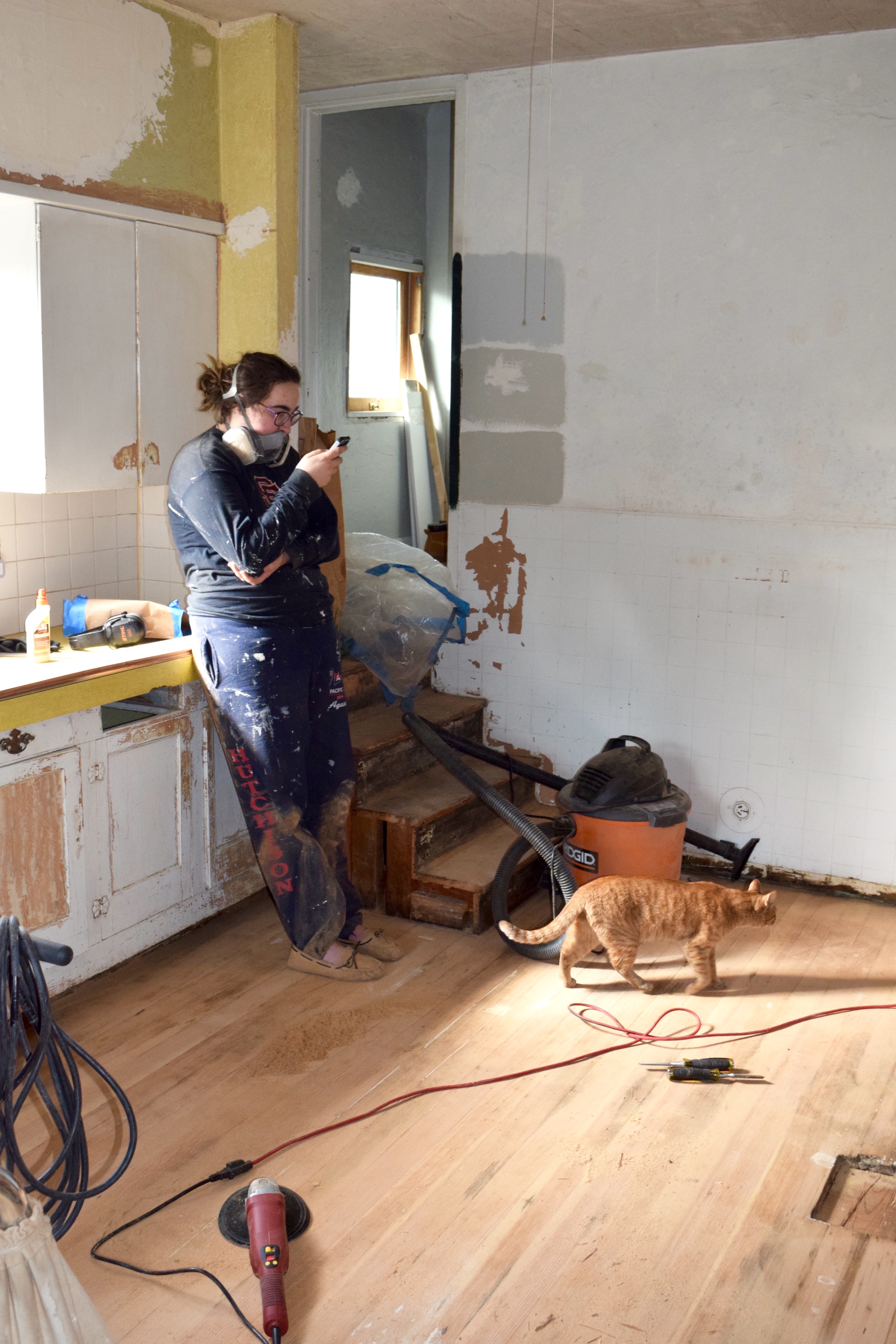 The kitchen had been used as a storage / staging ground for the bathroom renovation and looked absolutely horrendous. My Aunt Steph snapped this shot when she came to visit in early February 2018 and helped to clean the space up. Yes, this is the kitchen I’d been using for the last five months in it’s most “clean” state. Yes, I realize that’s insane. But, hey, at least the bathtub wasn’t in there any more. Progress right?!