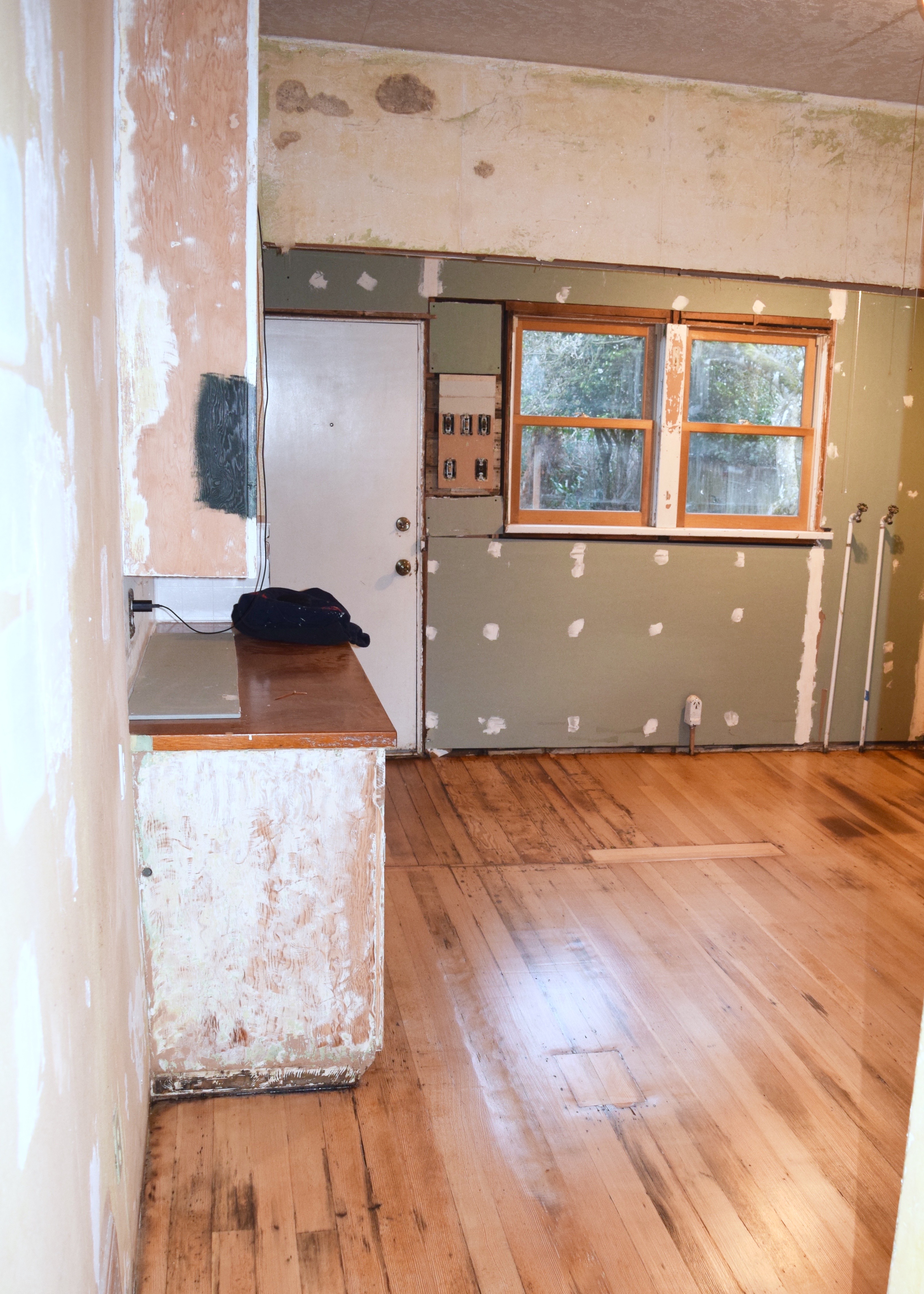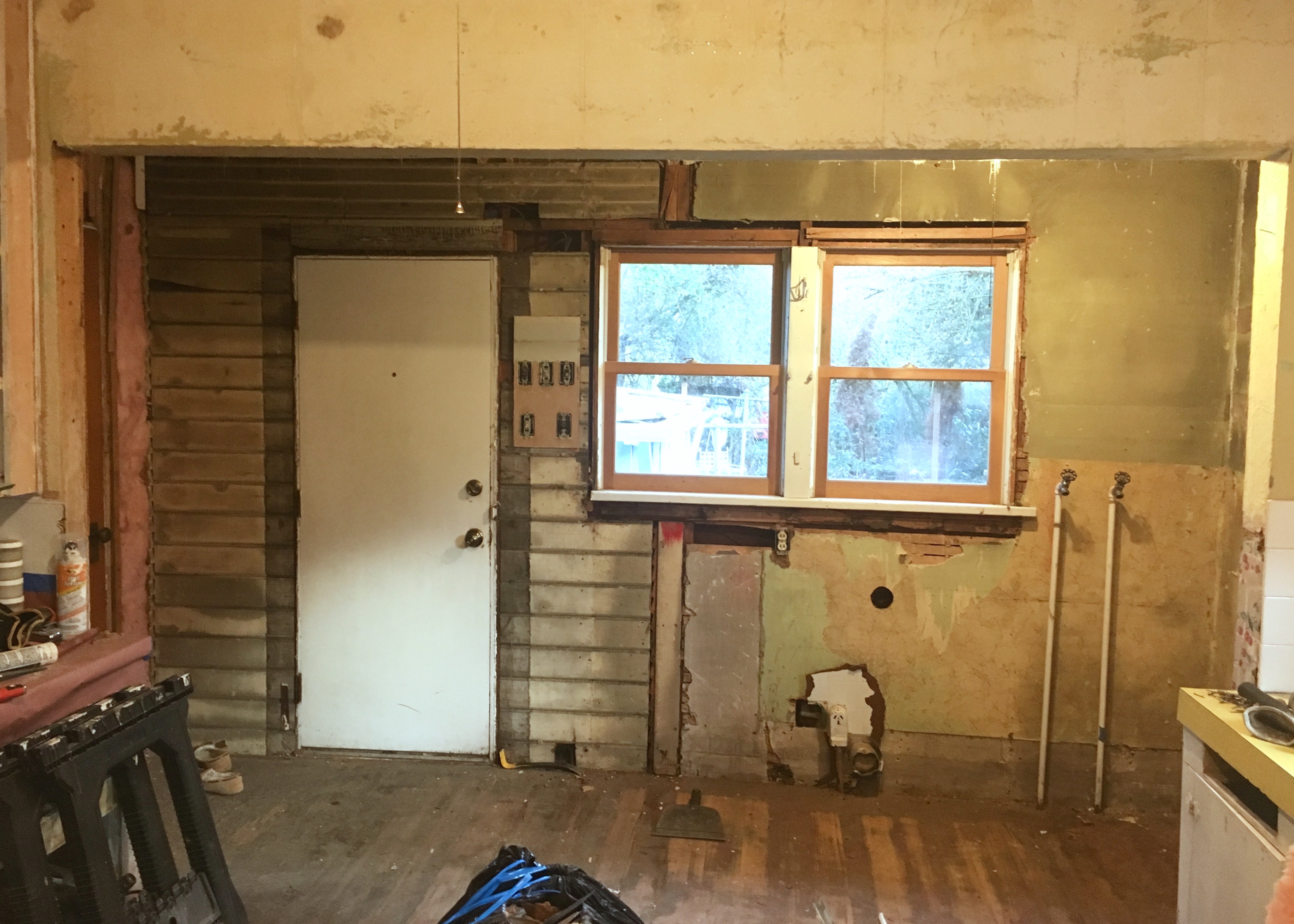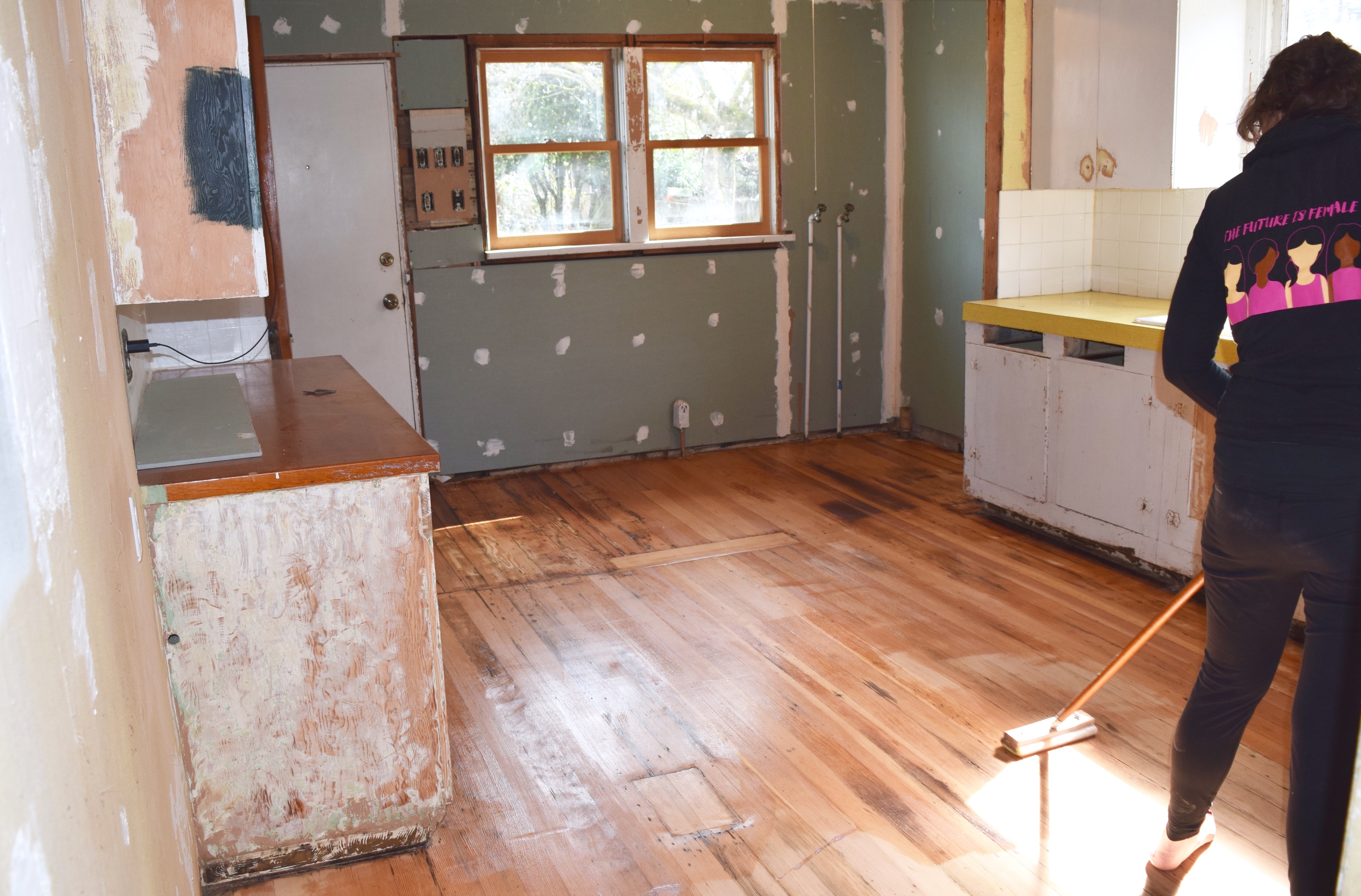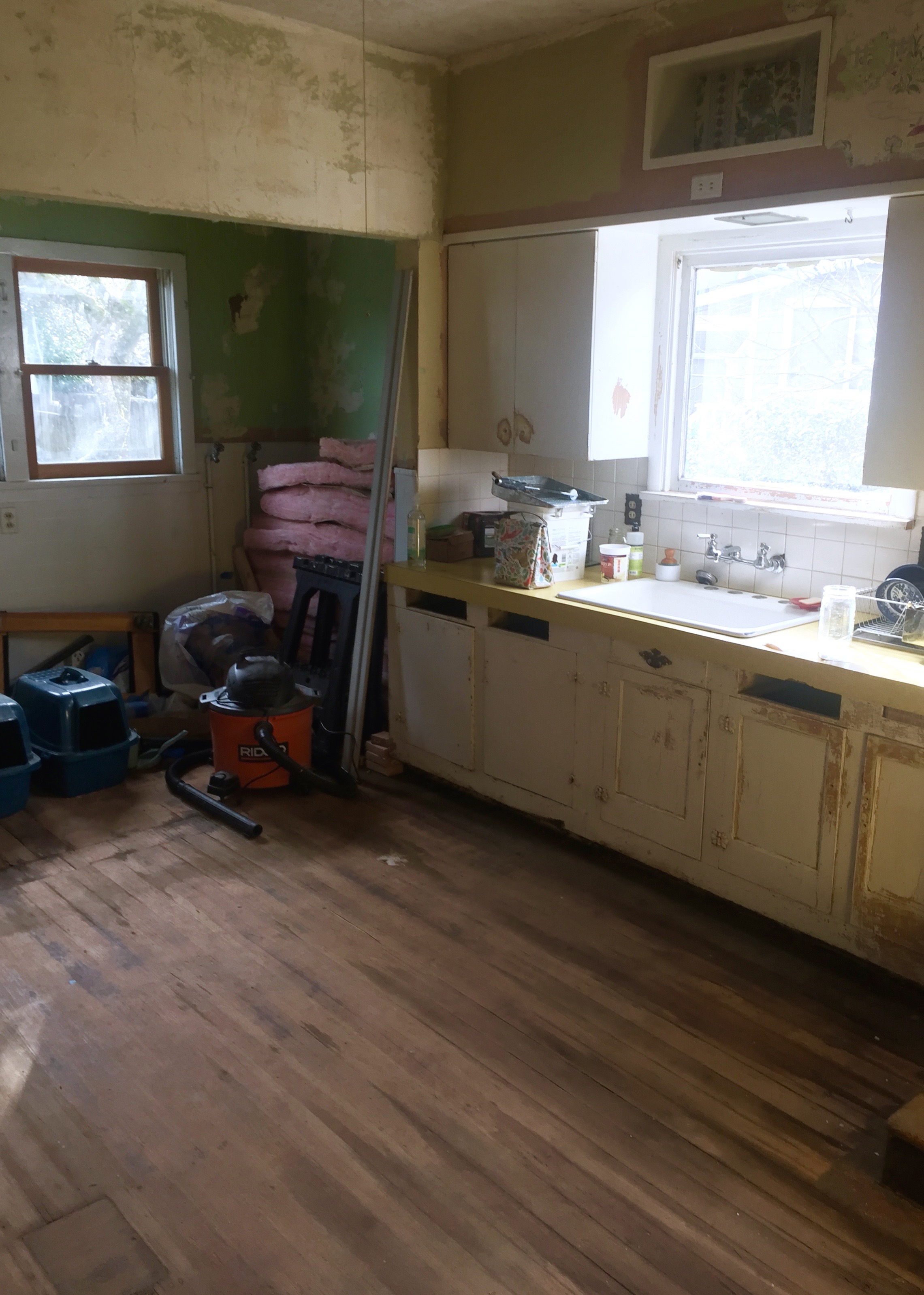 My kitchen is weirdly sectioned into two spaces: the main kitchen in the main house and the back part of the kitchen which is in what I assumed was originally a porch when the house was build in 1909. Well, after taking a closer look at the walls in the space I realized the back portion of the room was in really, really rough shape. Far worse than the main part of the kitchen and a couple coats of paint wasn’t going to hide it. So, I decided to just demo that area back down to the studs and throw some drywall up before refinishing the floors. Bronwyn and I went to work pulling off the homosote (a drywall precursor) and exposed some unexpected results…