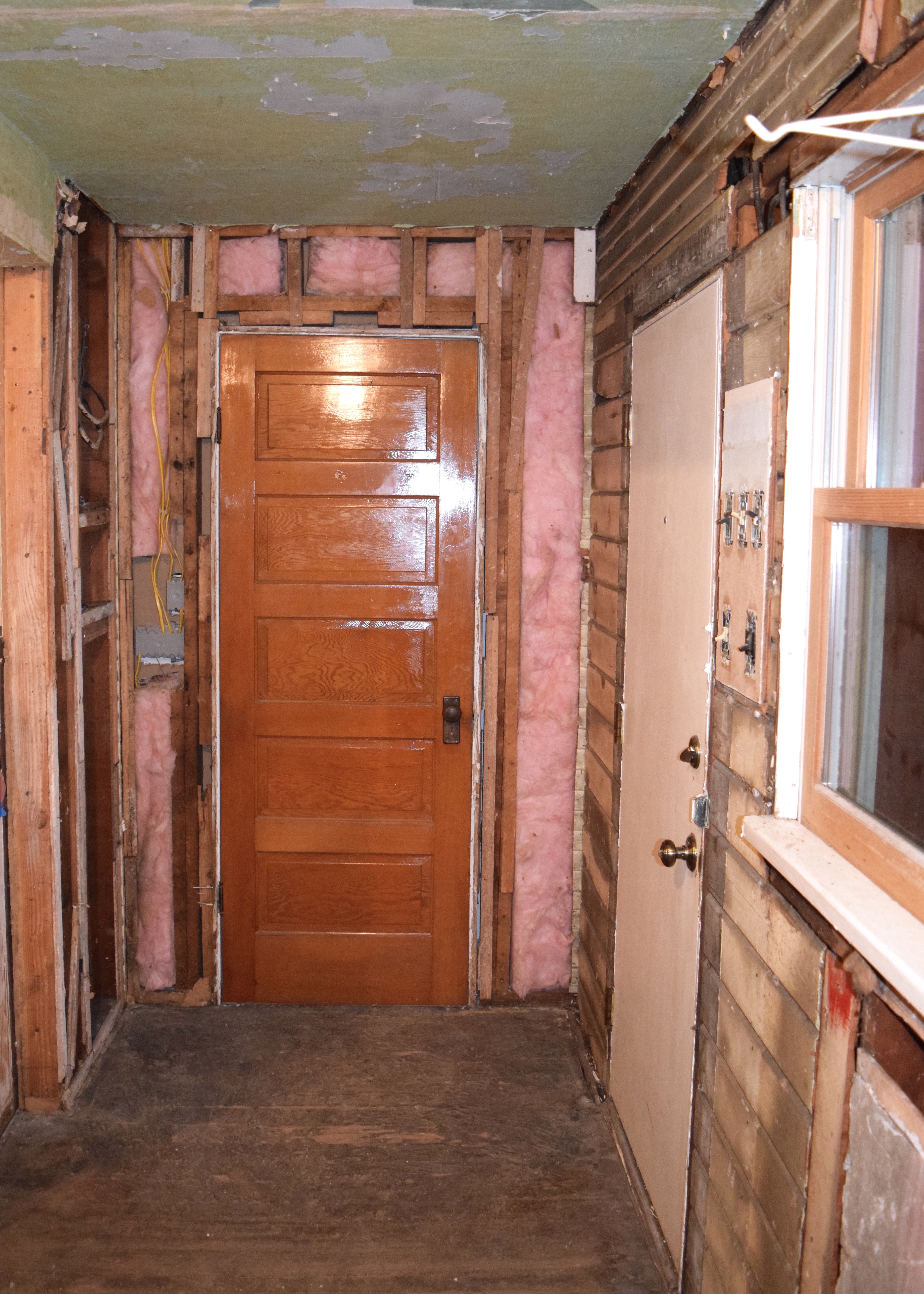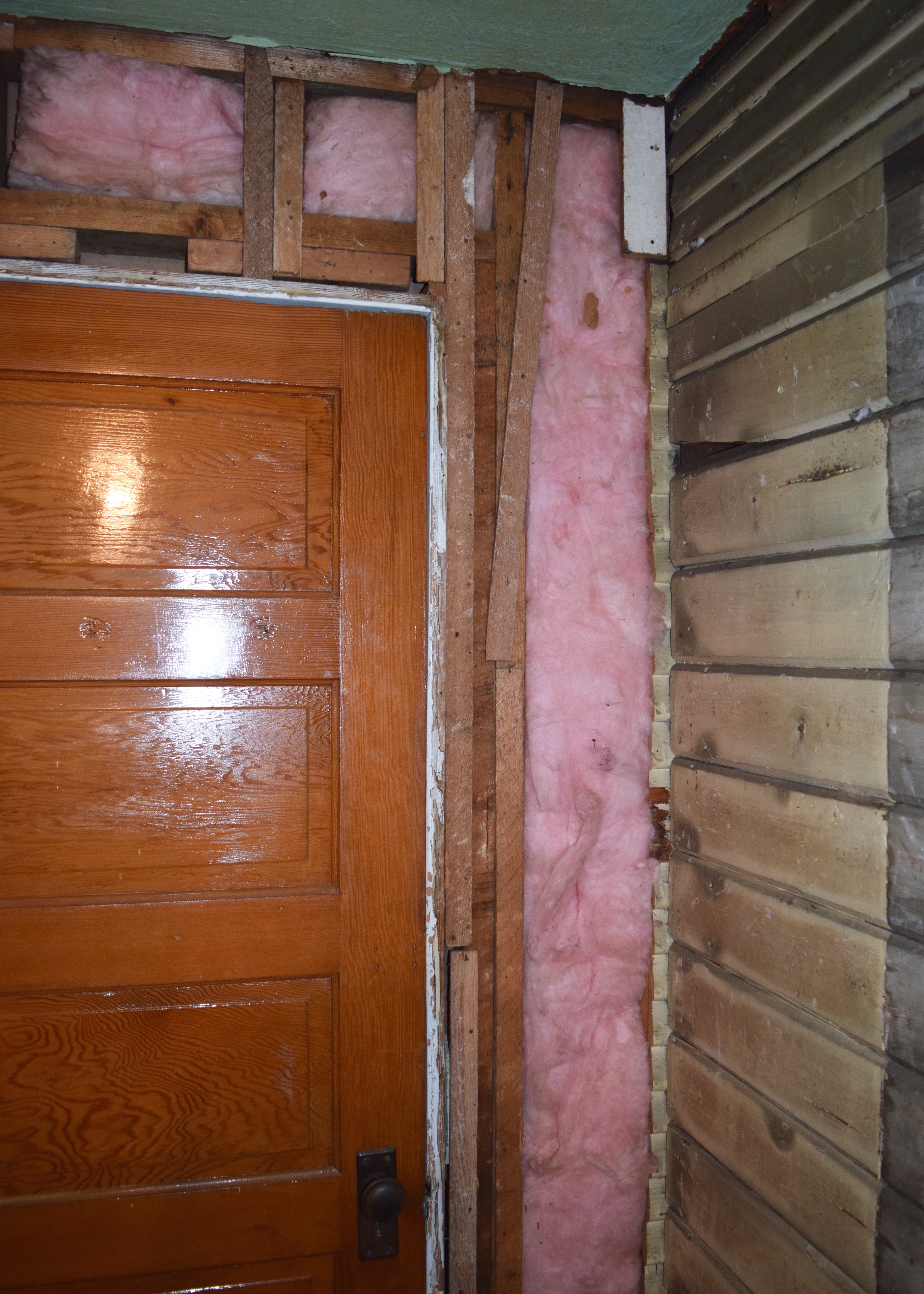 The bathroom door was probably not originally located here. It may have been off the master bedroom actually and maybe used as a sleeping porch? Or… I’m not sure what the use of the room was, but it was clear that there was an exterior wall separating this section of the kitchen from the current bathroom at one point in time. See the corner where the bathroom pink insulation meets the perpendicular wall of horizontal V-groove siding? There about an inch and a half of exterior siding that matches the rest of my house, sawed off roughly. It’s that slightly lighter / yellower color. Maybe the exterior of the house was light yellow at first?