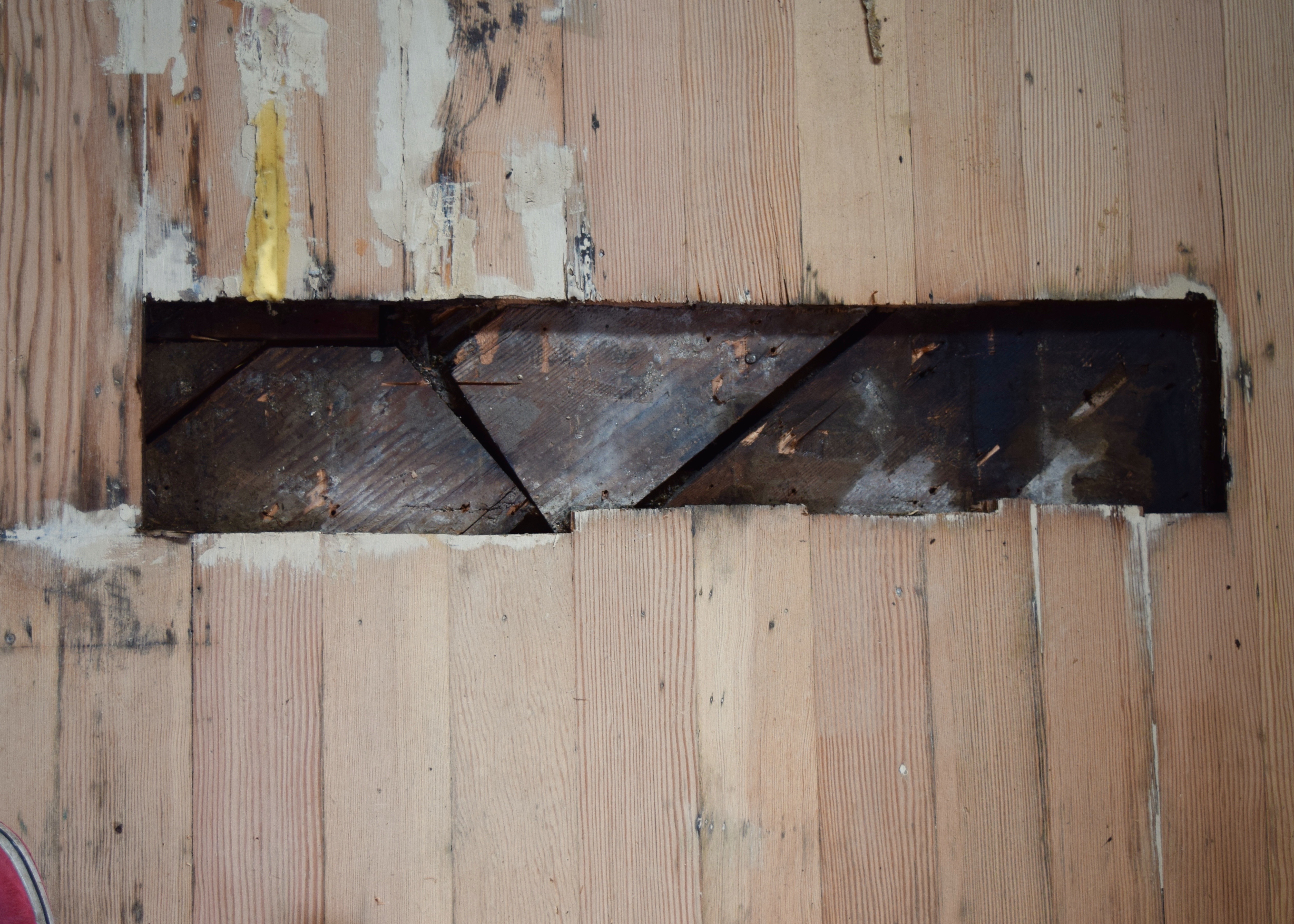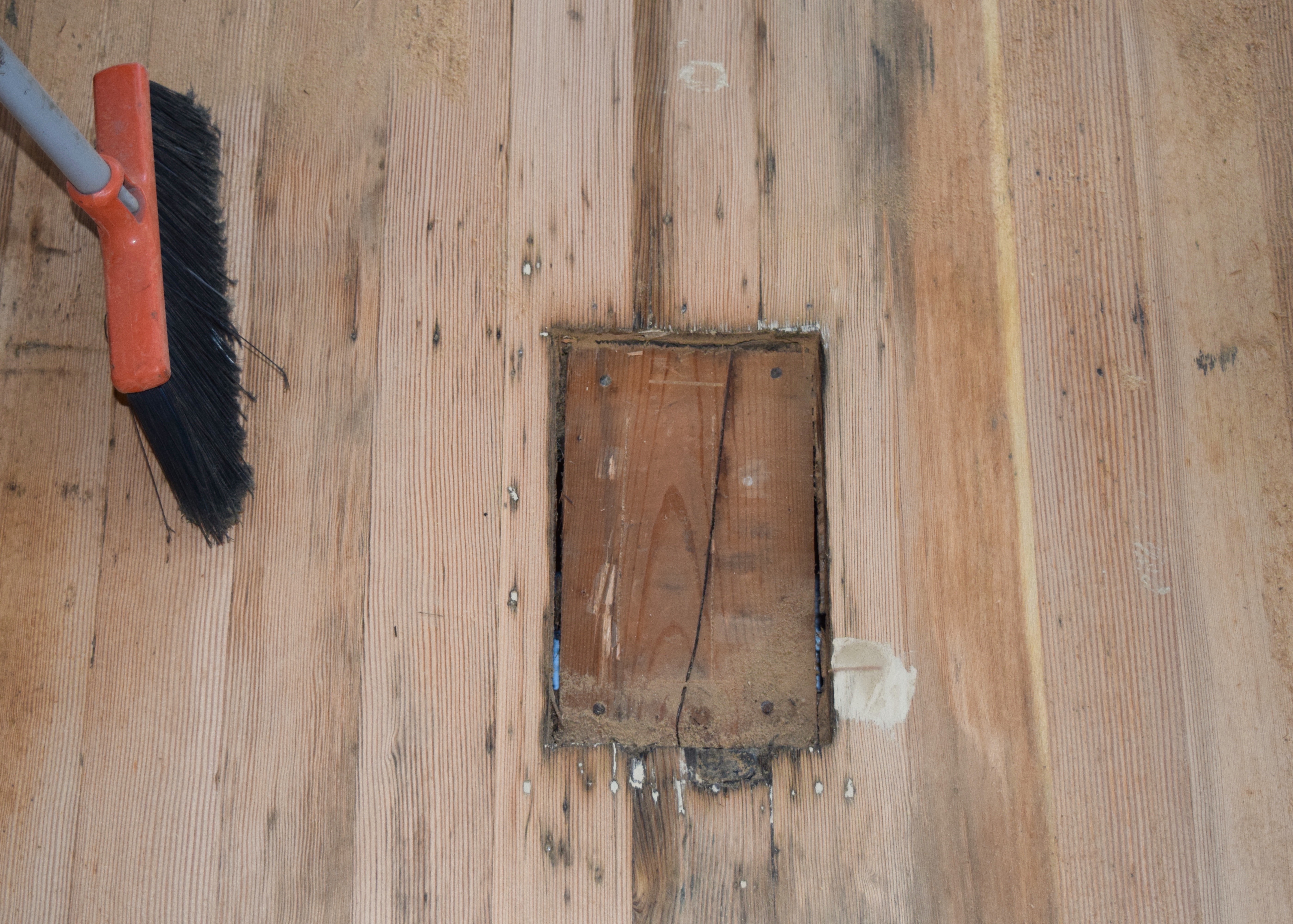Well by the time we got around to 60 grit sandpaper, it no longer had concrete on it, it was just a weird little patch job. I think the concrete was smoothed over it to bring the flooring level flush before they put in the first layer of sheet vinyl in the 40s. Why are you there patch job?! Were you an ash shoot to the basement? Or just… nothing but a patch? You can see the plywood patch here by the edge of the drum sander. This was before I decided to remove it when I was still trying to add would filler to ALL THE SPOTS!