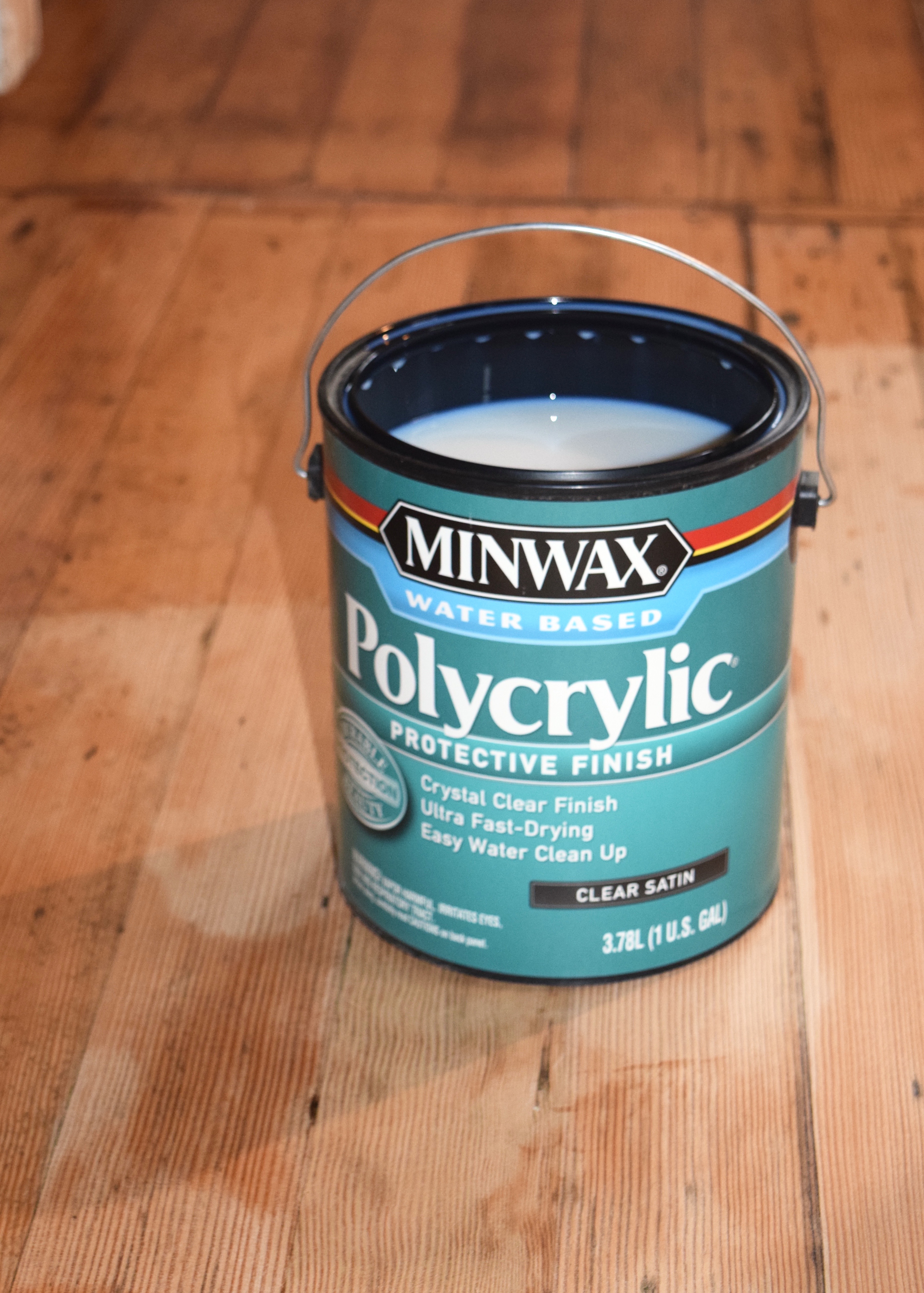 Applying the finishing Polyacrylic was a lot like mopping your floors, but with less dirty water. You start in one area and carefully wipe a liquid down and across the floors without letting it pool in any one area.