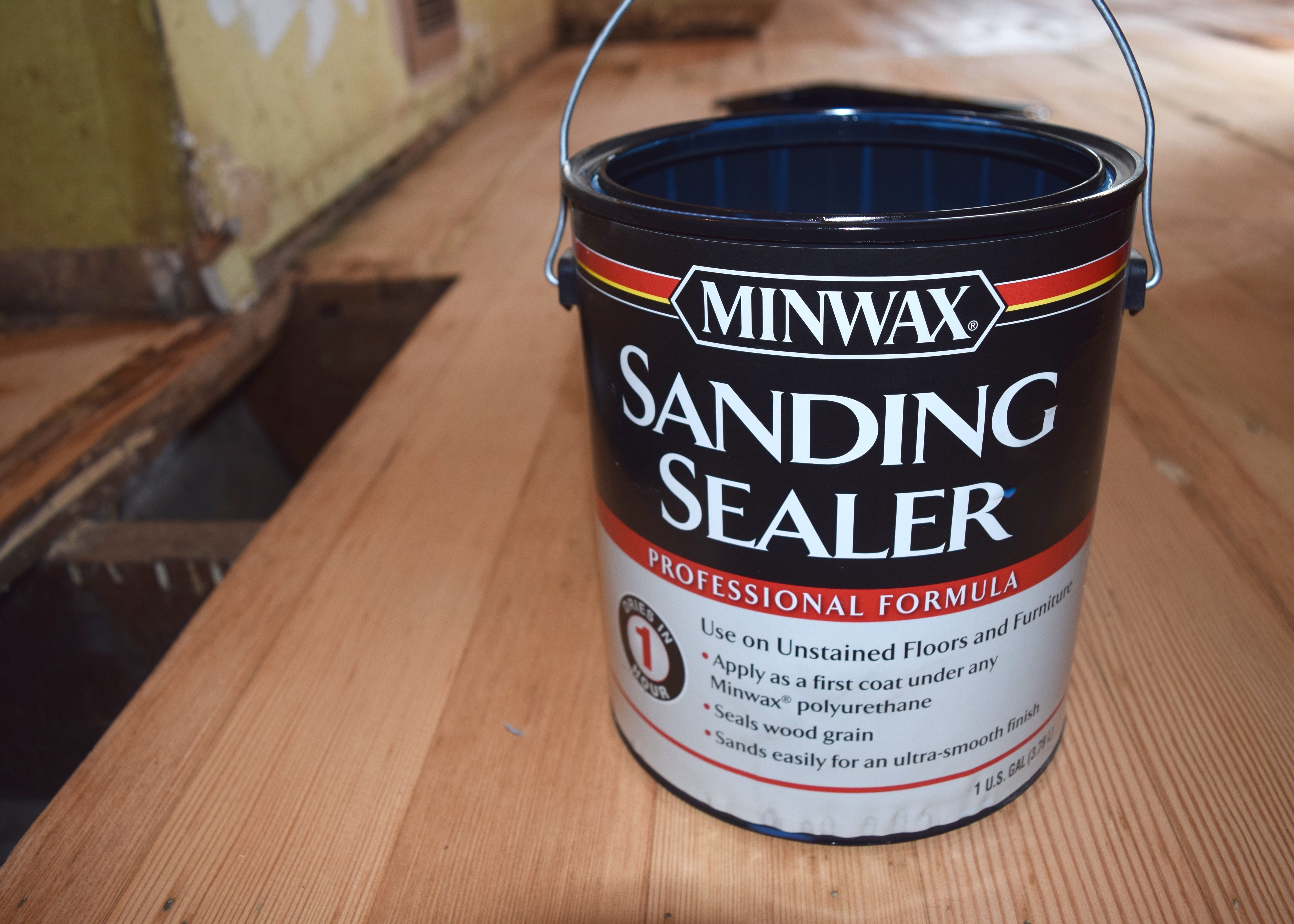 We started with one coat of Minwax’s Sanding Sealer to seal the wood grain and provide a smooth surface for the poly coat we’d add on top.