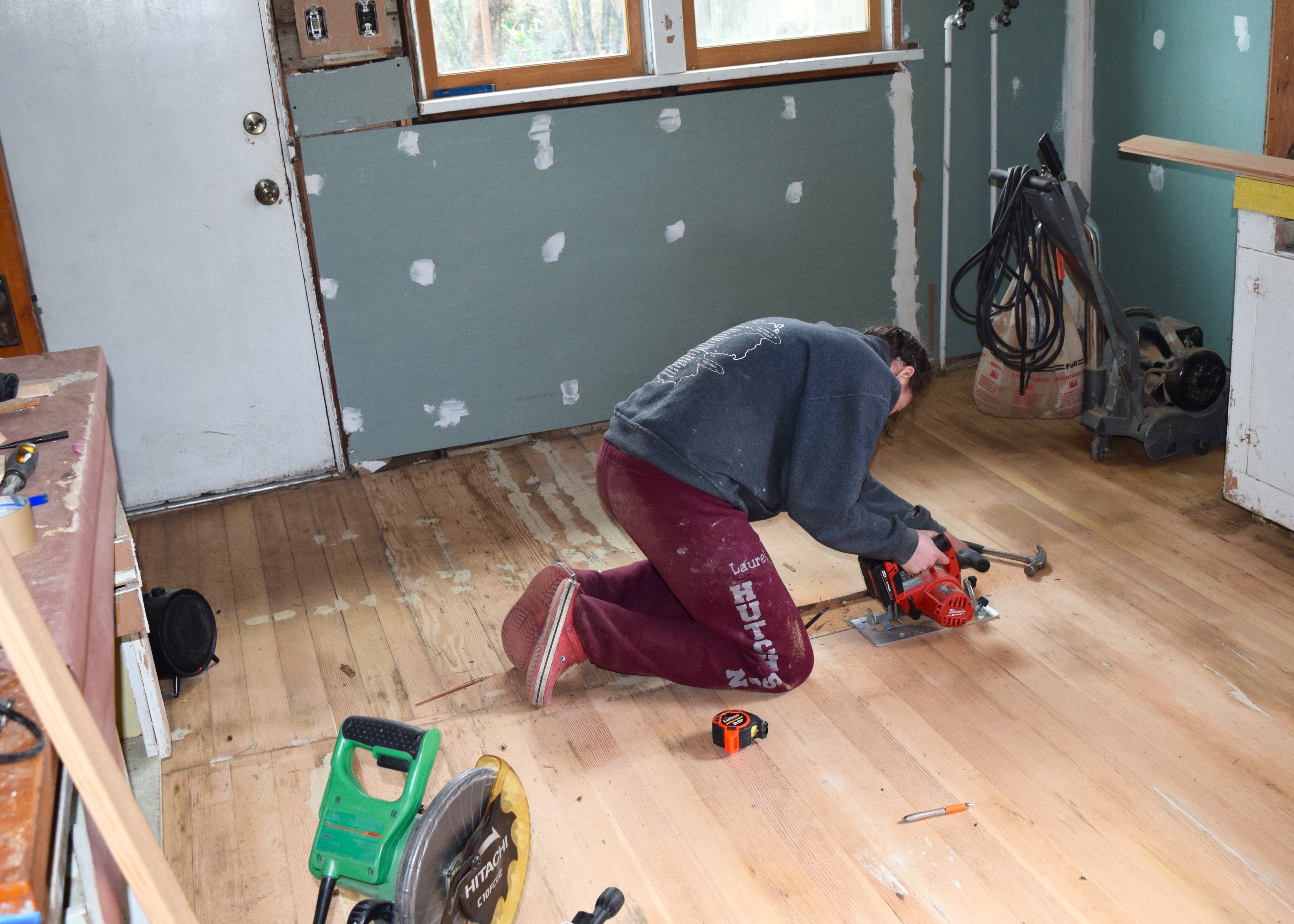 Anyways, after I finally got about 90% of the tar based (non-asbestos!) adhesive off the floors, it was time to work on the bathroom. Since having a place to bathe is basically essential for living a normal & accepted lifestyle, the bathroom was the priority. As I finally finished the installing the necessary plumbing fixtures in the bathroom it was time to turn my attention back to the floors. But before I could finish the floors… there was prep work. Grr… no one likes prep work!