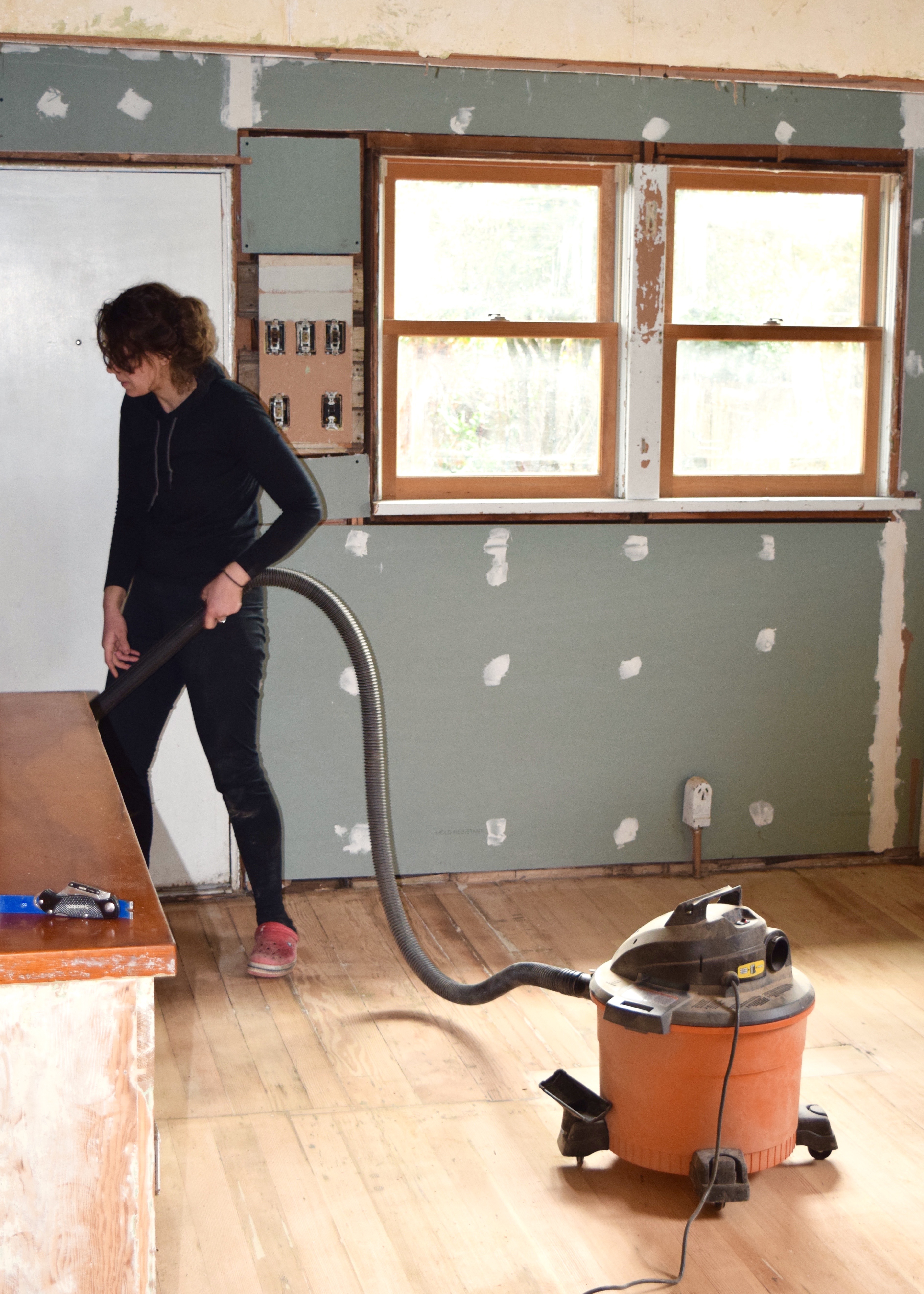Finally finally, we patched everything that could be patched and sanded with the drum sander at 100 grit and did the polisher on the edges with 80 grit. Which took almost the whole morning. Then it was time to clean. Oh we swept, we vacuumed, we vacuumed again, and again.