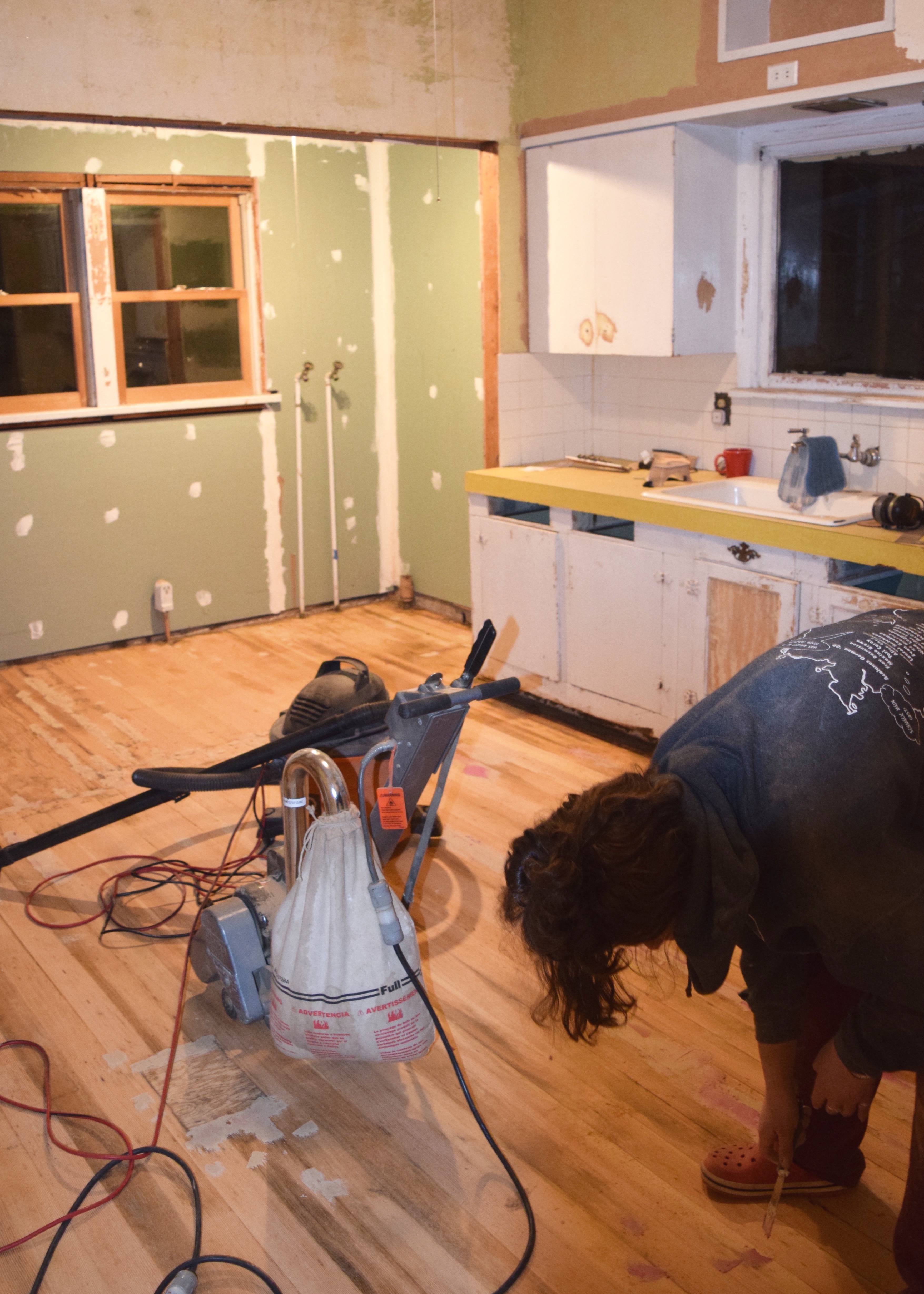 I didn’t get a good picture of it at this stage, but the partially sanded floors also showed an outline of a wall dividing the main part of the kitchen from the lathe and plaster area of the back of the kitchen, stopping just short enough for a door opening. So here’s what I am now thinking: the house originally had a cold room and/or pantry attached to the main kitchen. The two big windows on the rear wall didn’t exist, but the room got light from the boarded up west window. The room was accessed on the right side of the main kitchen where the flooring continues into the space without interruption. Eventually the two waterlines and vent were added in there and the room was used as a laundry room in the mid-1900s. I have no idea how the space that now holds the master half bathroom and the main bathroom were utilized, but they may have been porch space that was converted to indoor bathrooms when those became typical indoors in the 1930s. I think the space in front of the current back door was exterior porch space the longest, and then eventually converted to indoor space. Though I don’t know why the exterior V-groove siding was used… perhaps it was a mudroom?