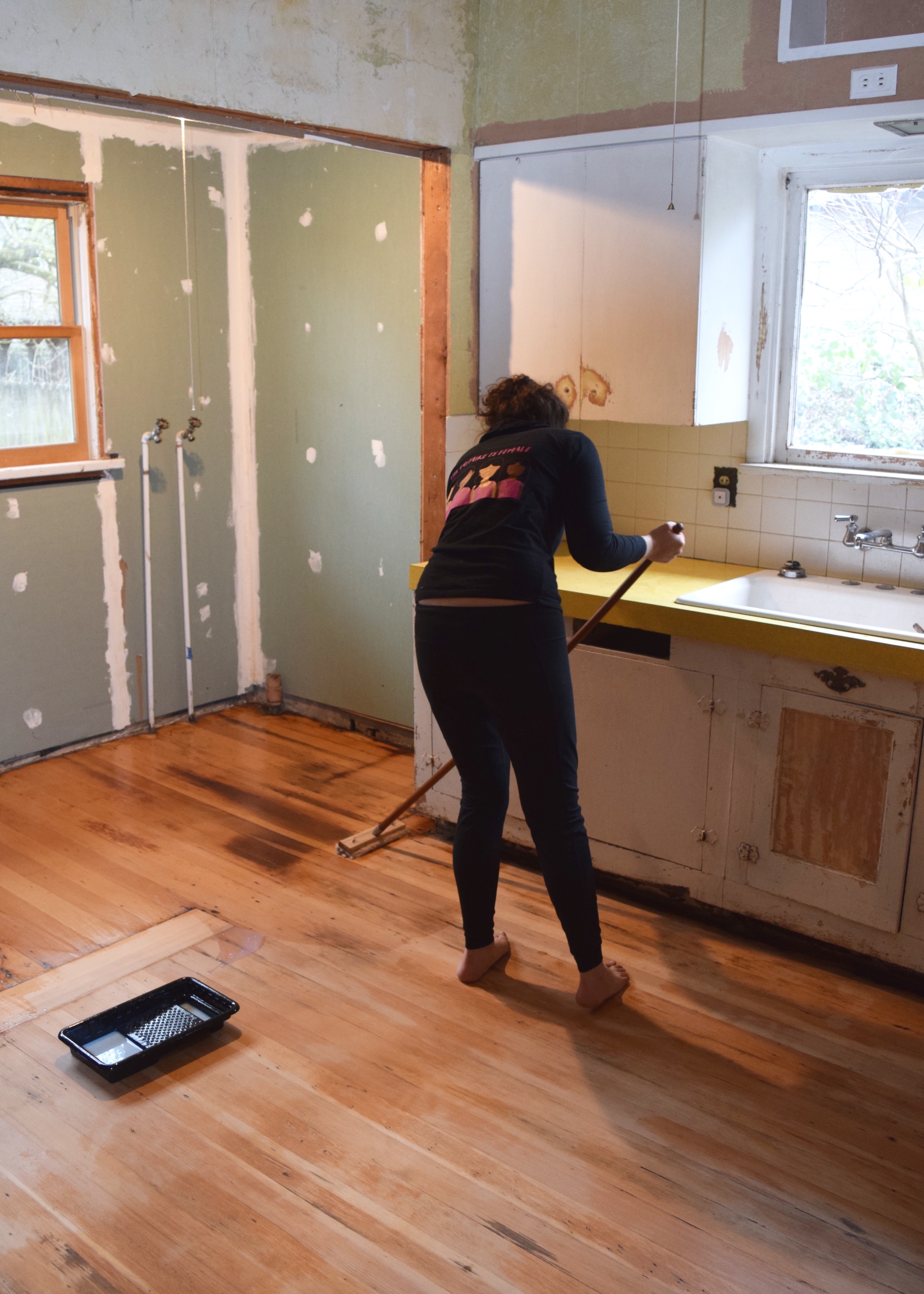 The change felt so good! Being able to walk through my house barefoot for the very first time since moving in felt soooo good! Having a kitchen after 6 months without one felt SO GOOD! This project felt like the biggest of all accomplishments to date. Bigger than the bathroom renovation, which I know seems silly, but this project had so much more riding on it. I knew the bathroom renovation would work out, it was a gut reno, there were no questionable old elements, everything was brand new for the most part. This, this was restoration, this was SAVING 110 year old floors. And I did it myself! Well, myself with a lot of help, but still. There they are in all their glory: 110 year old original fir floors. Now just to finish the rest of that kitchen…