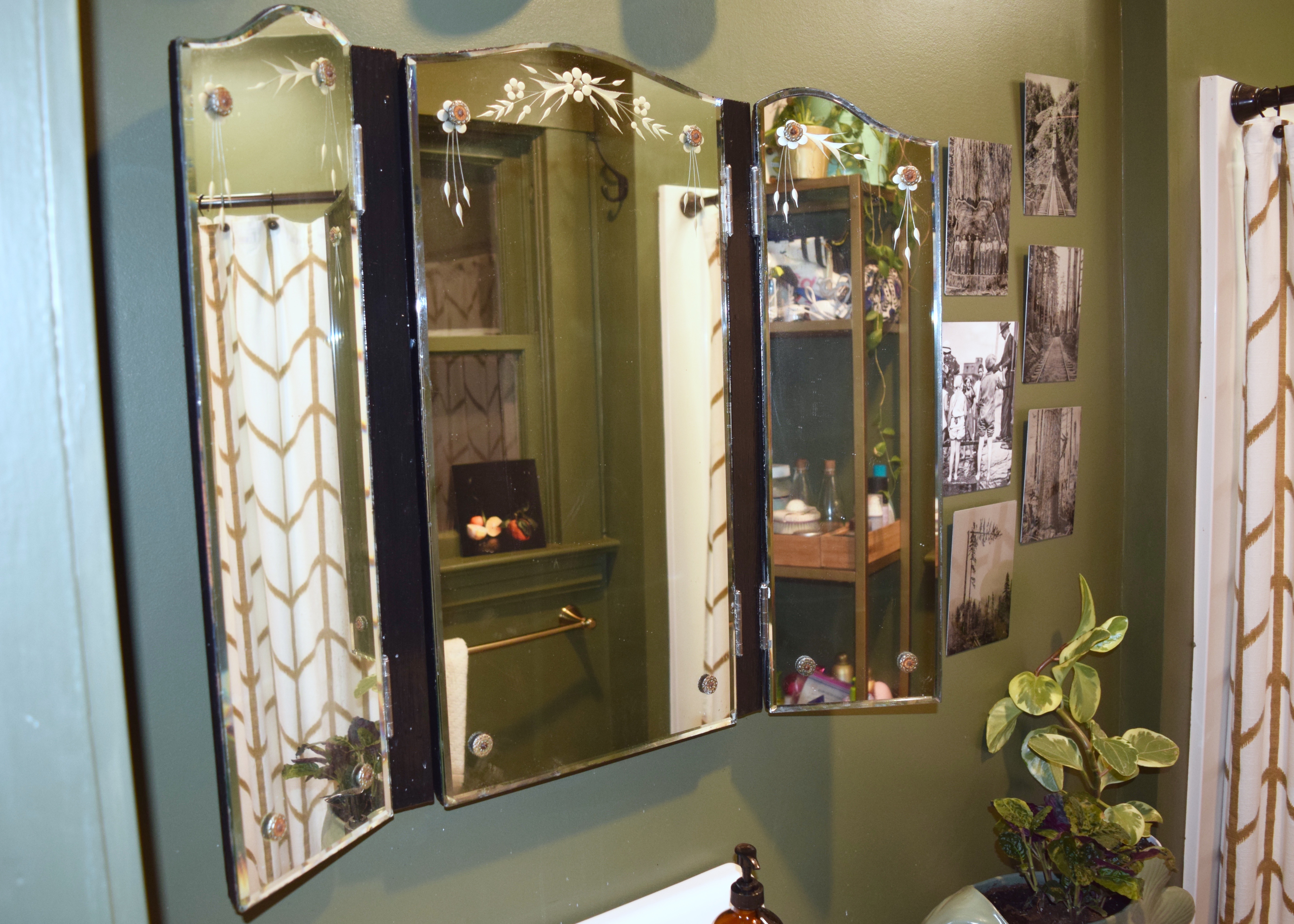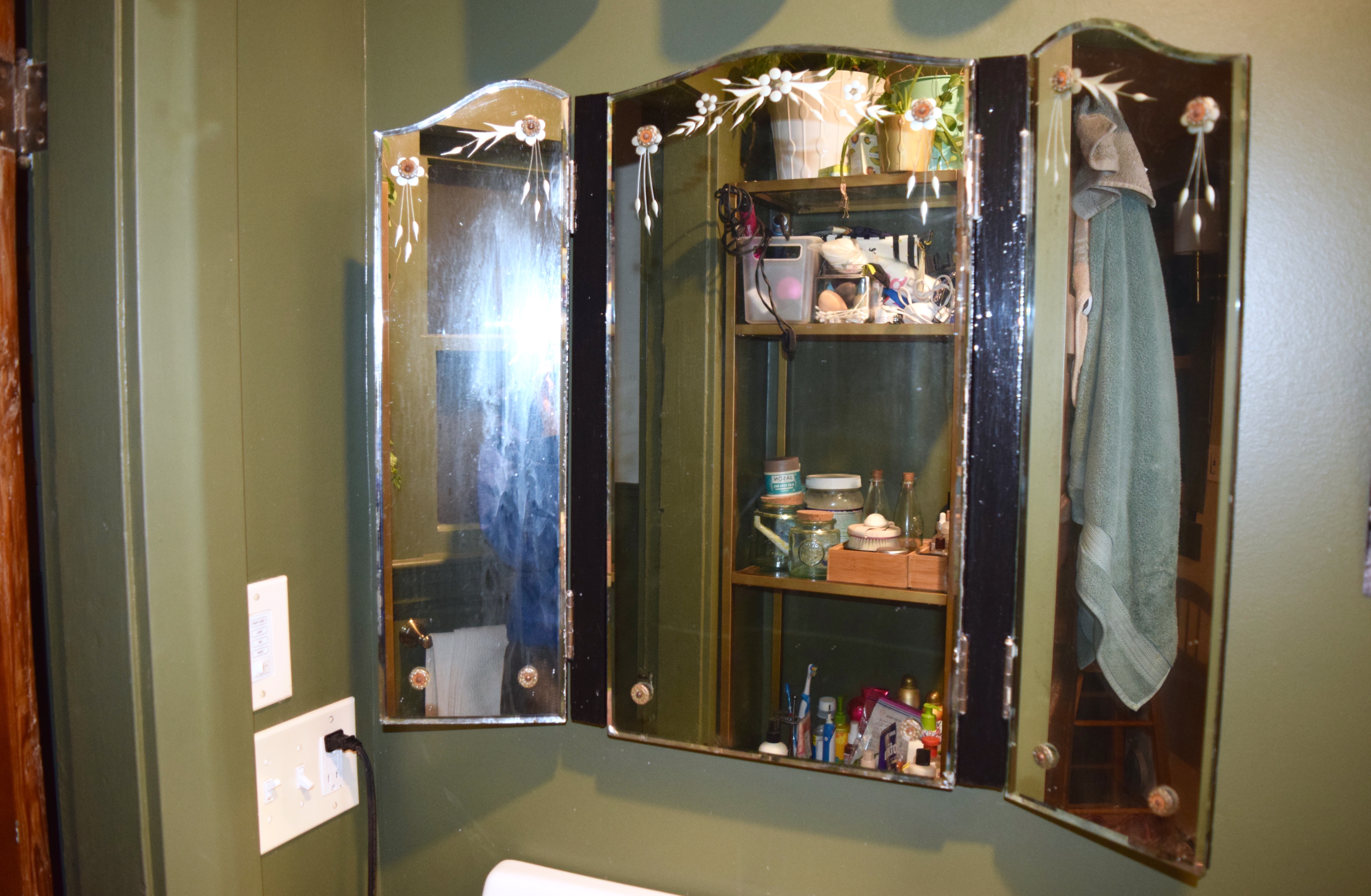 I grew up in the same house almost my entire life. It’s the only house I ever remember living in. My parents bought it when I was one and a half and they still live in that house today. I had a bedroom in the center of the house with no outside windows except for a skylight, which sounds a lot drearier than it was in reality. My room was always light and bright and I never had to close the curtains to change. My room was right next to the bathroom which had been redone in the 1950s. It was all green and black tile with floral wallpaper and an old sink. There was even some neon orange accent tile that some previous owner then painted black, but by the time I was in middle school the black paint was chipping in a few places exposing the orange. There was this great vintage mirrored medicine cabinet in that bathroom. It may have been original to the house. It had a lovely arched top and two hinged, adjustable wings which was just perfect for checking out your hair before the middle school dance. I loved that medicine cabinet! It was so great for looking at your hair from all the angles, because it had two hinged, mirrored sides.