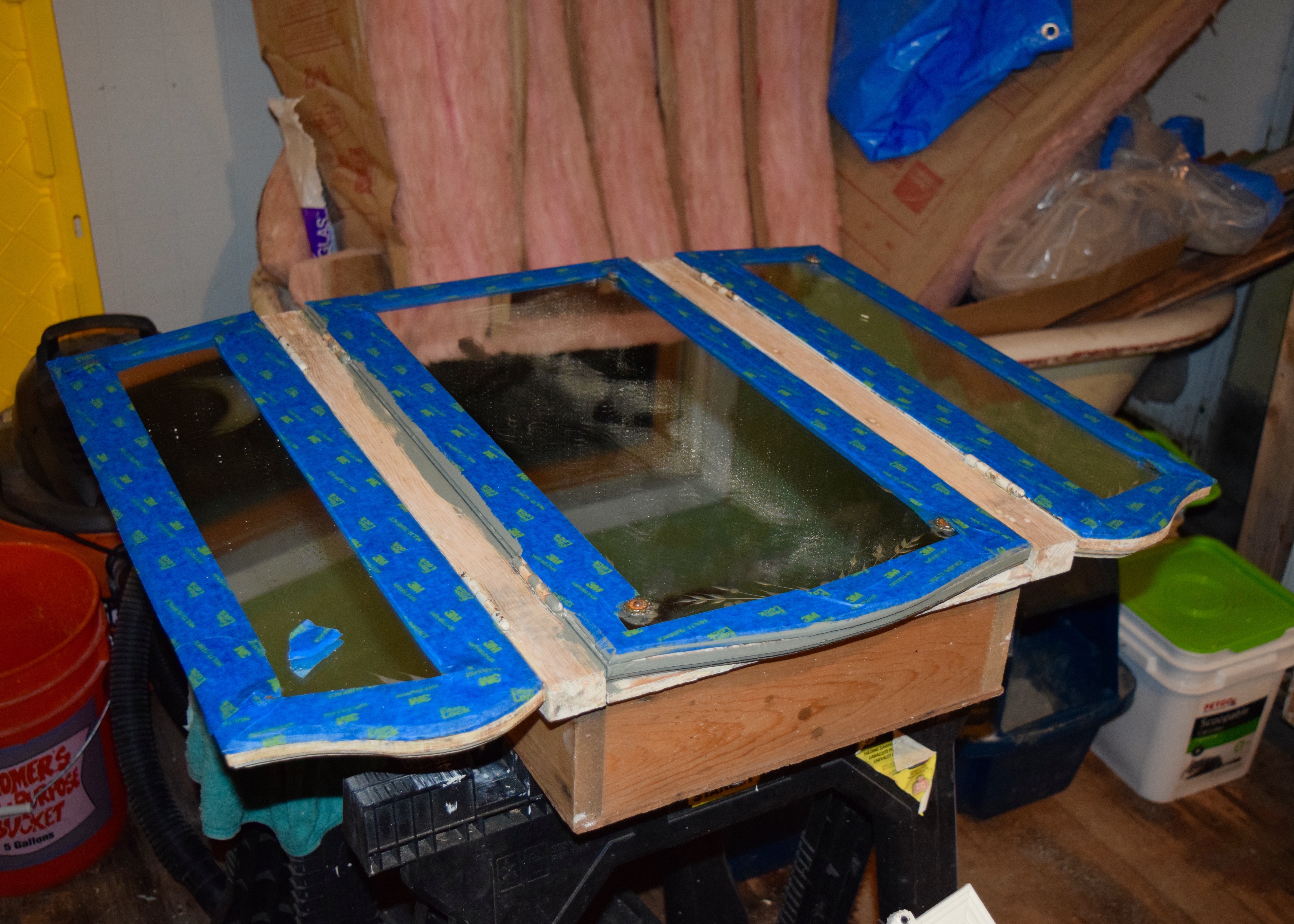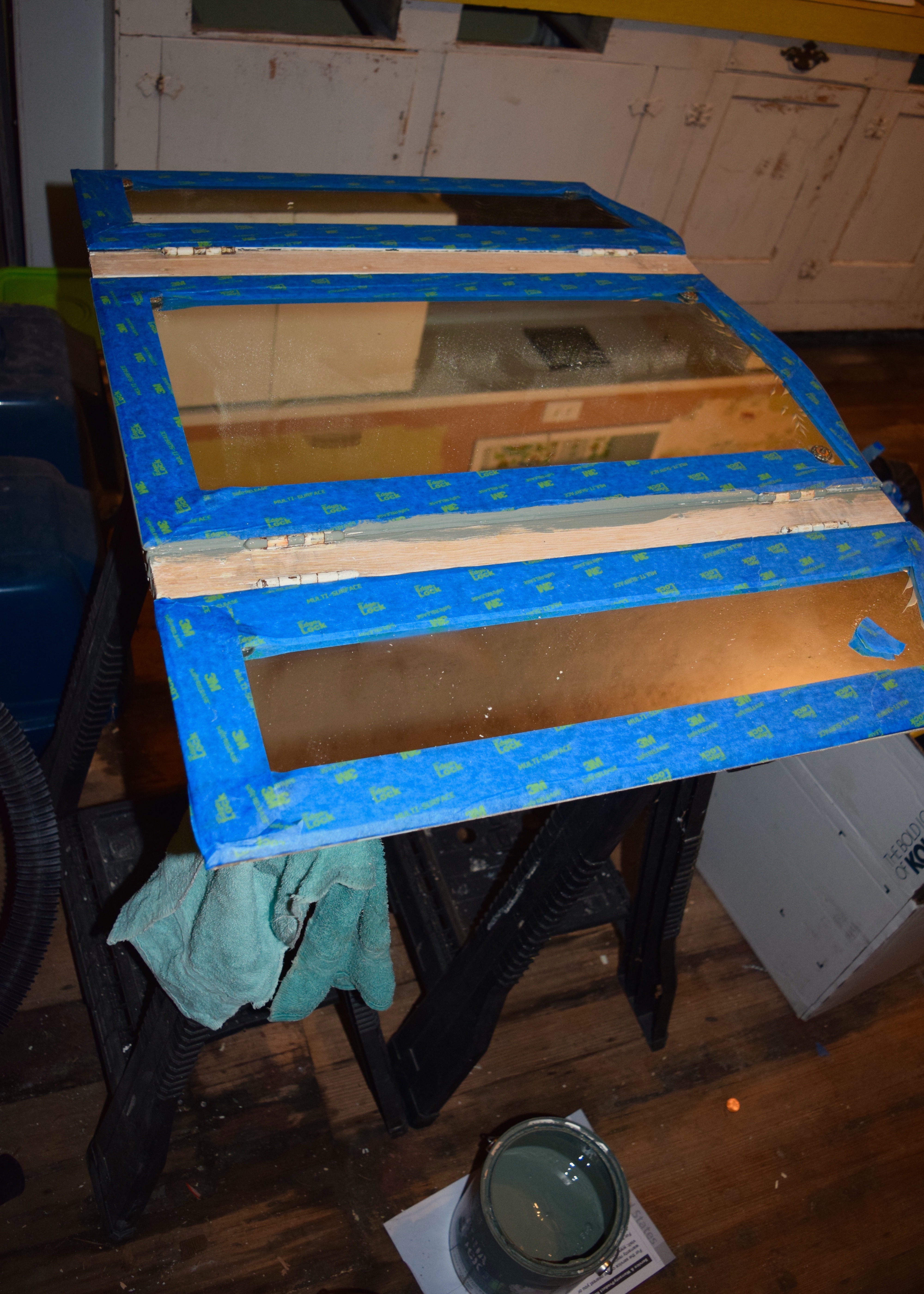 When I got back to Portland, I took the mirror and gave it a good long sanding to get off all the old flakey paint. I wore a mask and sanded outside just in case there was lead paint, even though the first couple of layers did not test positive for level. I wiped everything down before bringing it back inside… and then I left it on the floor of the kitchen for a few weeks.