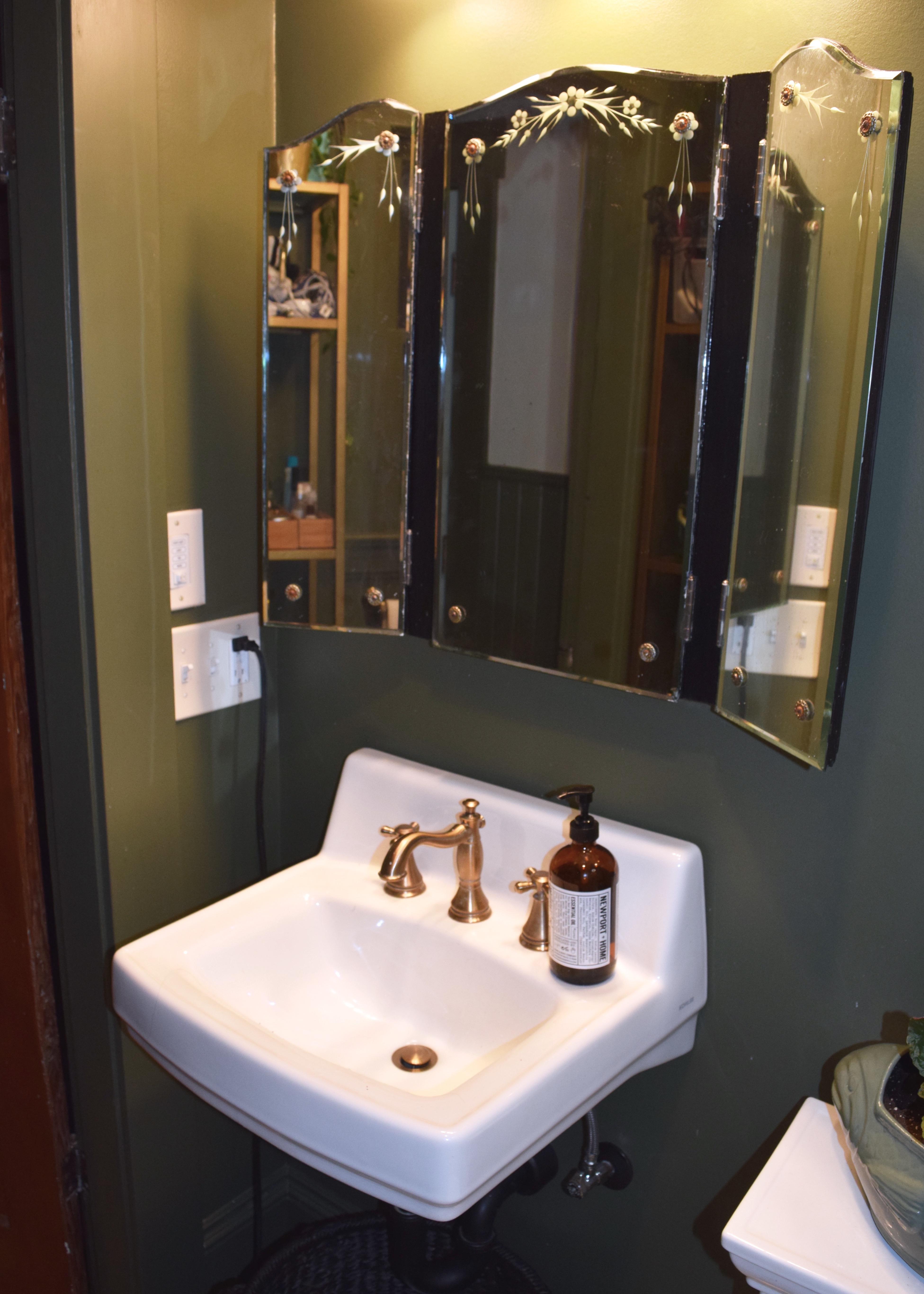 And I really do love having this piece of my childhood in my new bathroom. I had wanted to use a vintage mirrored medicine cabinet in the space from the start and this one was just perfect! Possibly more perfect than anything else I could have ever found, honestly. I really did luck out with this piece! I love the rounded detailing of the top of the cabinet and the little etched flowers. Plus the tilting sides are perfect for getting ALL THE ANGLES of your face.