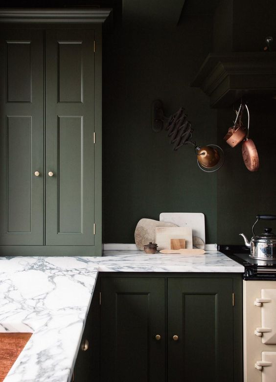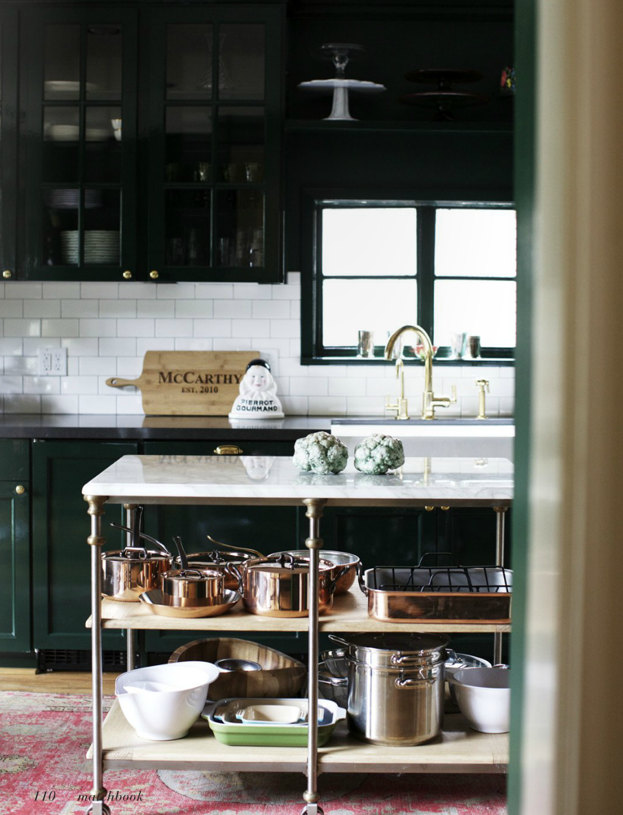 This kitchen is stunningly gorgeous and the deep green painted cabinets are calling my name. The woodwork here is a bit more formal and complex, but the hardware remains simple, which I like. I’m also a sucker for an upper cabinet that comes down to kiss a countertop. Such a simple, stunning detail. The green tied with copper and brass accents makes a strong argument for painted cabinets as well! Marble countertops would be a wondrous luxury, but one I’m unlikely to afford anytime soon.