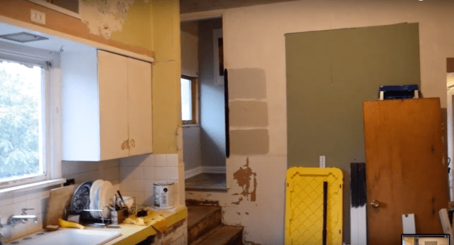 Then there’s the stairs. I have to admit, it’s been a year since the kitchen floors were finished and almost a year since the stairway was completed, but I never finished restoring the wood on the kitchen steps! I was in such a hurry to redo the floors I didn’t want to waste any more hours working on the steps that looong weekend. And then I just kept putting it off. A few weeks ago my roommate was gone for a long weekend and I planned to finish the steps while she was out, but then I was in such a rush to work on some other things and realized there was no point in stressing myself out even more trying to squeeze in refinishing stairs. So where the stairs enter the kitchen they are still half-stripped, half-sanded; and the landing still has sheet vinyl on it! I’ll get on finishing up that project…eventually. But let’s talk about what the stairs could look like in Phase II. I’d really love to open up the stairwell to the kitchen and add a wood railing instead. It would make the stairwell feel so much bigger! I could raise the ceiling above the stairs in the kitchen so the header height was more than 5’9″ and not having a tight U-turn framed with walls would make bringing furniture to the second floor much easier. For reference here’s what it looked like in February 2018, before the kitchen floors were refinished. This is a screenshot from the video I shared last week of the whole house during this crazy time! That door in the right of the picture used to be at the stairs, separating the stairway!
