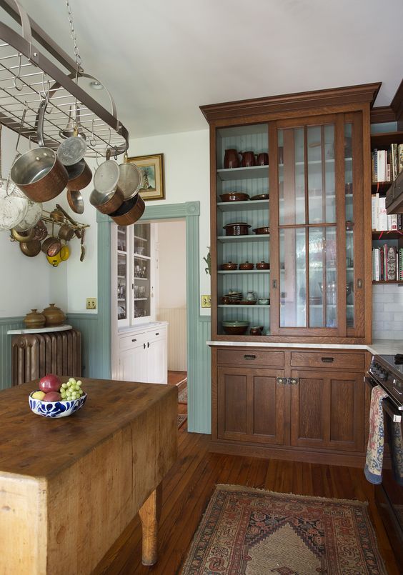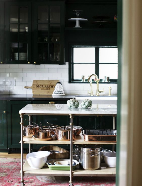Okay, let’s get into some modern inspiration now. I loooove this image below which has so many amazing take-aways! First, the trim color obviously makes me ten kinds of happy since I love a bold trim paint. Second, the pot rack over a small island is exactly the kind of smart storage solution I need in my own space. And finally, look at that hutch. I mean, god help me, that thing is gooorgeous! I love the paneling on the lower doors, the beadboard, the accent color, the fact the the glass doors are sliders. They seem to not have a ton of storage needs however, since the cabinets hold a collection of vintage ware rather than every day necessities. While we’re taking design tips here, please note the picture hanging above the door. Such a cute and creative way to make use of high ceilings! I am 100% doing that in my kitchen now and for Phase II!