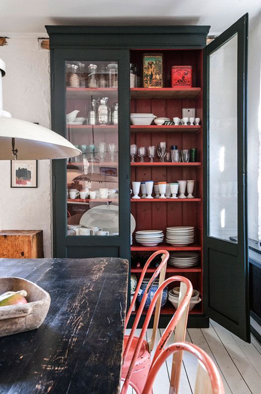 Part of Phase I will definitely be a hutch. Since I have this one I brought with me from the Duplex, it just might finally be time to paint it to work best in the new space! I could paint it black to match the cabinets and then add the same cabinet hardware as the cabinets and I could add a fun pop of color on the inside like this below. If you scroll all the way up, one of the first kitchen inspirations has a pop of color inside the hutch too. I think this is just so fun. And for those of you worried I’m painting an antique, I am definitely not. My hutch is almost definitely from the 1980s!