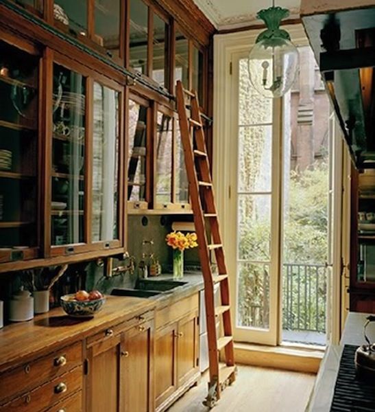 My kitchen has the 9′ ceilings and since it’s a smaller space they feel even higher. I’ve alway dreamed of a library ladder in my kitchen (or library!) and this feels so practical for upper storage too. If I could find away to make this work (and be reasonably affordable!) in my Phase II kitchen I would just about die every time I walked in and saw it! The down fall of these is that they take up a lot of space and constantly need to be shuffled around and out of the way. They work best on straightaways, like the one here in this galley style kitchen, so with my kitchen split onto three walls, it might not make sense. But! I admire it just the same and take a lot of other inspiration from this picture. Again, we see sliding glass cabinet doors on the uppers. We’ve established that I am HERE for that! But have you noticed what else repeats? Stained wood cabinets with wood countertops! Am I doing this you guys?! I really love this stylistically. Is it super practical? Probably not. Will I ever be able to install crownmouling without a butt load of caulk and paint to make it look right? No… the cabinets and crown themselves would definitely need to be professionally installed. Not exactly a moment for savings there. Hmmm…