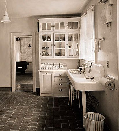 Since I ultimately want my kitchen to speak to the age and historicism of my 110 year old home, I spent a lot of time looking for images of 1920s kitchens. This one below shows so many elements I’d love to bring into my own kitchen. Can we just talk about high backed kitchen sinks? I know that inset sinks are all the rage these days and they’re FAR easier to clean than a drop in sink which sits on top of the counter, but can someone please explain to me why high-backed sinks ever went out of style? The splash guard alone is so amazing! Never worrying about water getting behind the sink and damaging the grout / caulk where your backsplash meets the counter? Count me in. I have been on the hunt for the right restored sink for a while now. I love the aspect of the built-in dish drain rack too! So cute! I will probably place mine on top of the counter rather than having exposed legs though since storage is always an issue here at Berrybrier. Another wonderful thing about this picture is it shows a glass hutch in a kitchen. Something I loved about the kitchen when I first moved to Berrybrier. I’m also very curious about what the cabinet on the left held since it looks very similar to modern day pull out trash drawers!