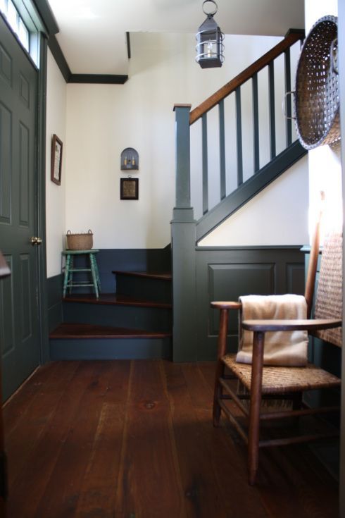 This picture is my inspiration for what the kitchen stairs could be in Phase II! I love the mix of the wood railing with the painted post and balusters. The dark risers look a bit like mine too, right? This little stairway is simple, yet stunning! I love the details of the small art pieces and open space on the walls too.
