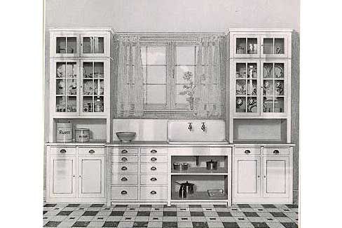 This is just a sketch below, but again, it really drives home some of the aspects of early 1900s kitchens that I want to incorporate in my future kitchen and preserve in my existing one. Here’s a high-backed sink shown placed on top of a counter with a cabinet below. I’d choose a closed lower cabinet for myself (my cats seem to think it’s such a fun game to play in open cabinetry), but the almost-symmetry here interests me. Again, the glass hutch makes an appearance, here as a duo framing the window. I love it!