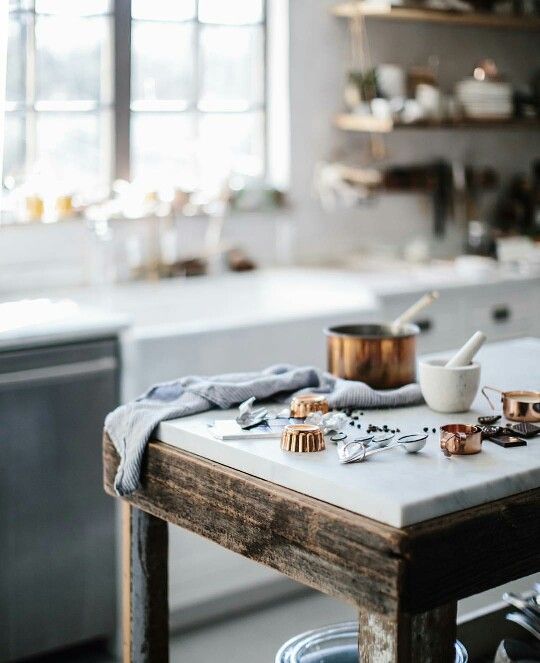 My kitchen is not quite big enough to have a proper island, and I don’t love the modern concepts of islands in every kitchen. Older kitchens had freestanding tables, sometimes counter-height, but often with chairs. In my space, however, I don’t have space for a true dining table. But an old wooden counter-height table with a few stools that could be tucked underneath would be a great place for guests to perch while I cook. Considering the current favored place to sit is the stairs, this would be a nice upgrade! This kitchen appears to be a bit wider than mine, but has a similar layout with a skinny table through the middle. I love how this table ties this recently finished kitchen in and makes it feel like part to the past. It’s clearly a well-loved antique and is the showstopper of the whole space. Maybe I can find something like this for my own?! It would be an amazing touch. Or is it possible to build something with this much character using reclaimed woods?