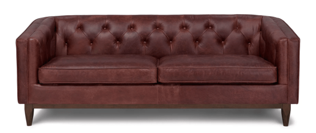 Oh fabrics – a million options – or do you want leather? Leather is going to be a cool material to the touch, it tends to be a bit firmer and often is applied to tufted options. Leather is cozy in many ways, but also can be cold in winter months. Consider the summer too, as sweaty thighs on leather cushions are not ideal in un-air-conditioned spaces. Leather is also a bit slippery, so if you’re looking for a curl your feet up on the sofa setting, make sure your sofa is quite deep as the slidey leather may make it feel less so.
