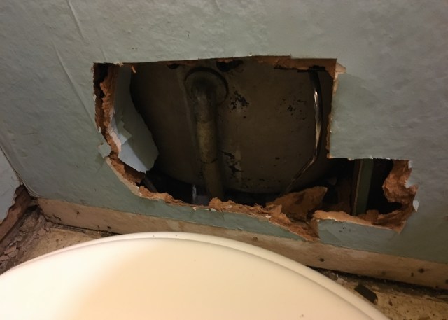 I made the hole a LOOOOT bigger to cut the pipes and then I left it like this for four months. And yes, I did still use this bathroom every single day to brush my teeth and get ready for my 9-5 job. Go me!