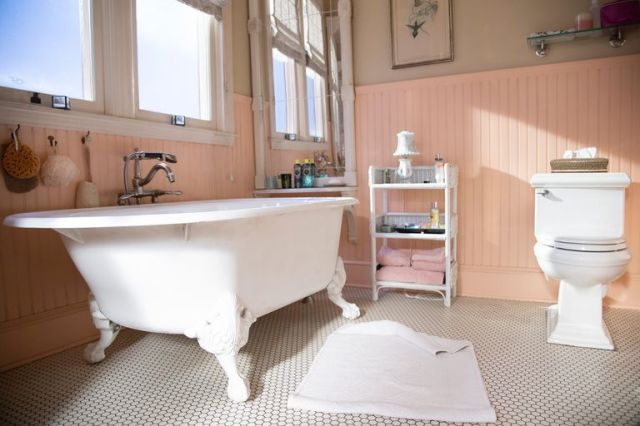 I want the new bathroom to be packed with the storage I need, while still feeling light and open. It’s important that the space feel like it belongs to the rest of the house and isn’t a dated addition. Overall, I want the room to be light-filled and bright, with just the palest of calamine lotion pink on the walls and ceiling. After much debate, I landed on Benjamin Moore’s Pink Beach as the perfect barely pink and not beige color. The soft pink tone with be juxtaposed with a more dynamic black and white floor, a black faucet, and black accessories. The chrome accessories and lighting should thus fade nicely into the background. And of course, I’ll fill the shelves with houseplants!