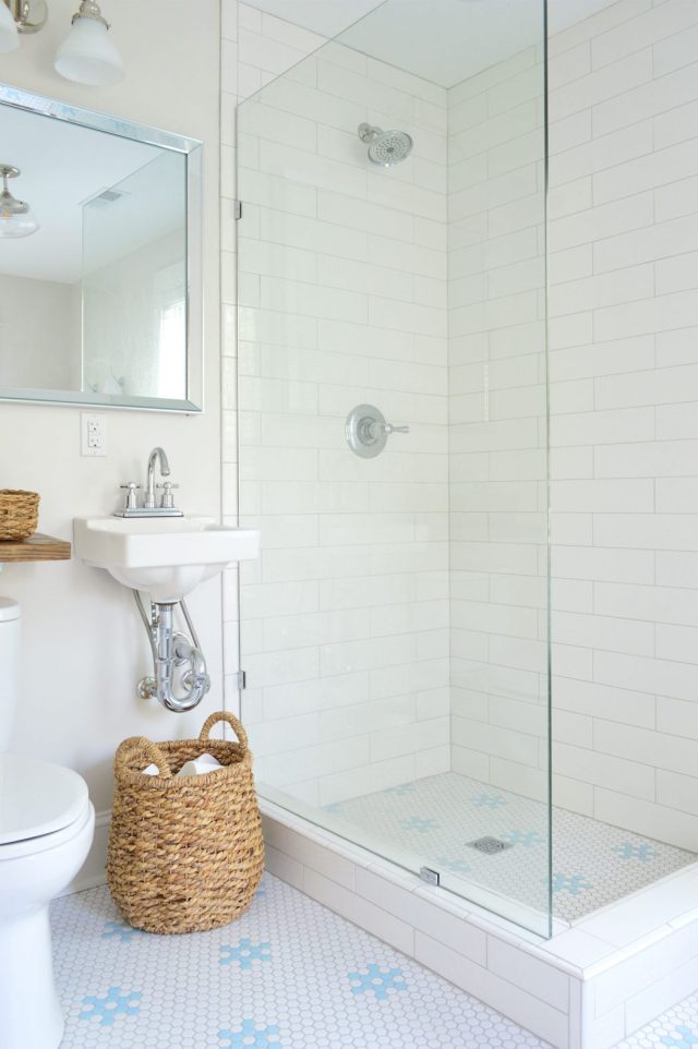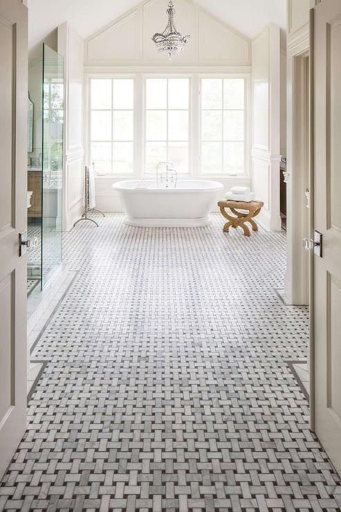 For the floor, I didn’t need much tile at all since it was such a tiny space! My parents had some left over tile from their bathroom renovation and offered it up. A marble mosaic for free? Yes, please! It’s a pretty two tone basket weave like this here. They also gave me a few leftover 12×12 marble tiles from the same renovation which I am planning to try to use as transition strip into the bedroom. The tile is very similar to what’s in this shot below, but I’m planning on using a black grout instead which will give it more contrast. Now if only my bathroom could expand to be this big too!