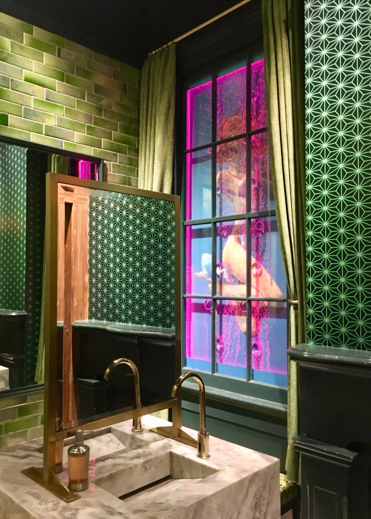 And the bathrooms were absolutely gorgeous and oh so fun! Wallpaper! Dark green trim! Neon, water bubble art! Green subway tile! Brass! Marble! YES, PLEASE! This is what I want to see more of in commercial design! I find spaces like this to be like dessert for the eyeballs, so inspiring and exciting. The baseboards in this bathroom were like 20″ high. Yum.