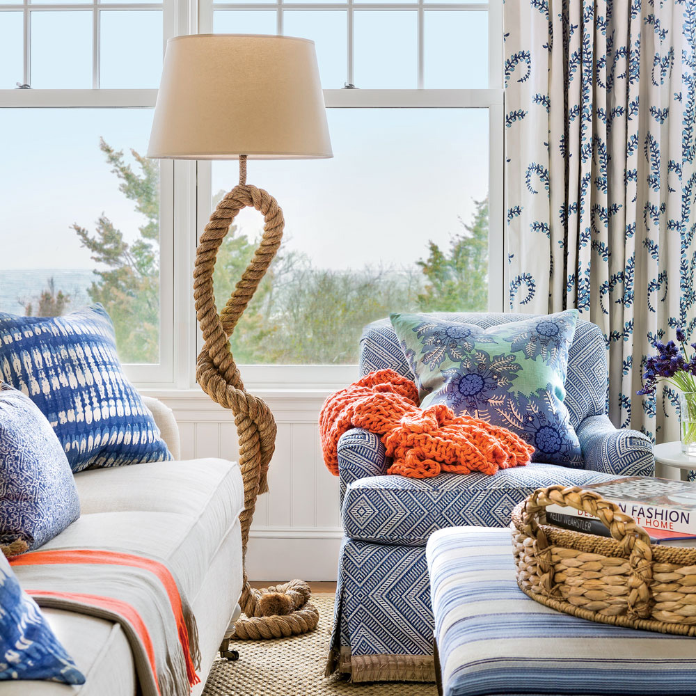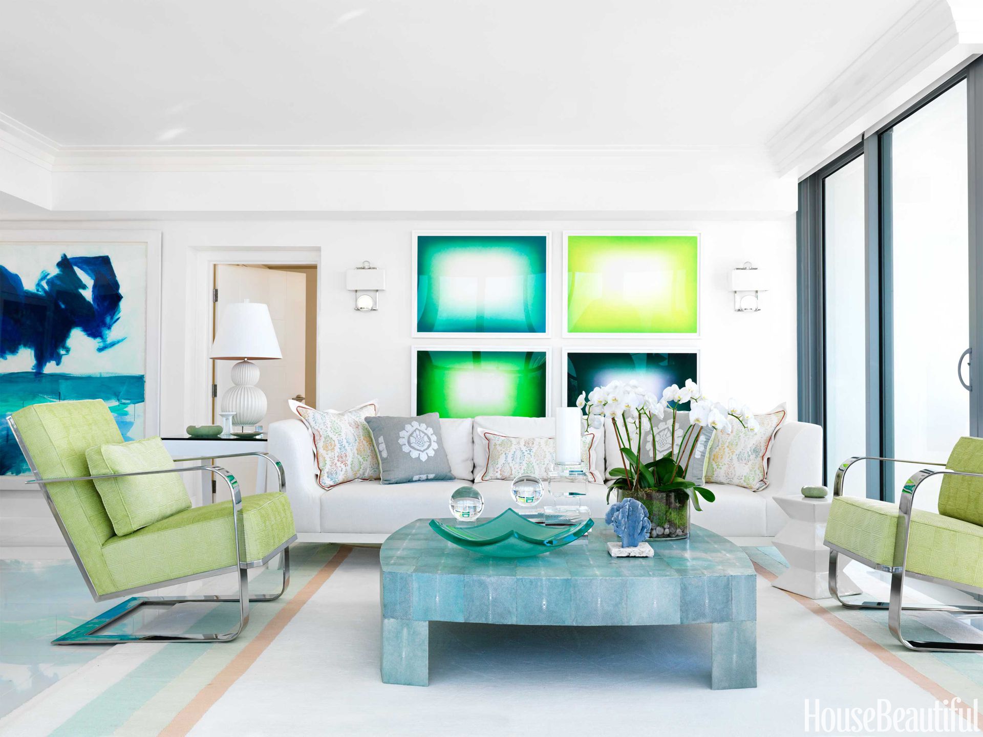 Coastal is tricky because you can realistically take any of the other styles I’ve mentioned and clean up the styling, add more white and blue, and make it a coastal style. Coastal style should stay where it’s intended: on the coast. If you’re more than 50 miles from the ocean, stay away from this design aesthetic, even in the bathrooms! Traditional coastal design incorporates lots of woven textures, jute, sisal, rope, lots of stripes, and the occasional nautical accessory. It doesn’t have to be all blue and white though, envision a pink Florida living room inspired by the classic neon flamingo! More contemporary coastal design (like this image below, which I love!) is all about chrome, mirrors, acrylic, and glass. It can still be plenty colorful, but it tends to contain more clean lined furniture and limit it’s color palette.