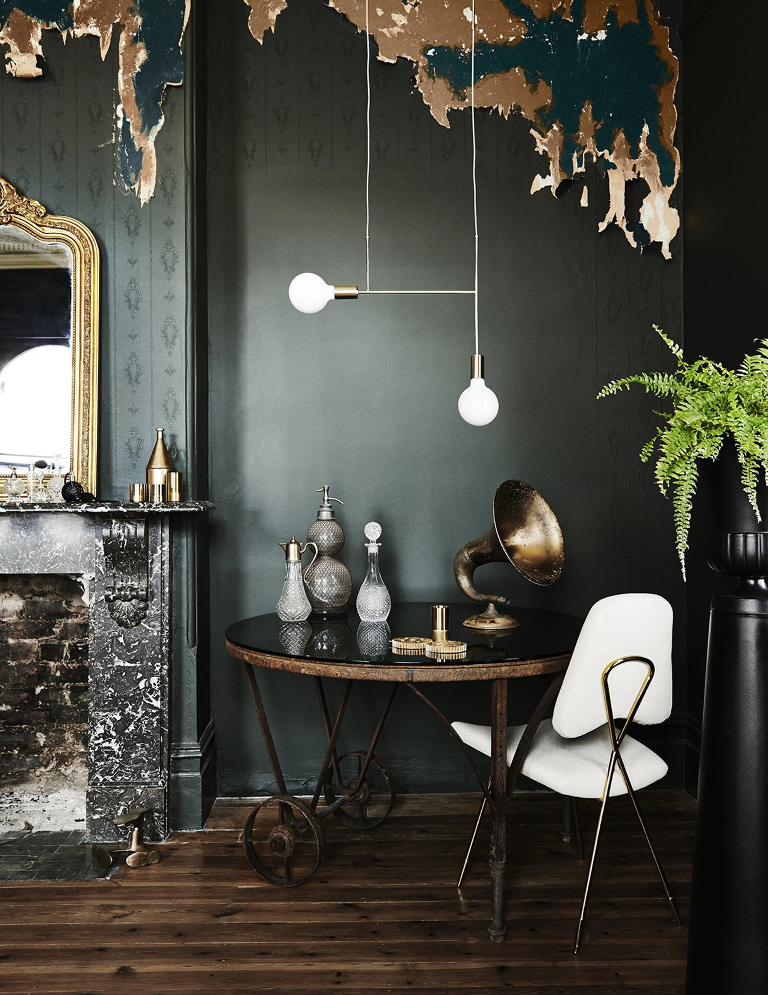 Emily Henderson and her team first called out the rise of this design style just last year and I love it almost as much as I love traditional design. This would be my style if I was a little bit cooler and a little bit more modern. Alas, I am what I am, so I’ll just have to drool over this in my spare time. This style is epitomized by high drama, deep colors, and lots of contrast. To create the Victorian base, you need mouldings, LOTS of mouldings! Frequently you see this where the mouldings and walls are all painted the same saturated hue (just like I did in my bathroom!). The traditional backdrop of elaborate mouldings is then contrasted with contemporary furniture, often in fun jewel tones. You see lots of mixed metallics, bold florals, high contrasting tones, fringe, black accents, statement lighting, and tufted furniture in this style.