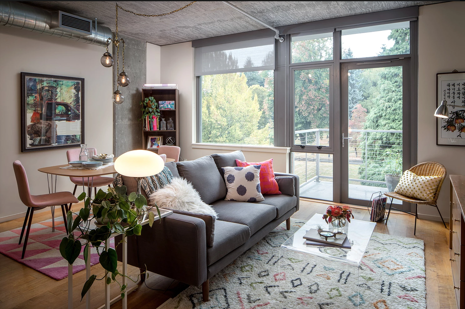 My friend Emma, who founded a design firm specializing in apartment design here in Portland, really knows how to rock this style. Mid Century Millennial — as I like to call it — is hot right now. This is a style a lot of young people are pulling together in their homes. As Mid Century Modern furniture came out of their grandparents’ homes and was rejected by their parents, Millennials have started a huge push to pick up these pieces from various thrift shops. Soon, so many people were craving the Mid Century look, it started being created again and sold at popular stores like West Elm. This style is very trendy, but I think we will continue to see it reign popular amongst young people for the next 5-10 years. Mid Century Millennial style usually incorporates several Mid Century Modern accents like peg legs, saturated colors, knock-off Eames dining chairs, hairpin legs, or globe lighting. It then mixes in more contemporary items like colorful shag rugs, acrylic tables, playful art, and a whole lot of plants. This style hollers, “FUN! YOUNG! PLAYFUL!” and the best part is: these rooms never fail to put a smile on your face!