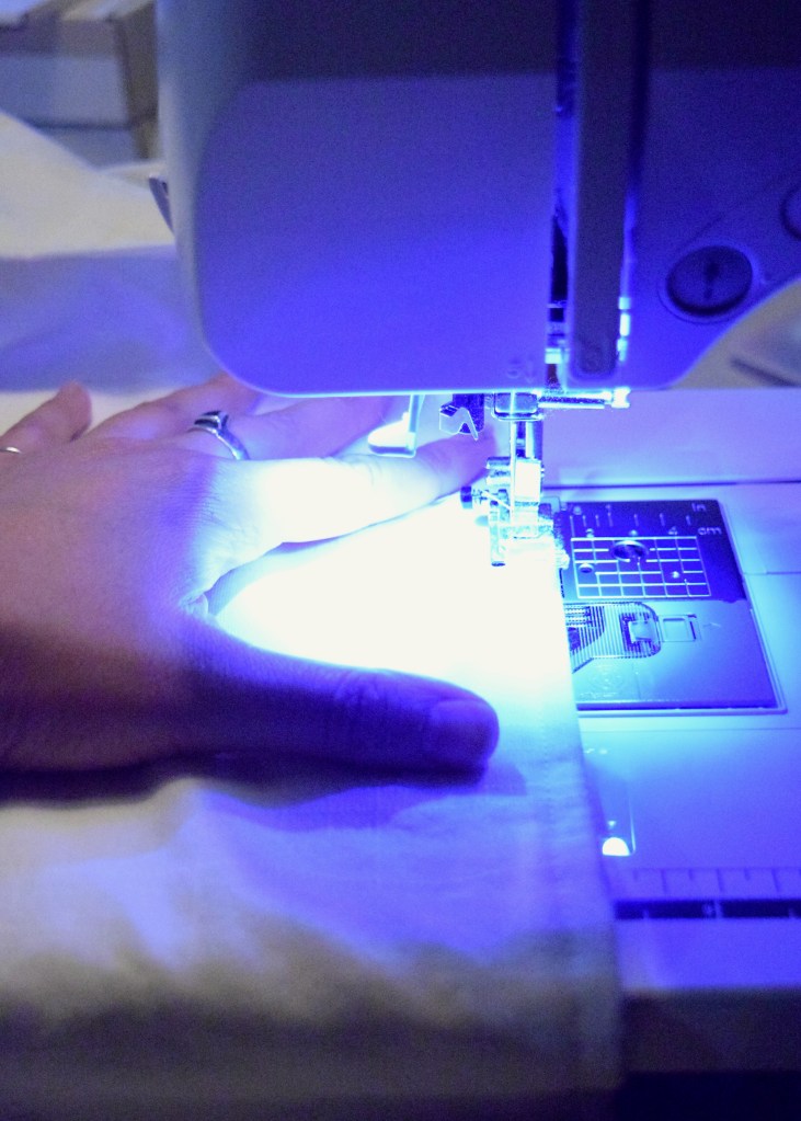 I selected the most basic straight stitch on my machine and went with the default stitch length. I then lined up my curtain panel and sewed along the curtain on all four sides of my hem, about 1/2″ from the edge. It only took about 20-30 mins to sew along the hem!