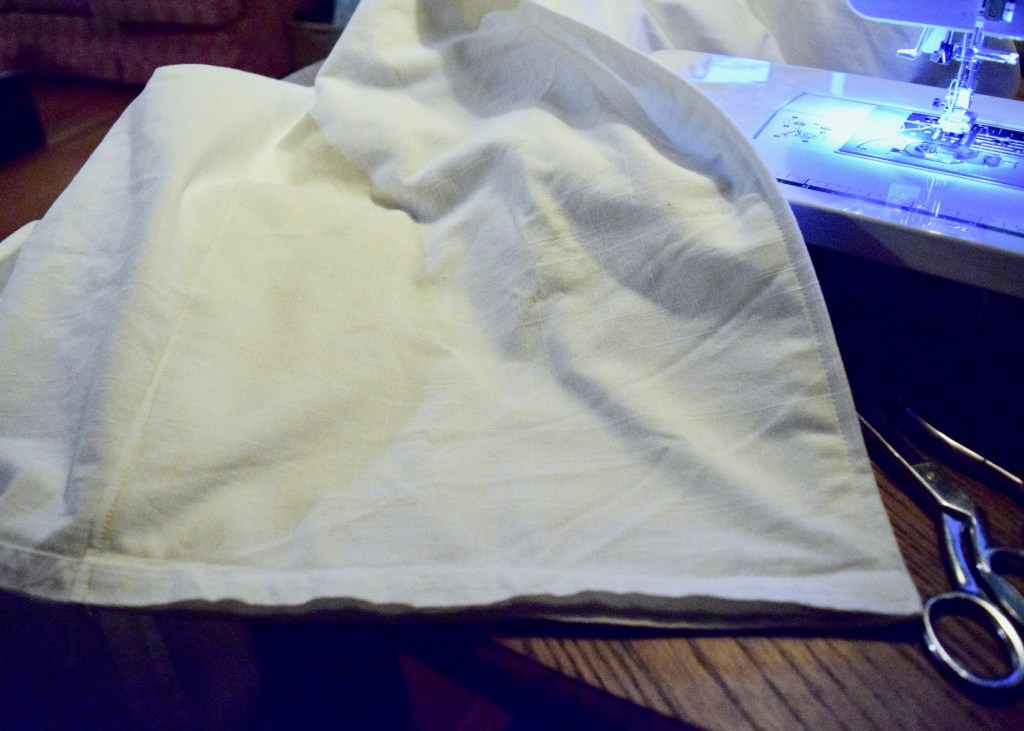 Finally it was time to sew! My curtains were solid white, so it was easy to find a matching thread. If you have multi-colored curtains you will want to figure out the dominant color and pick a thread to match that. Alternatively, you could have fun with a contrasting stitch color! I’m no sewing expert though and didn’t want to call attention to what I was sure would not be perfectly straight stitches! White blended in and was almost unnoticeable.