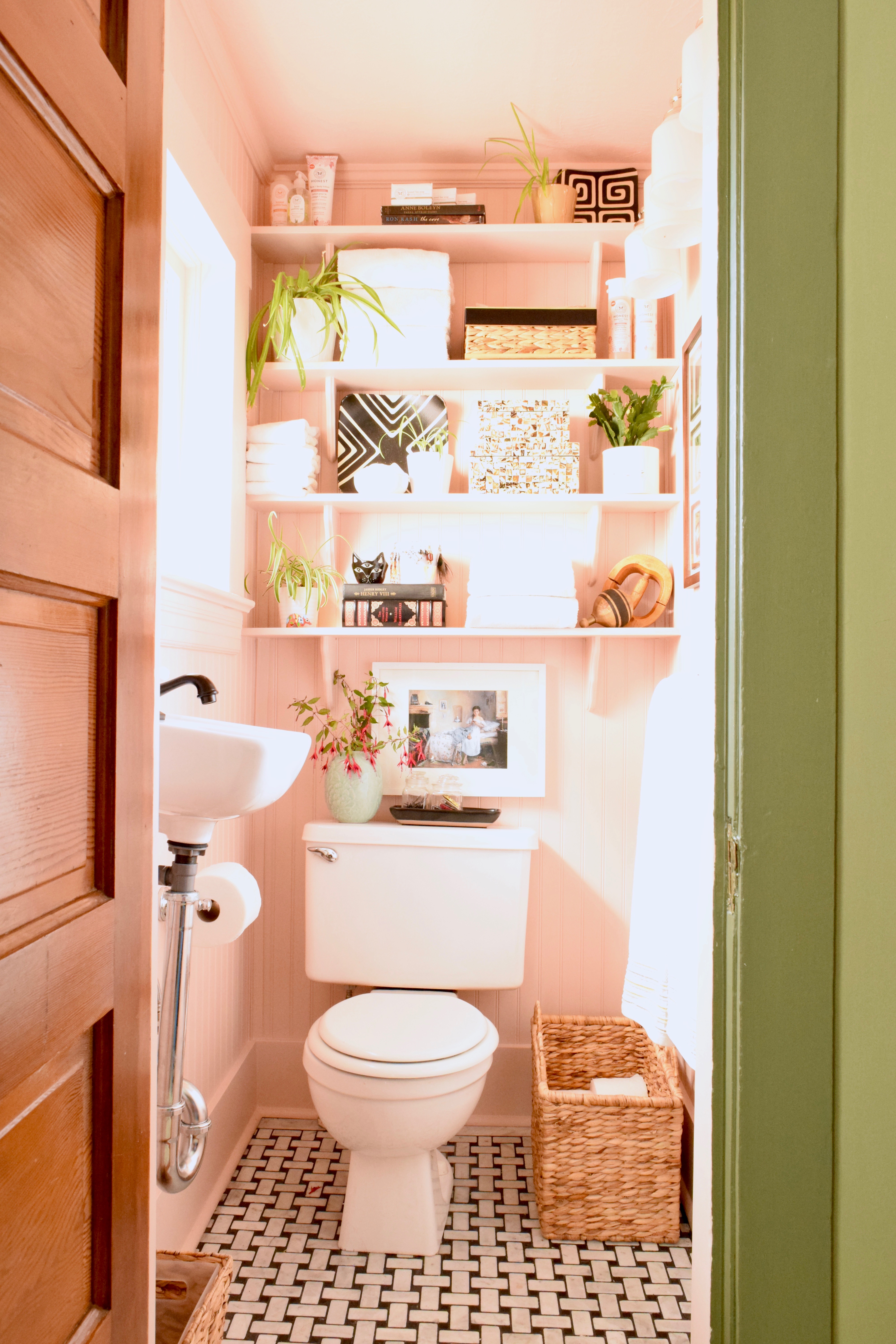 The color of the bathroom, Pink Beach is so light compared to the darker bedroom, but one of the reasons why it feels right in the overall house palette is because it ties into the dining room’s New London Burgundy. These paint colors might not be near each other at all, but they still speak to each other in the same color family.