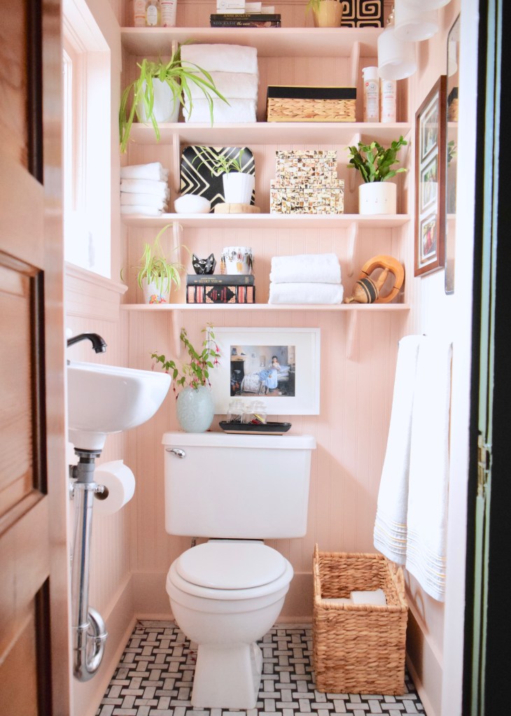 This is a great trick! If you love the fabric of your dress or have a favorite lamp, use that object to pull a paint color! For my tiny Master Bathroom renovation I pulled the paint color from a tiny accent on the capiz shell covered boxes on the second shelf. Can you see it there below?