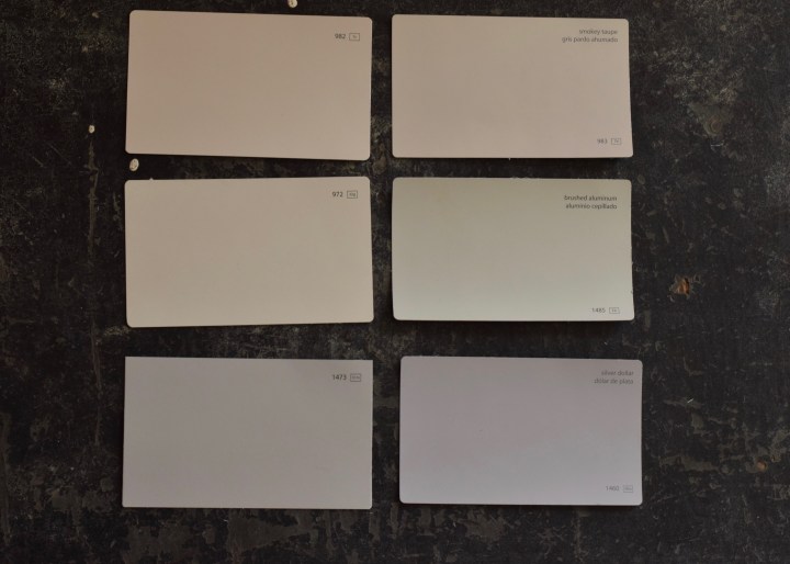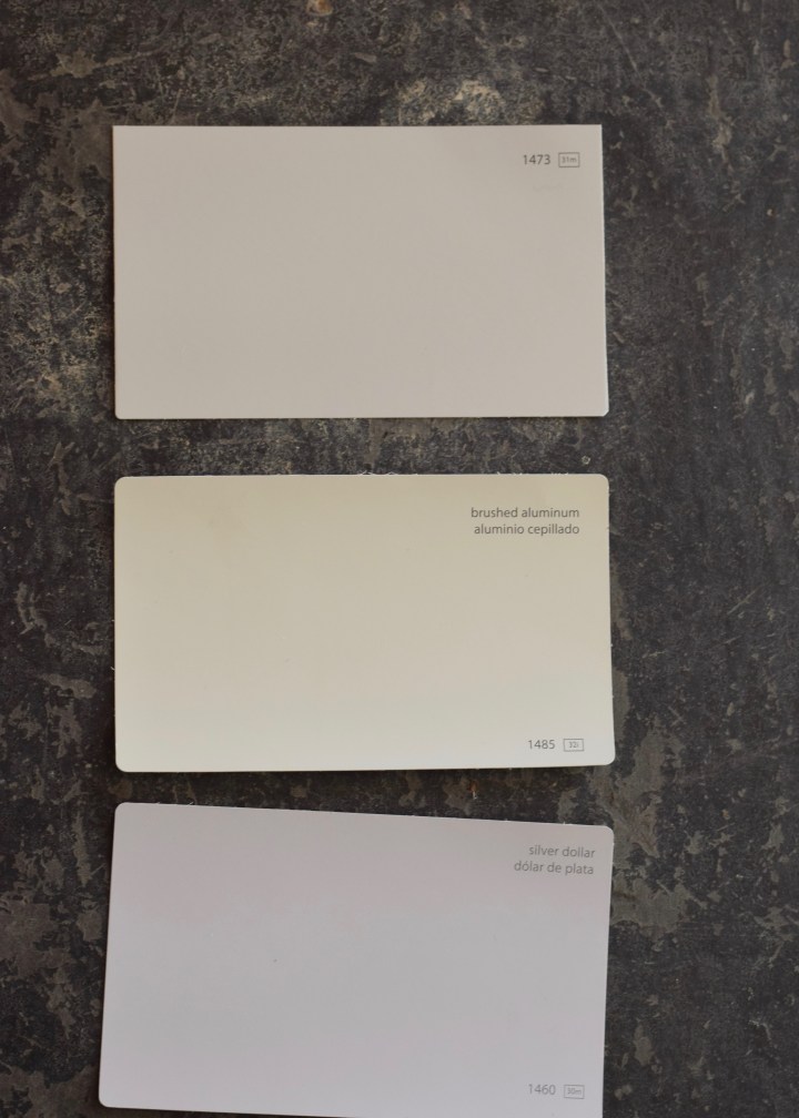 Now if I remove the top and bottom paint and switch in two paints that are cooler greys, you can see how despite the green undertone, Brushed Aluminum (in the middle again below) looks much warmer.